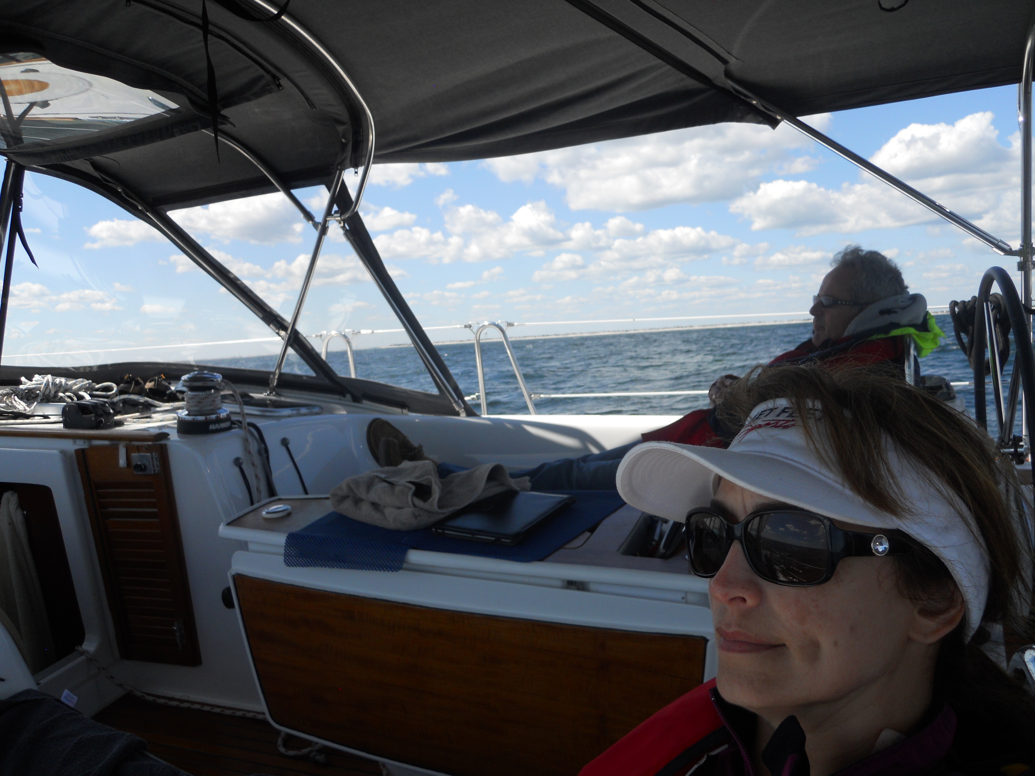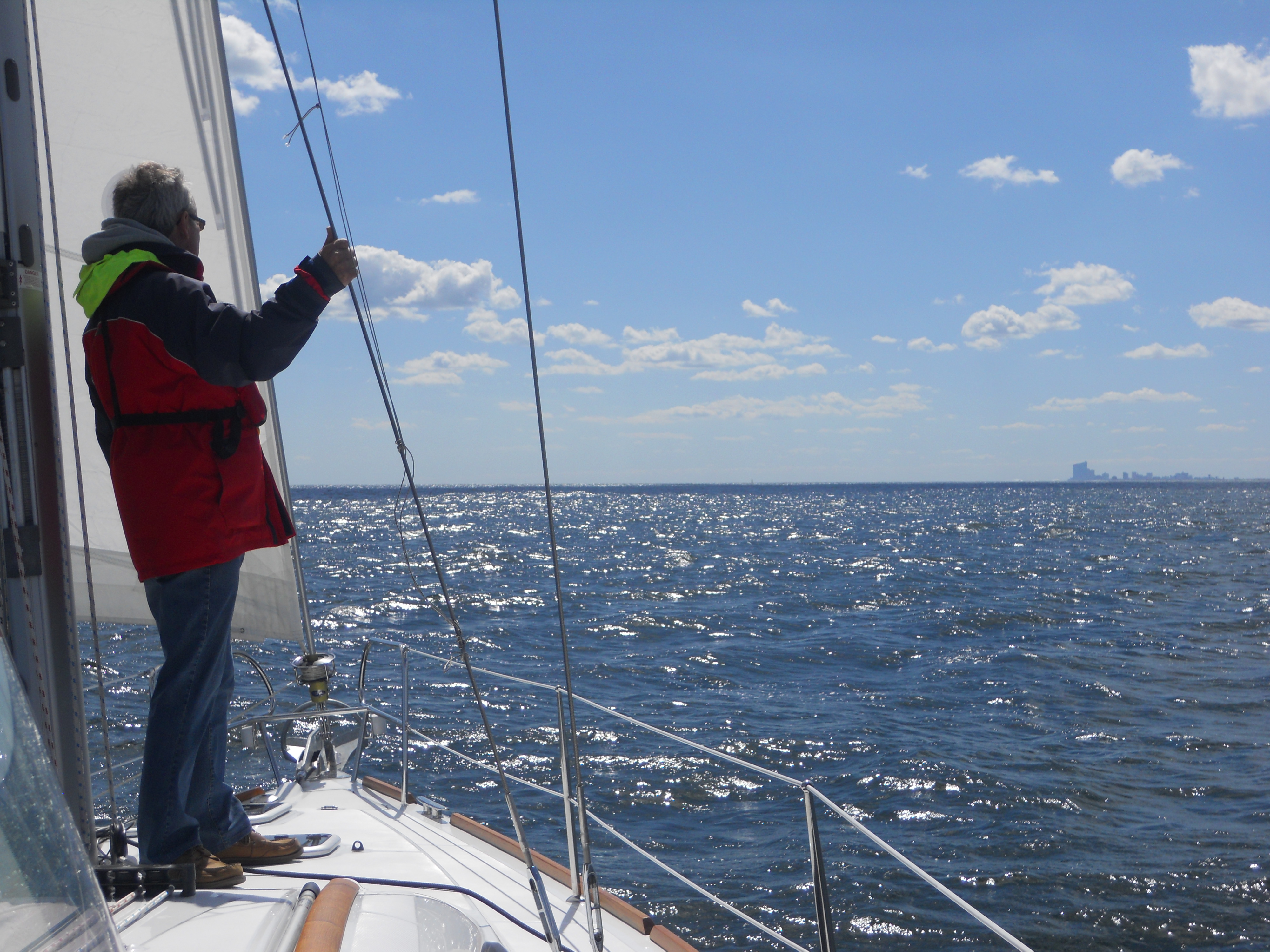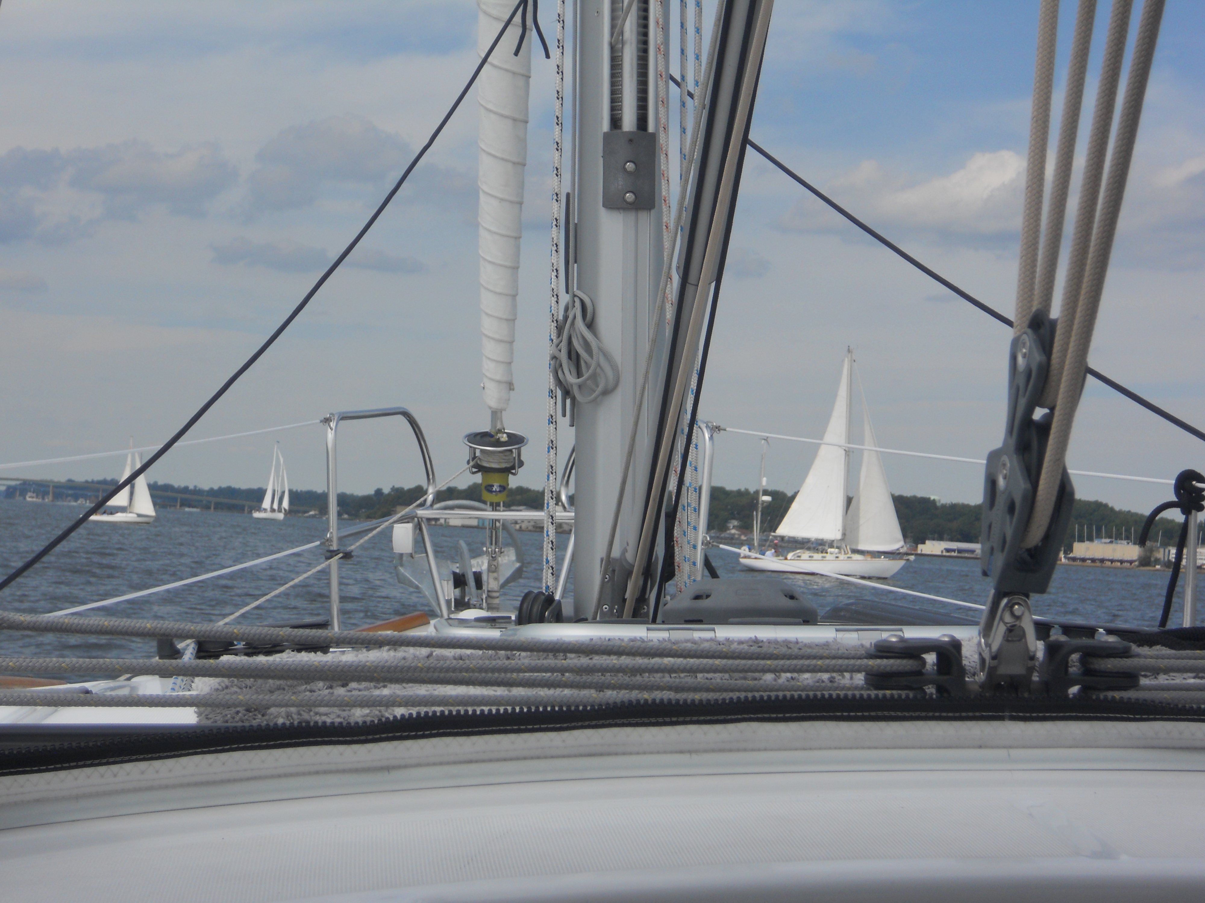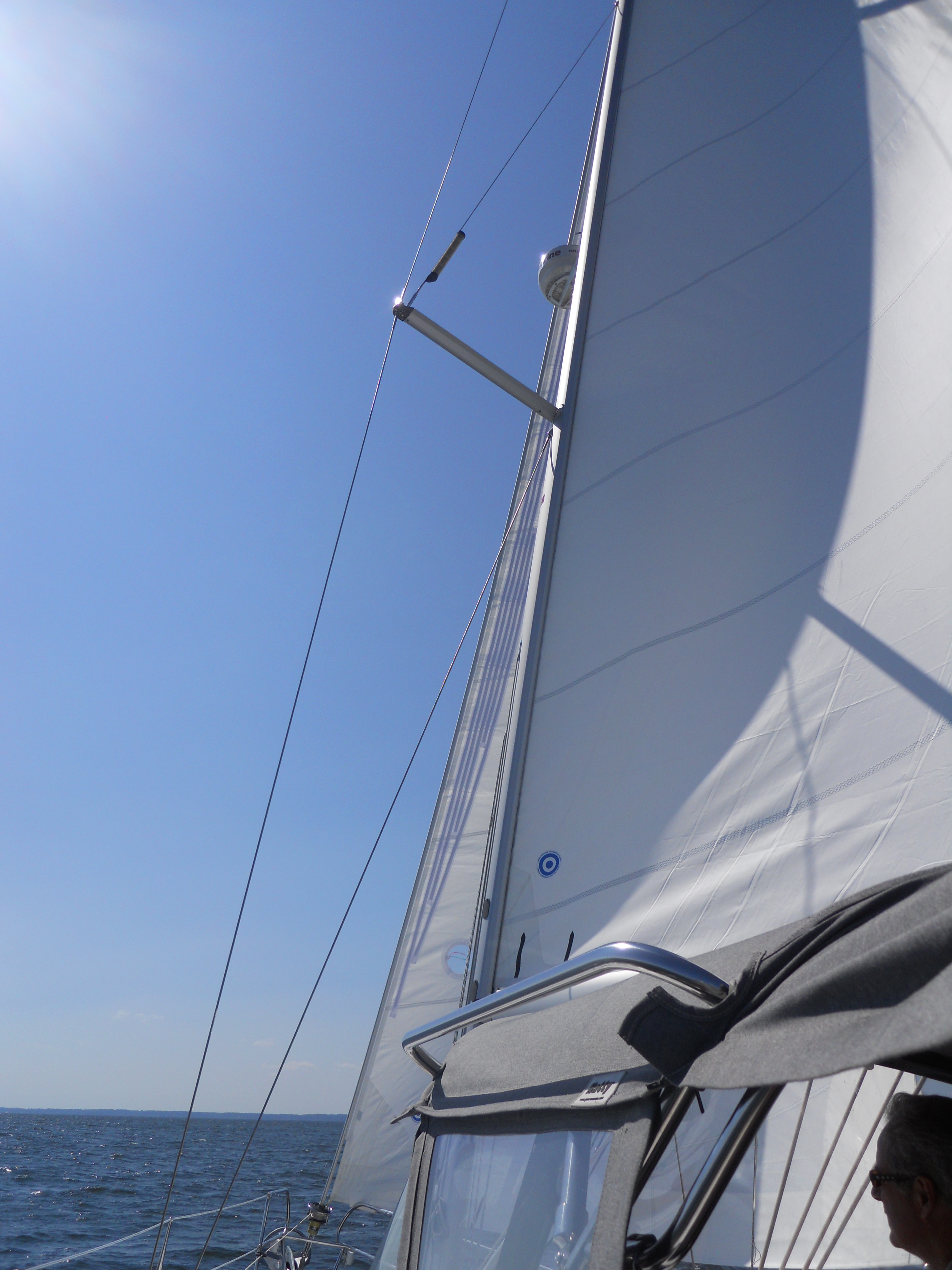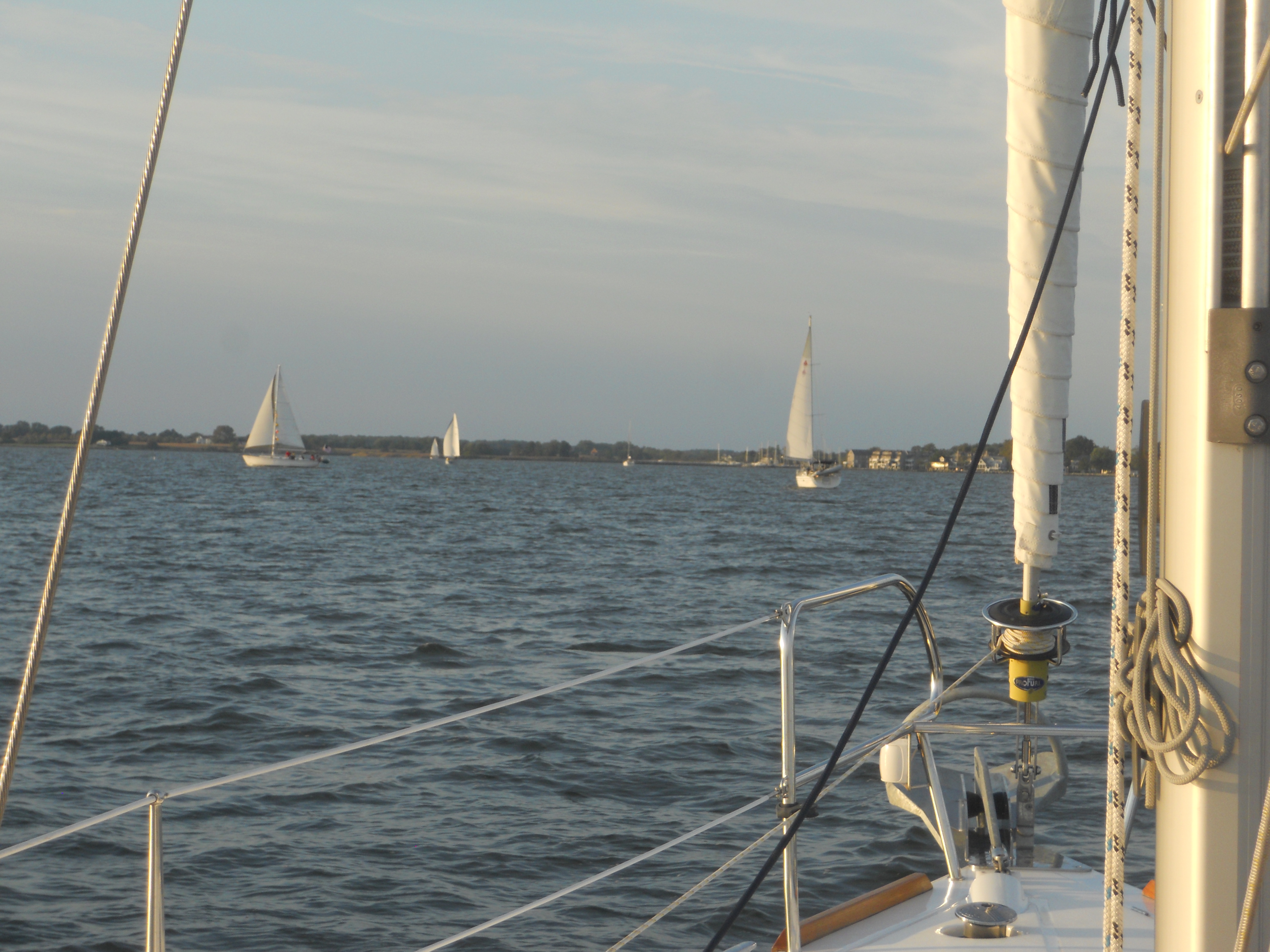 We hit the water just shortly after 7AM. We stay in Solomons Island Saturday not only because it was a really nice port, but also because we wanted to wait for the wind to change from the south (on our nose) to the north (at our back) which was forecast (correctly – thankfully). Also forecast were 2 – 4 ft waves, which seem to be more on the 4ft side. Some of the crew feel a bit sea sick and we struggle to keep the boom from banging round with the waves.