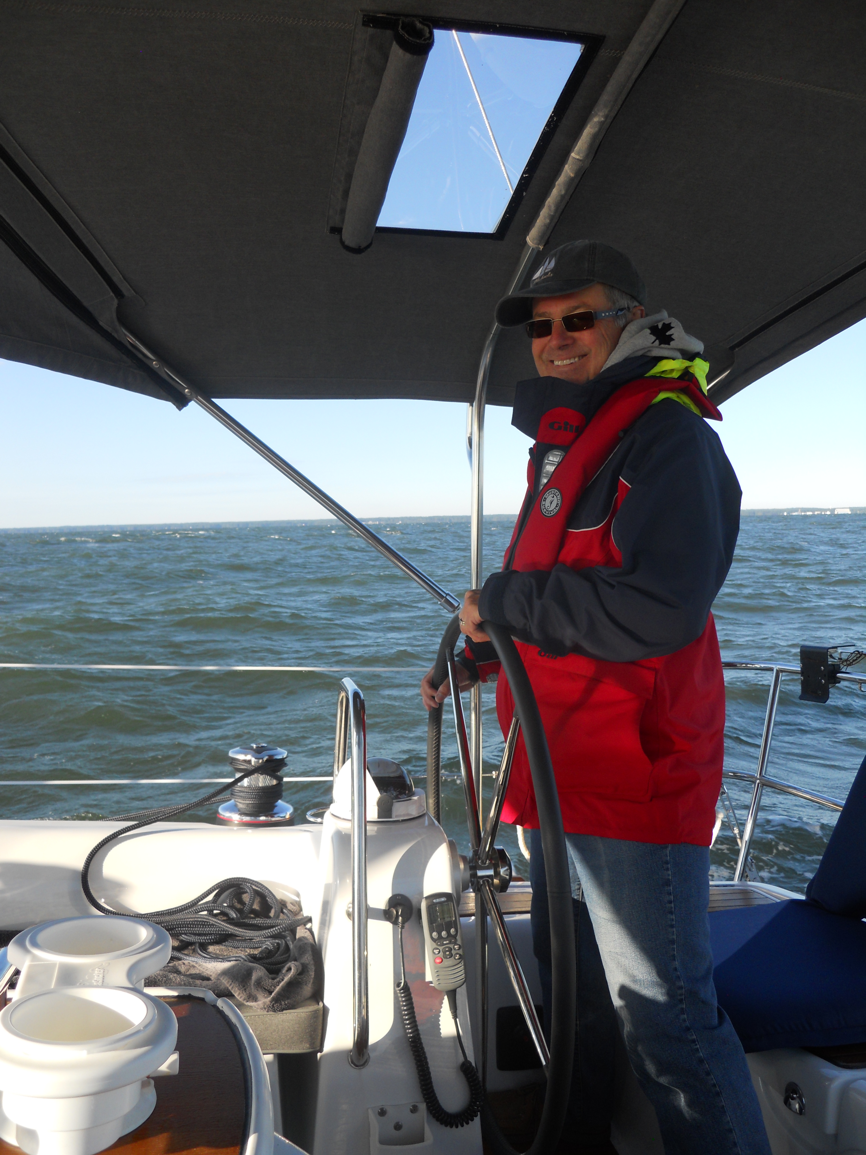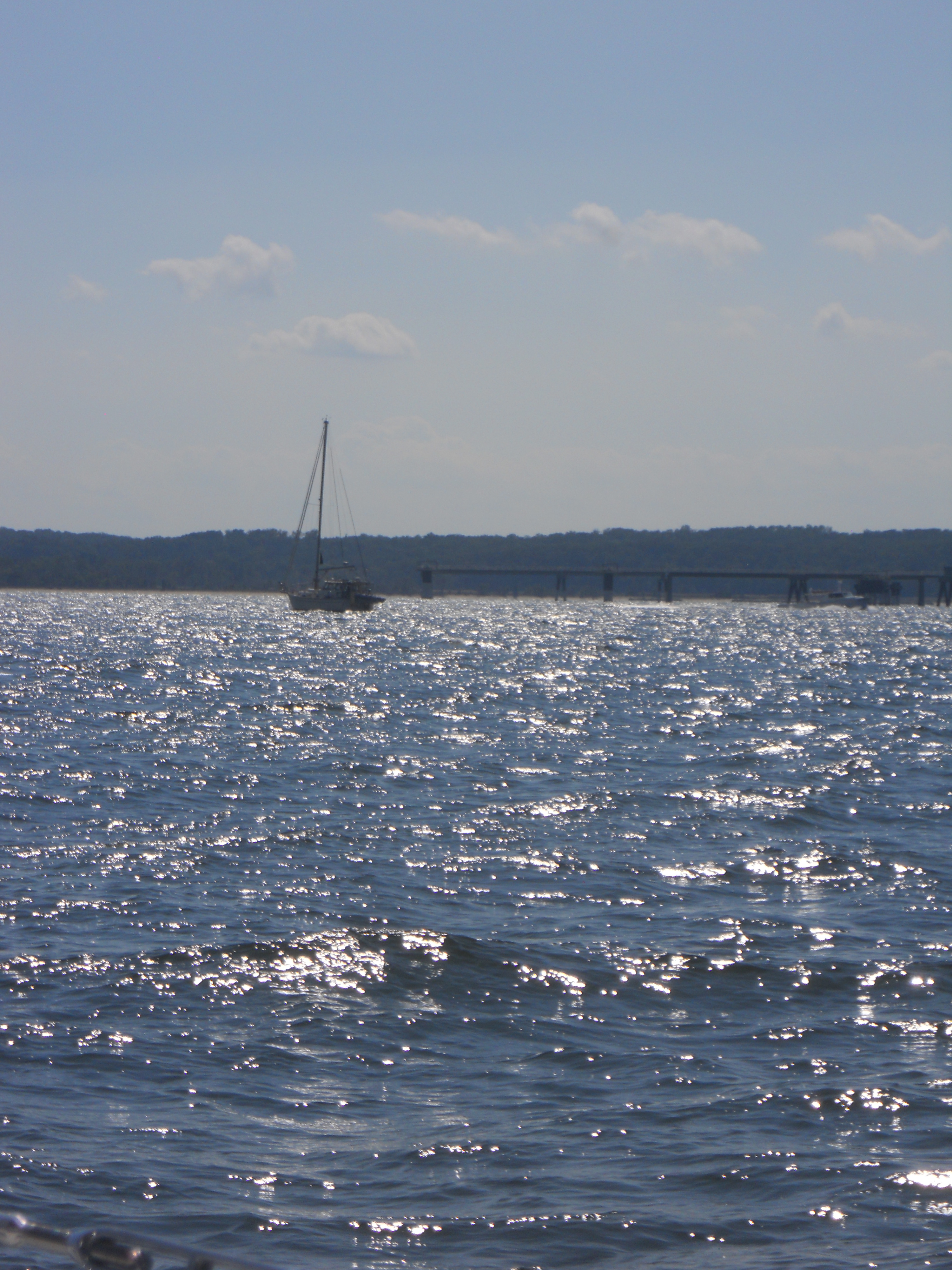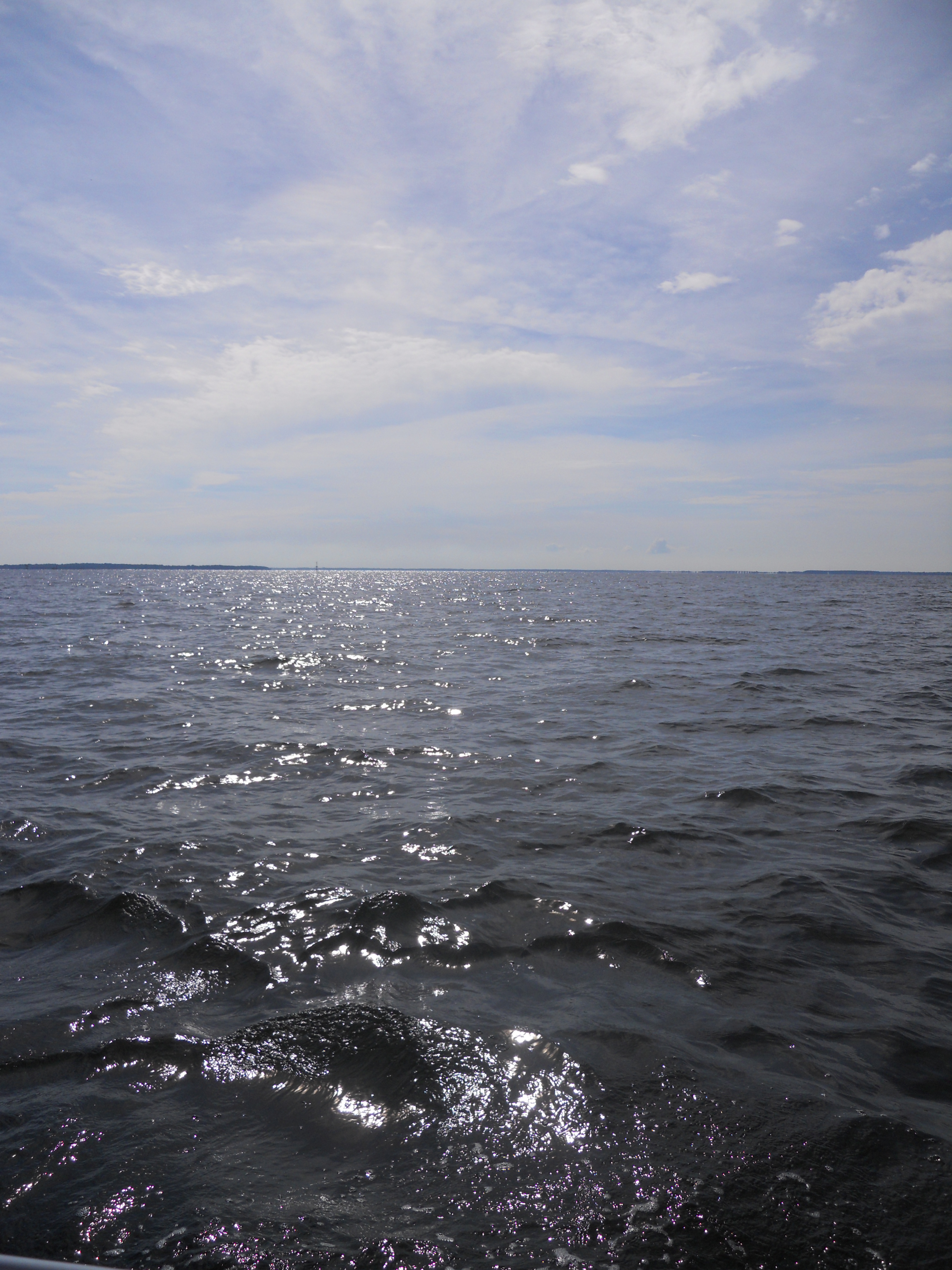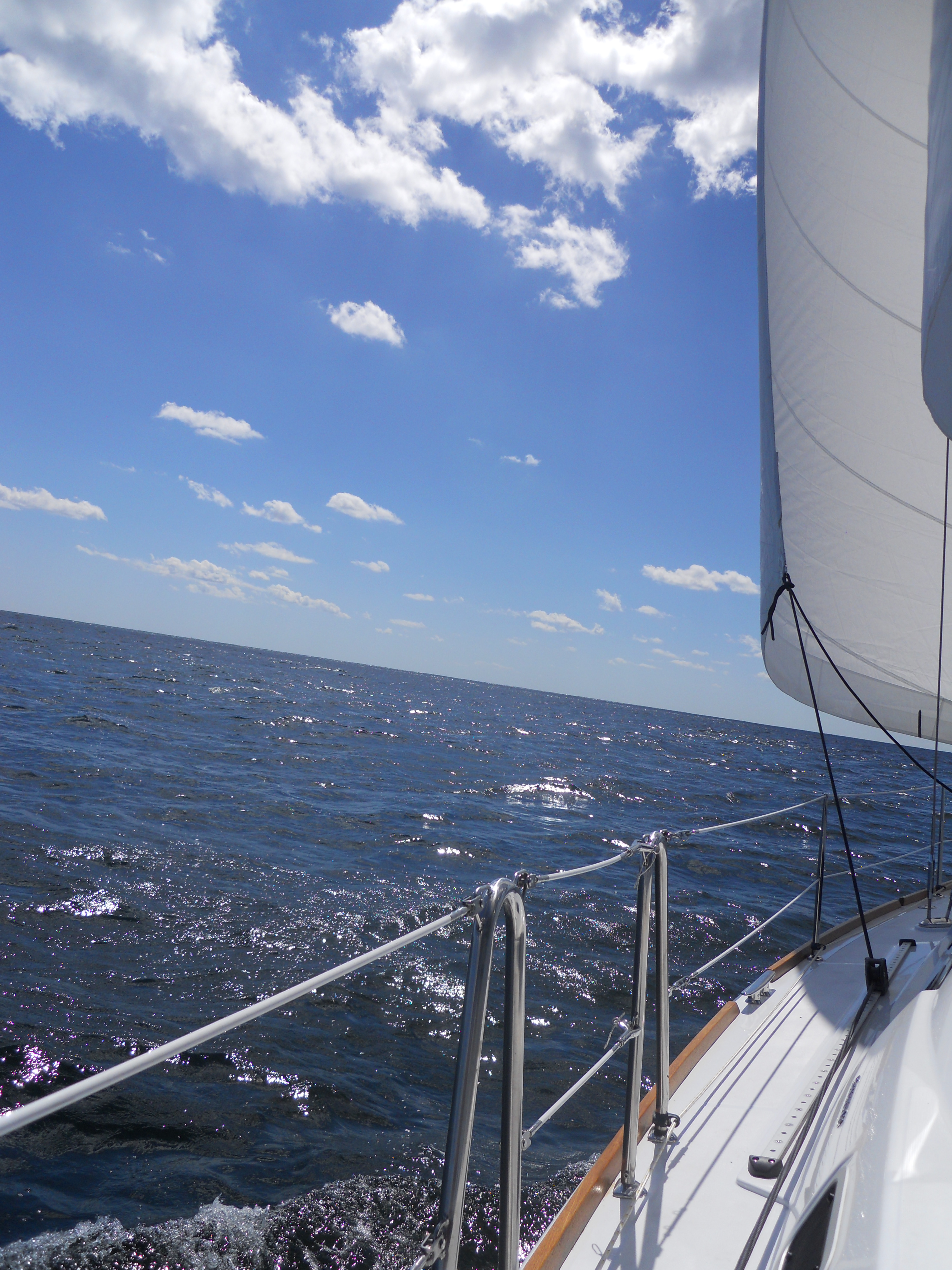 We hit the water just shortly after 7AM. We stay in Solomons Island Saturday not only because it was a really nice port, but also because we wanted to wait for the wind to change from the south (on our nose) to the north (at our back) which was forecast (correctly – thankfully). Also forecast were 2 – 4 ft waves, which seem to be more on the 4ft side. Some of the crew feel a bit sea sick and we struggle to keep the boom from banging round with the waves.