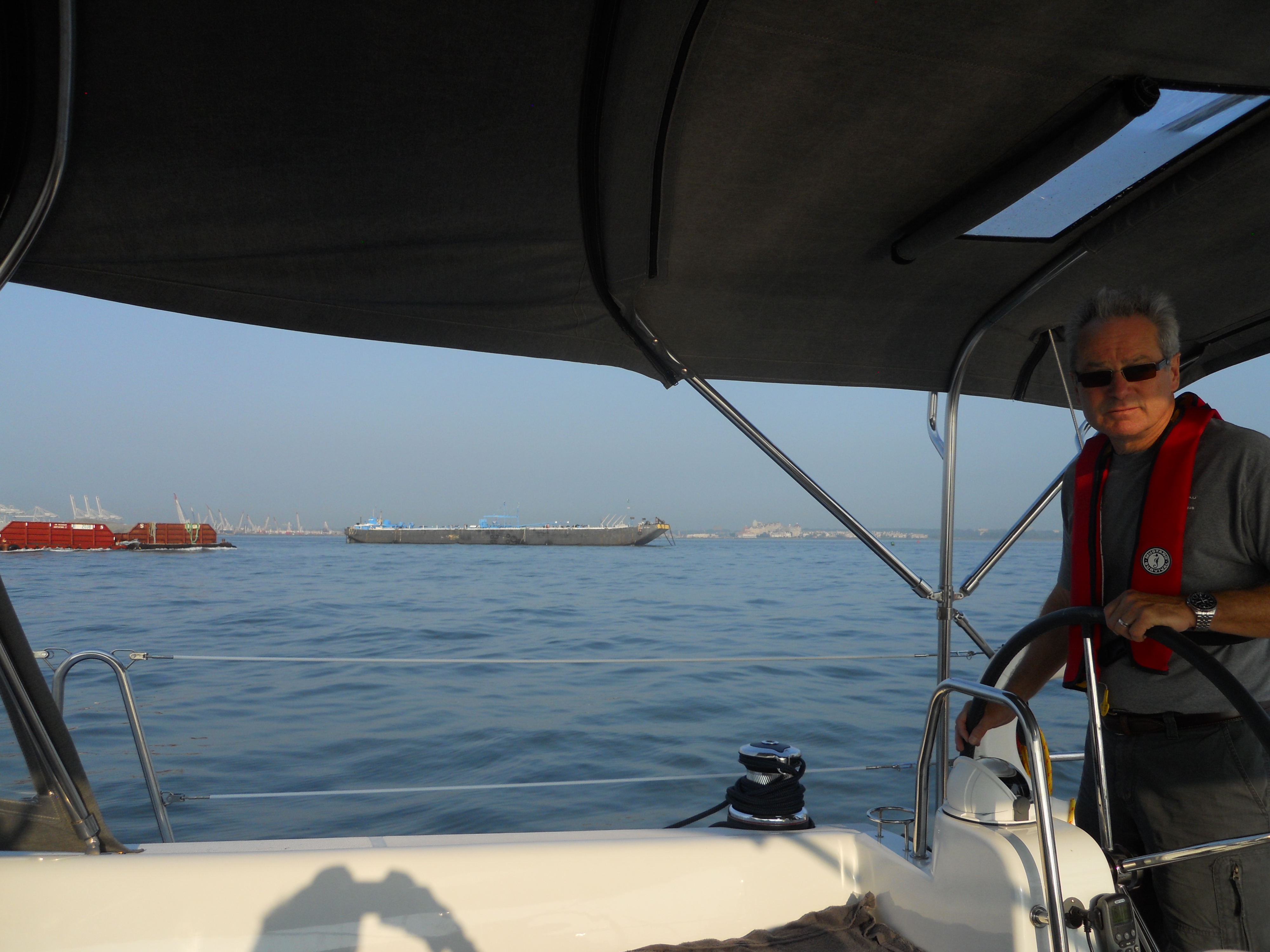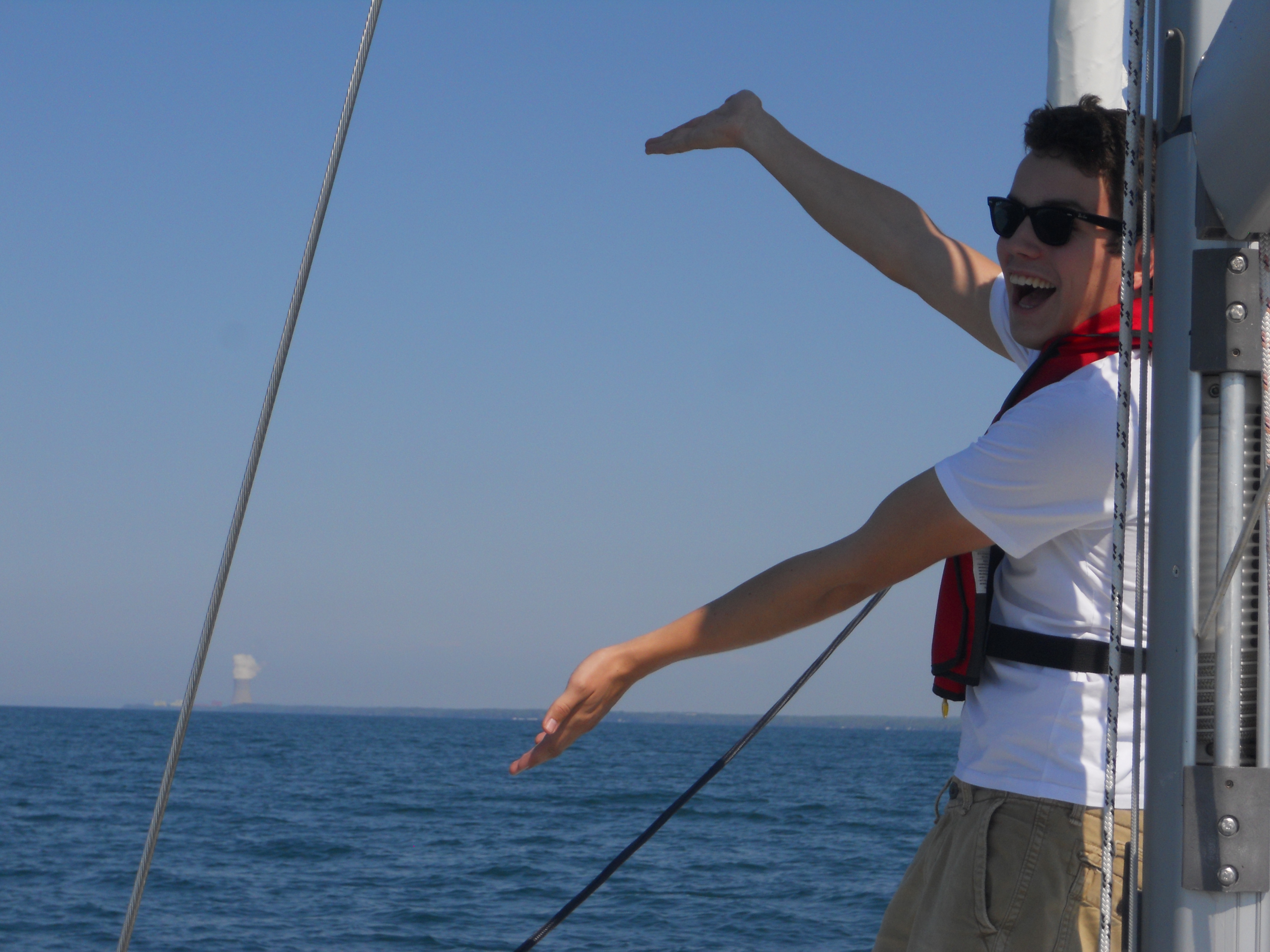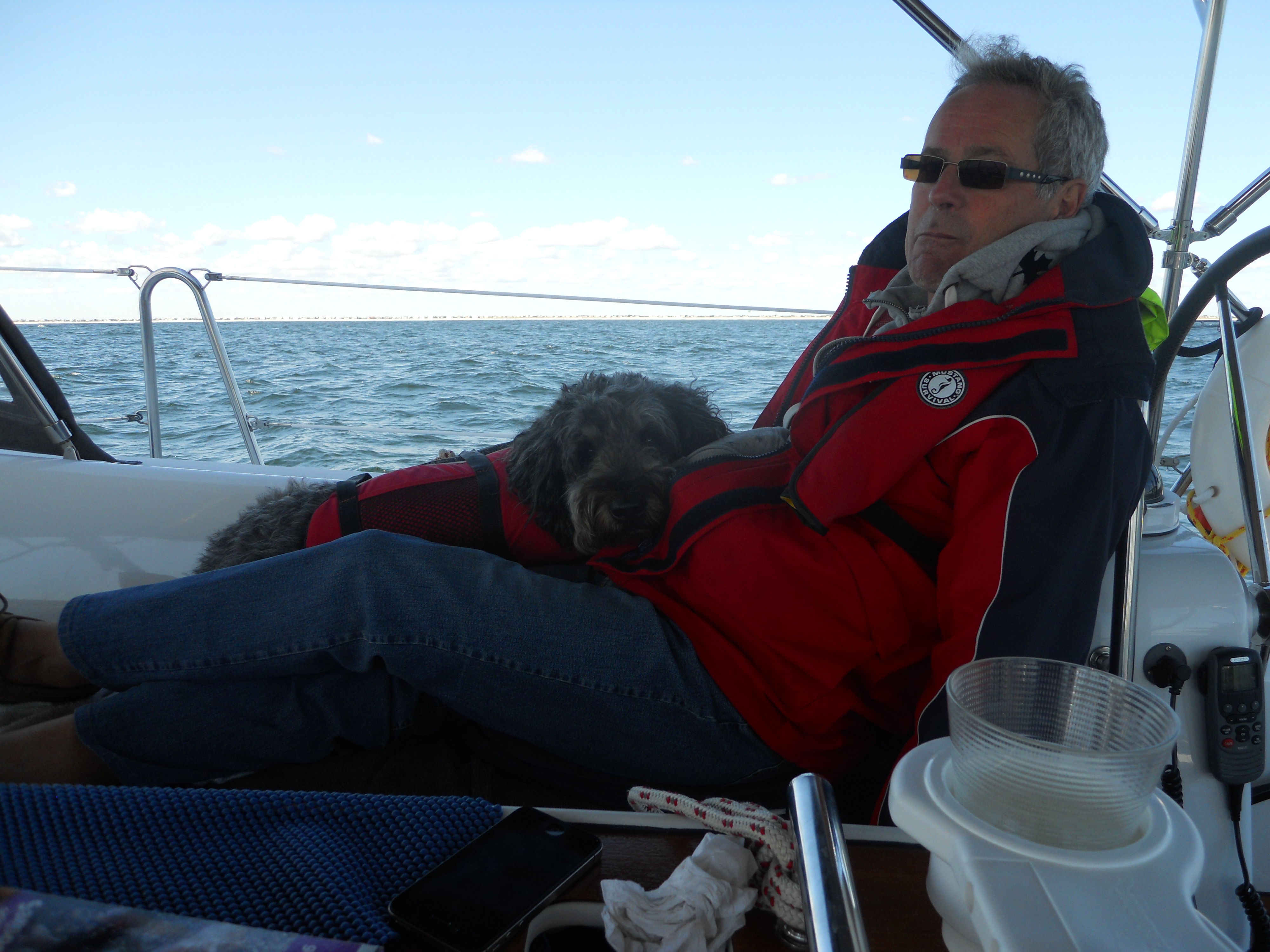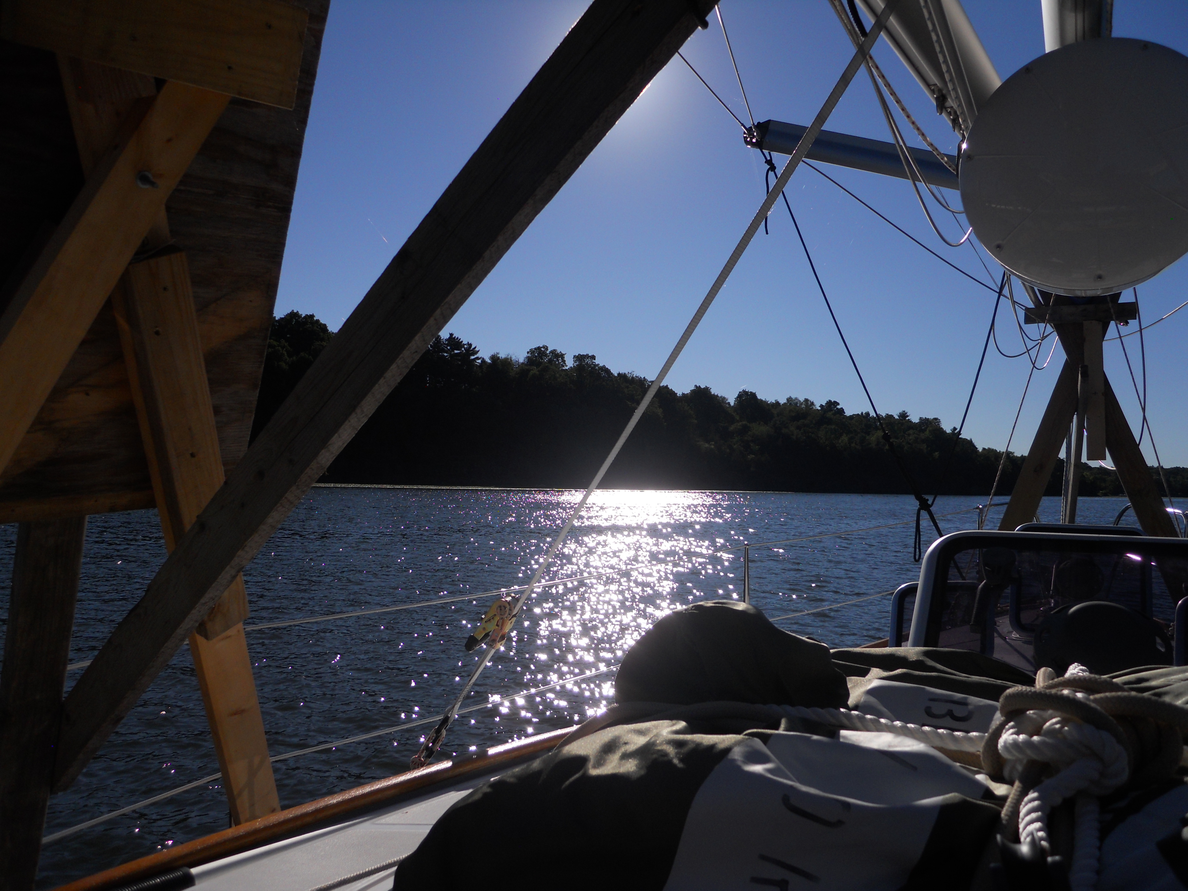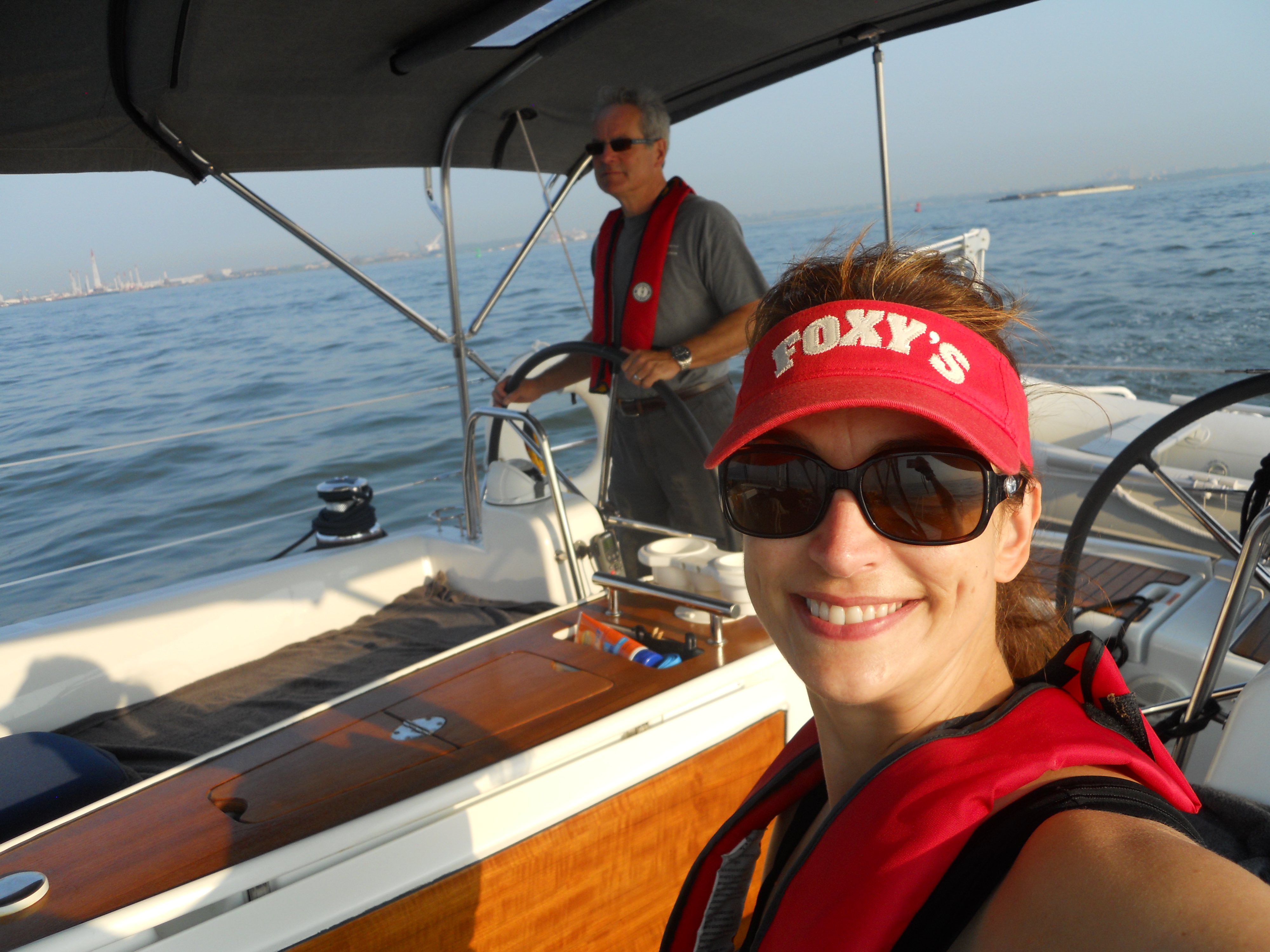 We hit the water just shortly after 7AM. We stay in Solomons Island Saturday not only because it was a really nice port, but also because we wanted to wait for the wind to change from the south (on our nose) to the north (at our back) which was forecast (correctly – thankfully). Also forecast were 2 – 4 ft waves, which seem to be more on the 4ft side. Some of the crew feel a bit sea sick and we struggle to keep the boom from banging round with the waves.