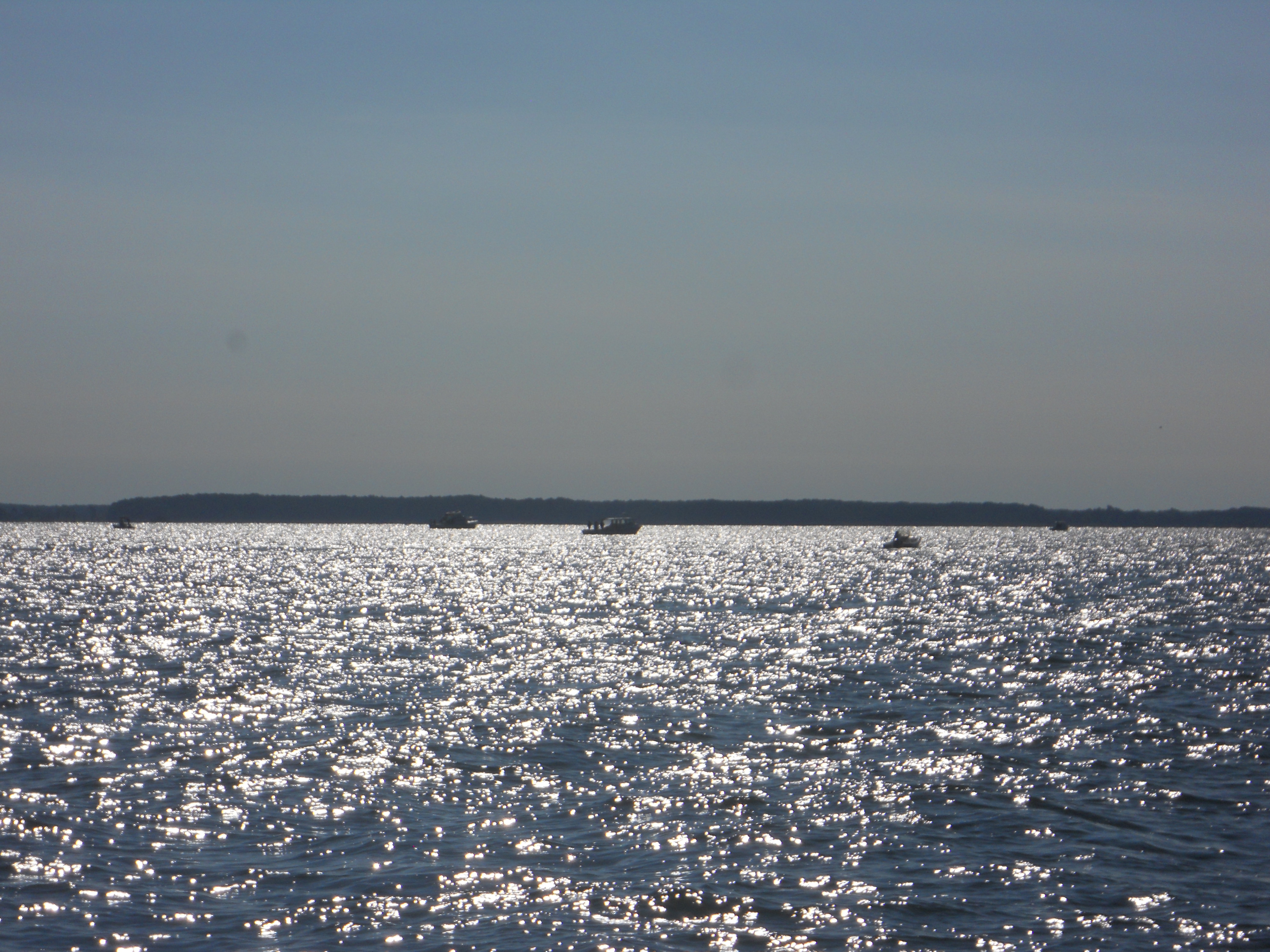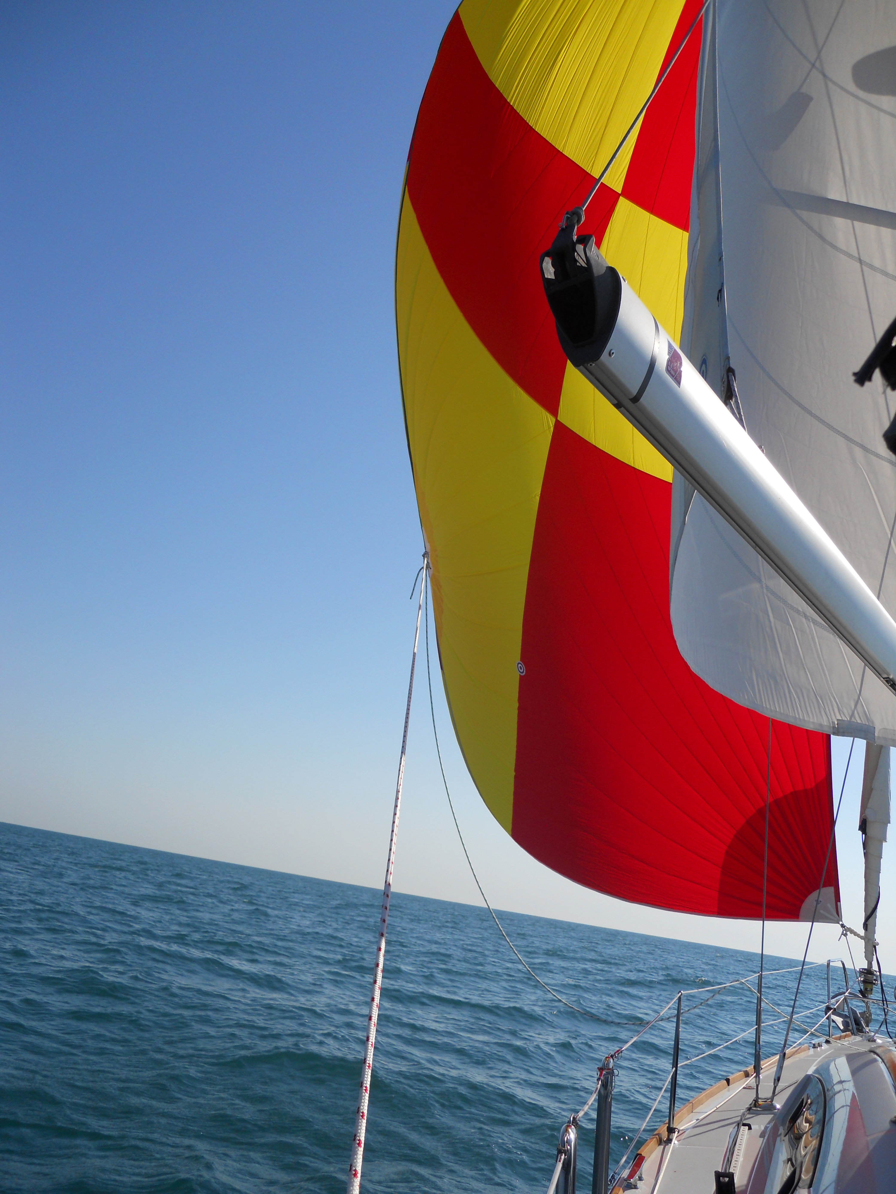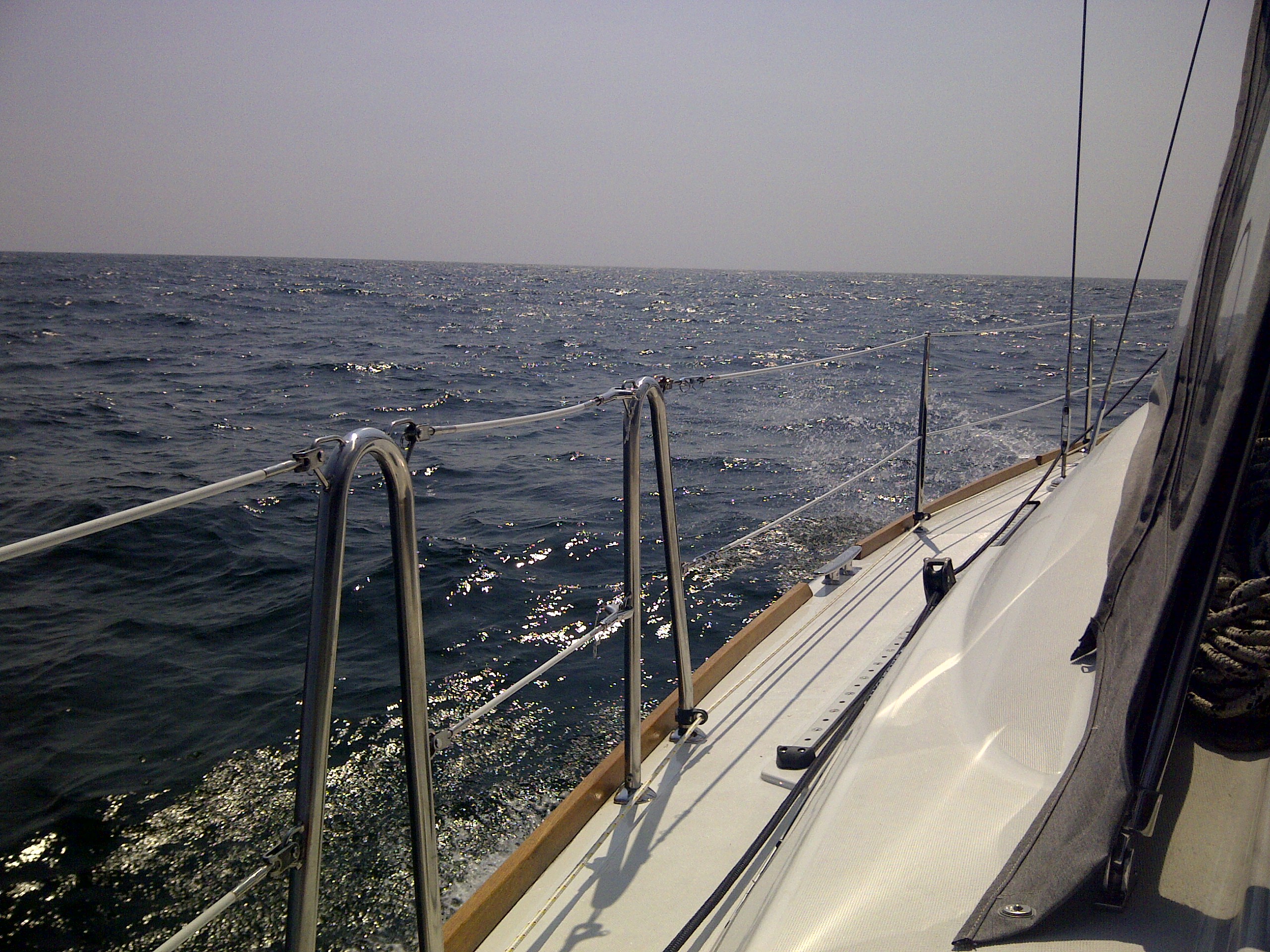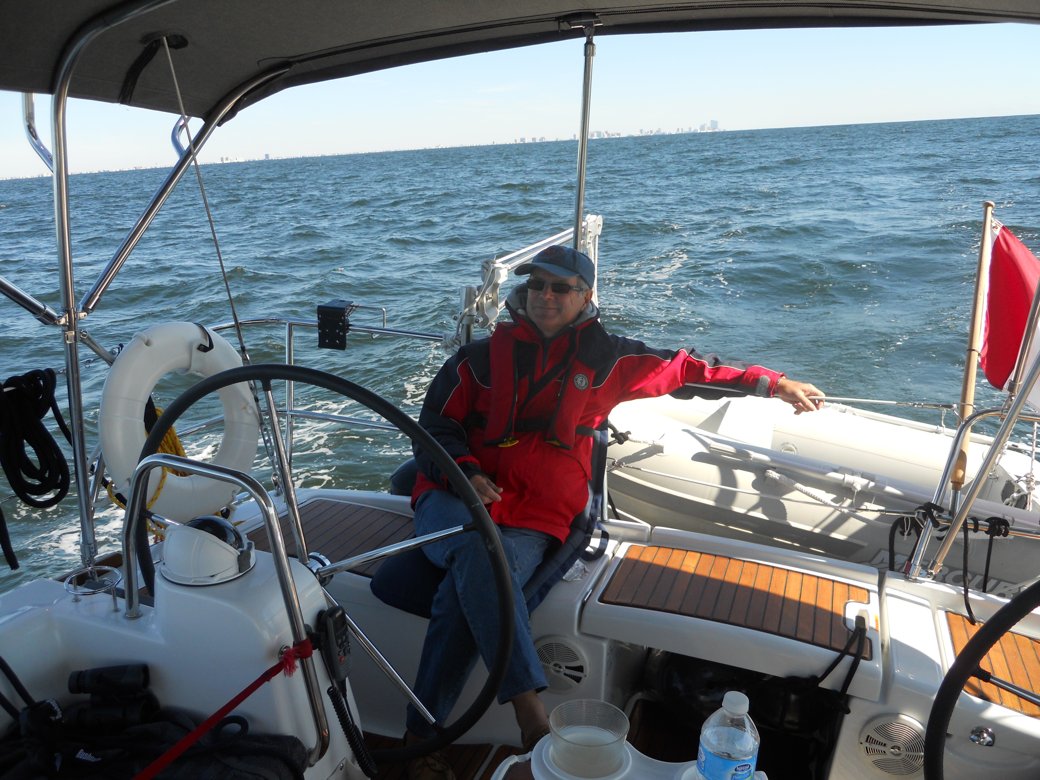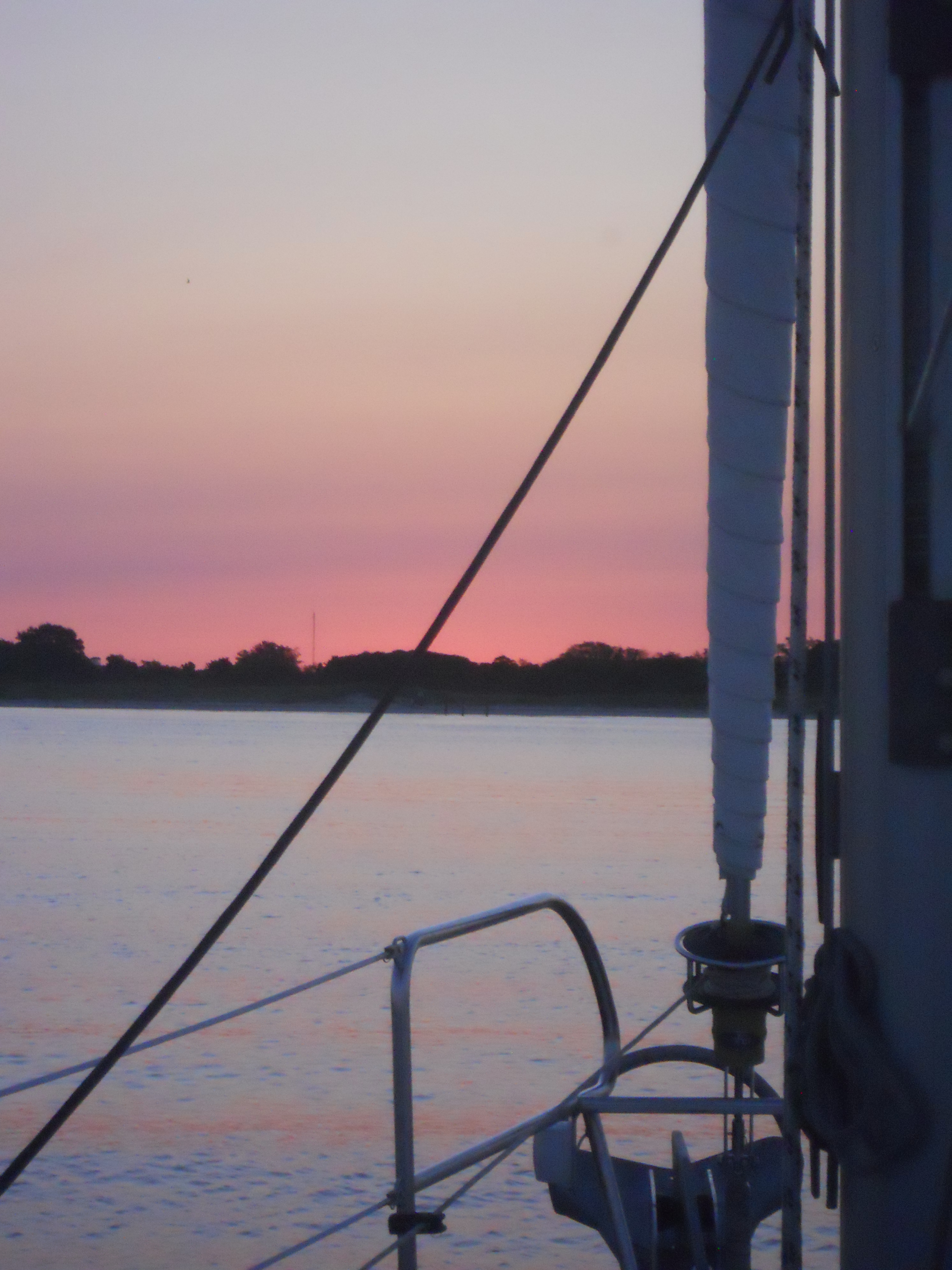 We hit the water just shortly after 7AM. We stay in Solomons Island Saturday not only because it was a really nice port, but also because we wanted to wait for the wind to change from the south (on our nose) to the north (at our back) which was forecast (correctly – thankfully). Also forecast were 2 – 4 ft waves, which seem to be more on the 4ft side. Some of the crew feel a bit sea sick and we struggle to keep the boom from banging round with the waves.