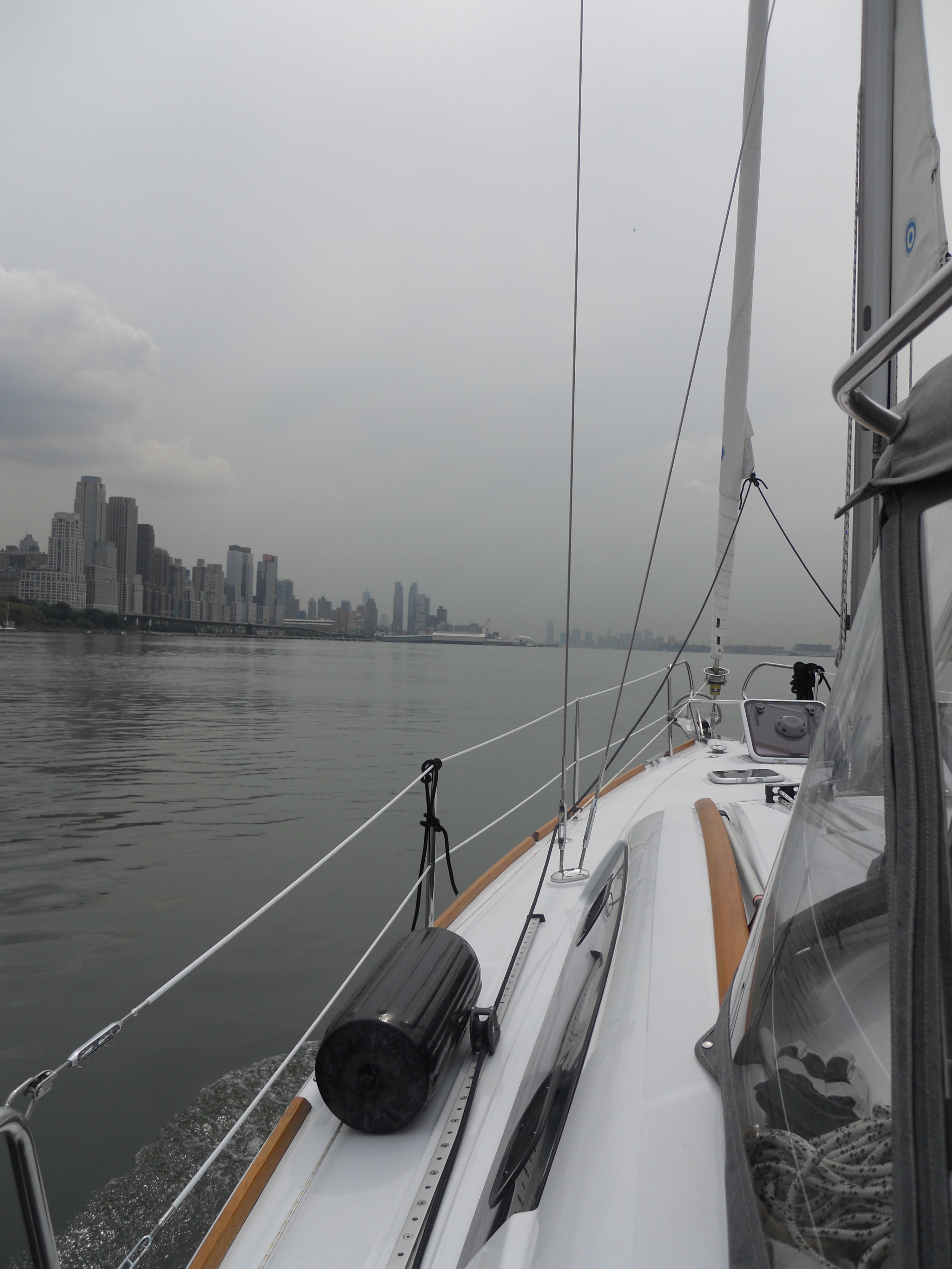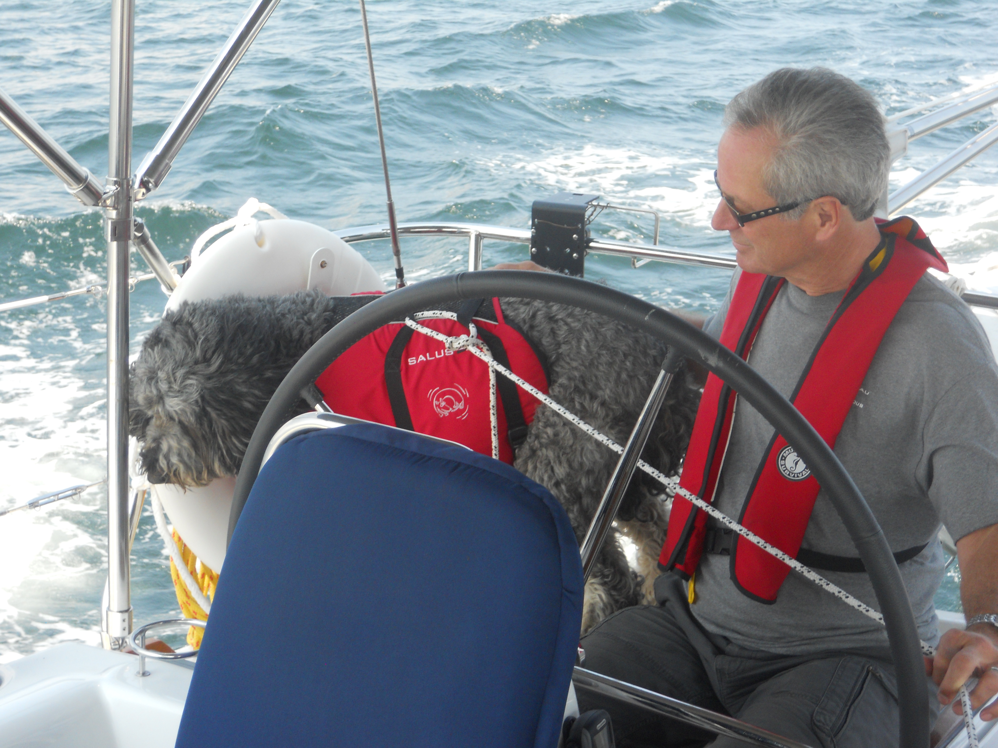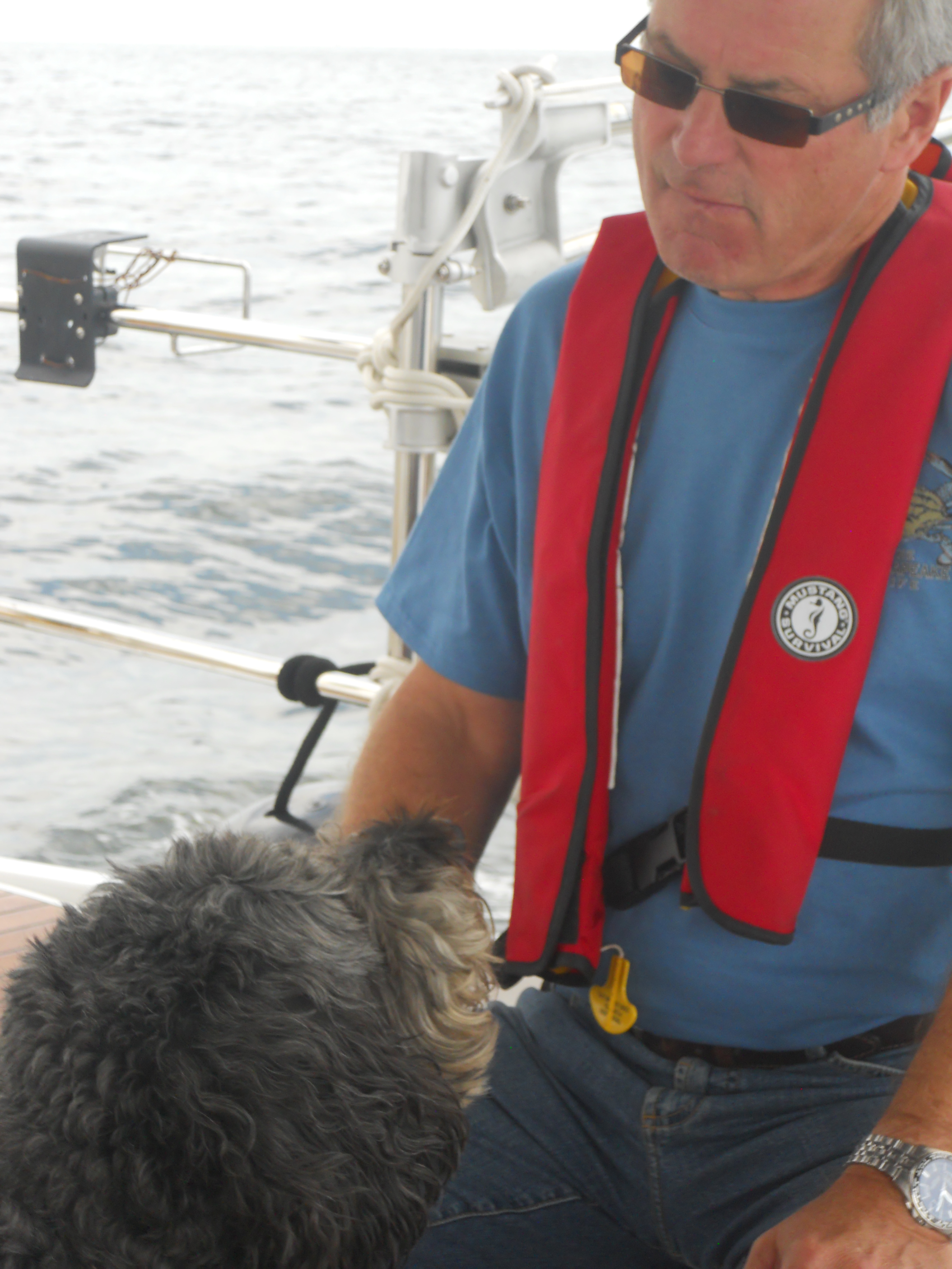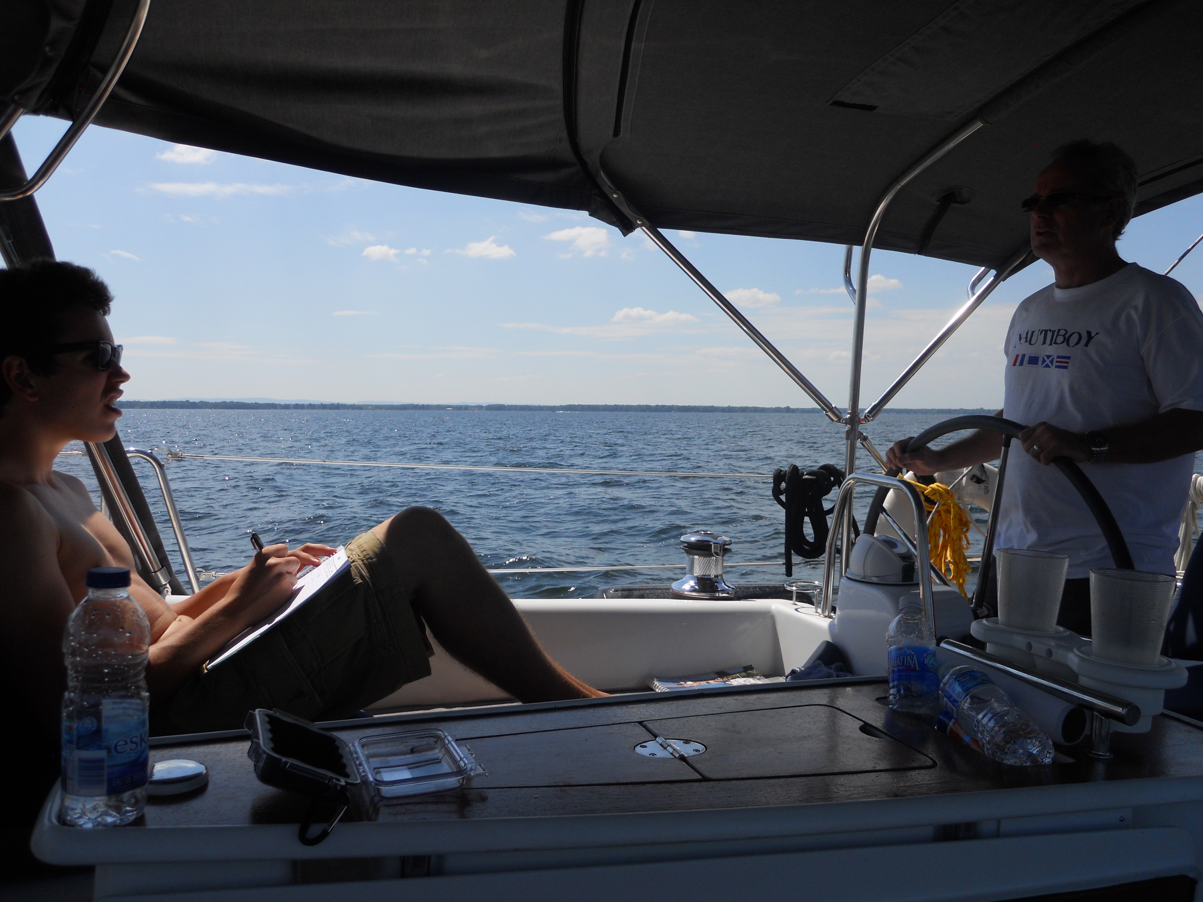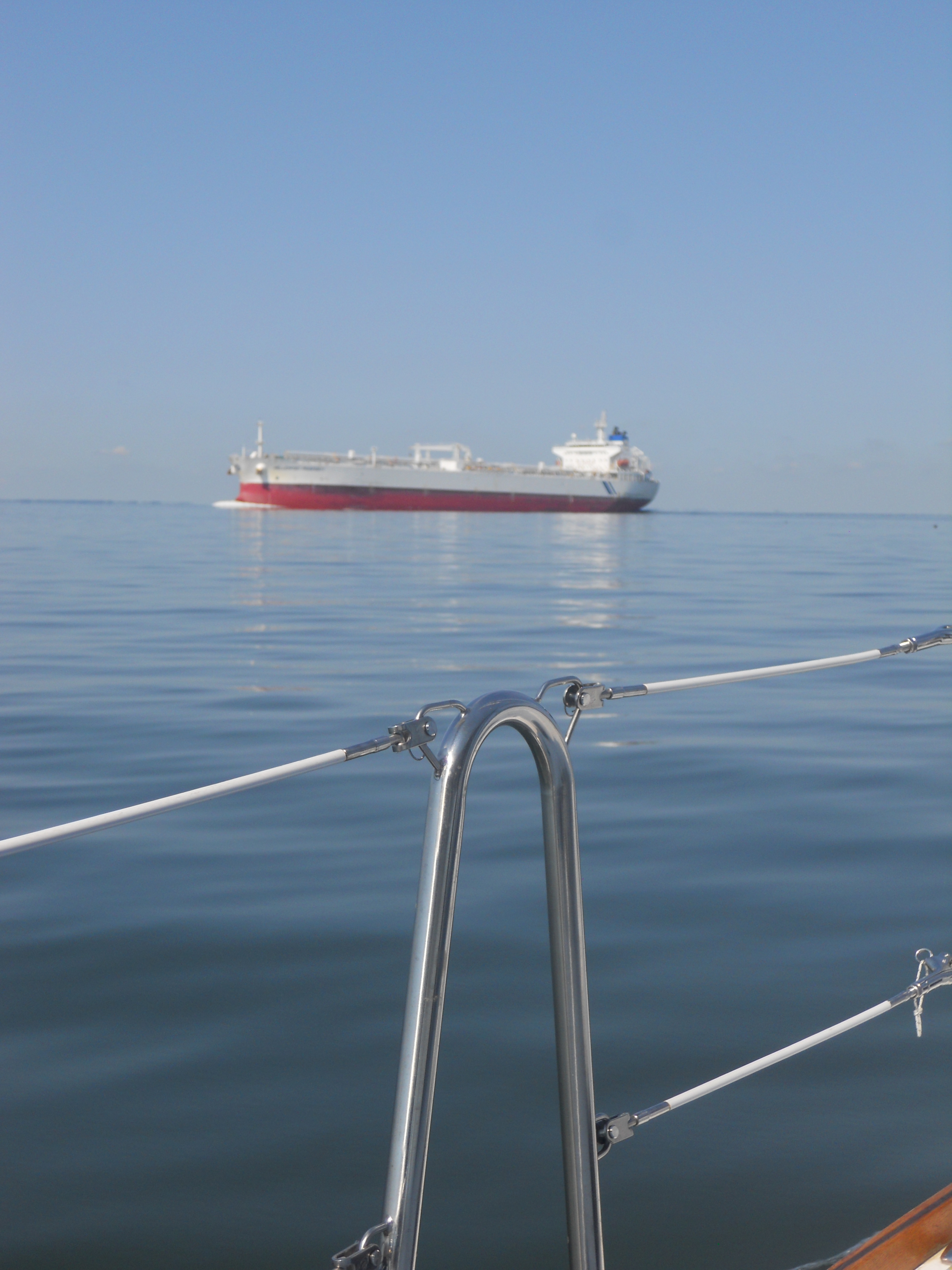 We hit the water just shortly after 7AM. We stay in Solomons Island Saturday not only because it was a really nice port, but also because we wanted to wait for the wind to change from the south (on our nose) to the north (at our back) which was forecast (correctly – thankfully). Also forecast were 2 – 4 ft waves, which seem to be more on the 4ft side. Some of the crew feel a bit sea sick and we struggle to keep the boom from banging round with the waves.