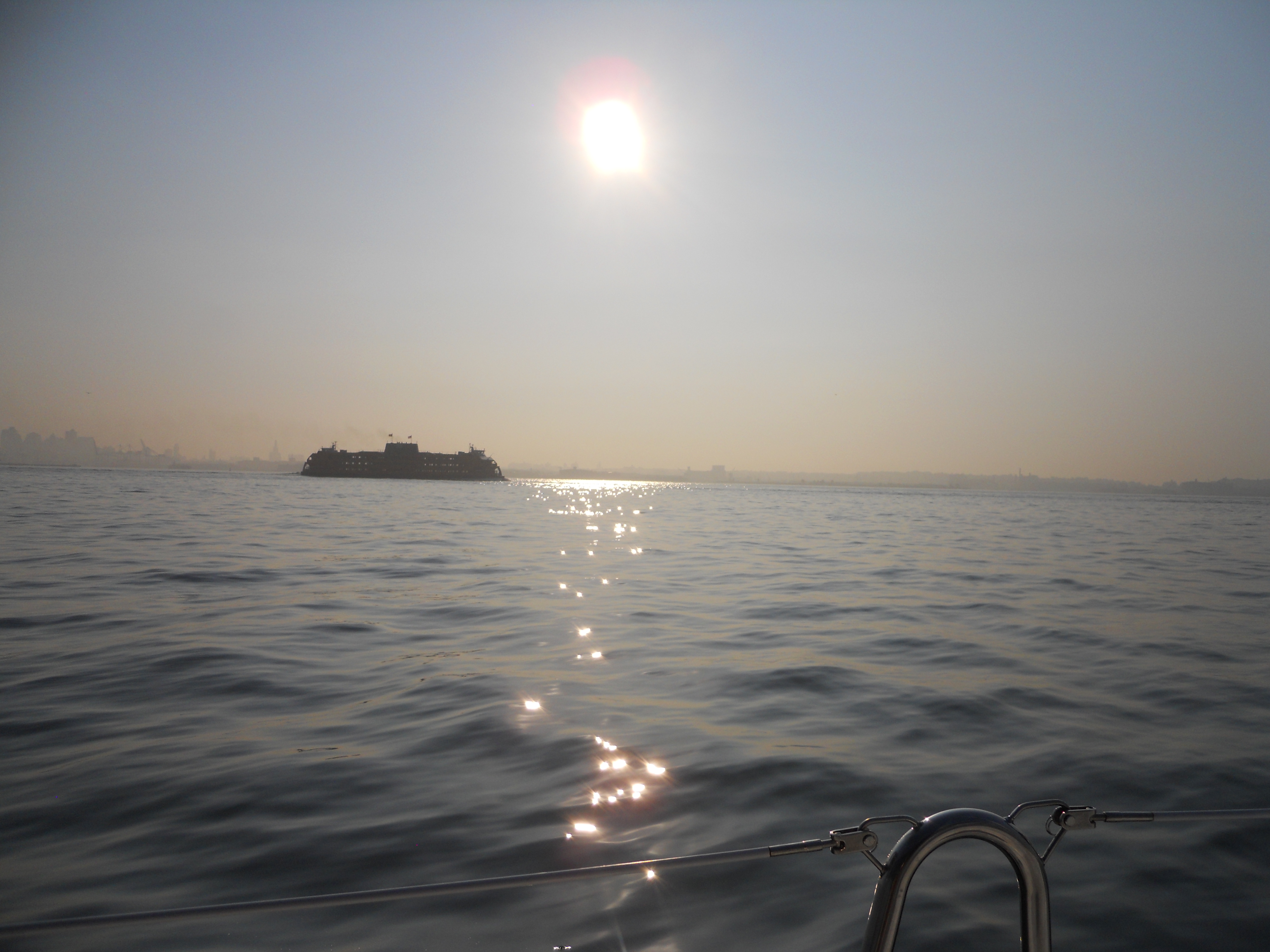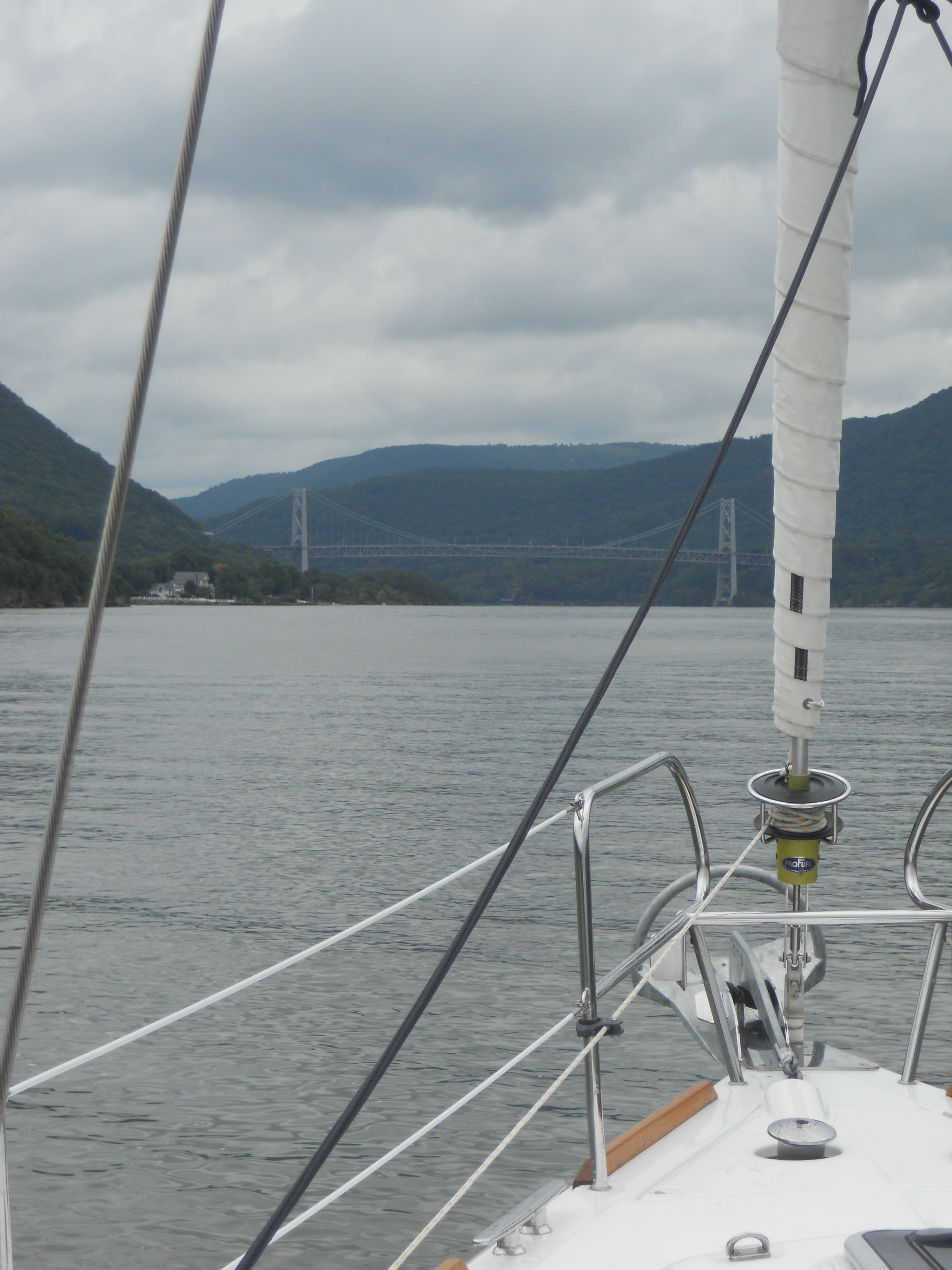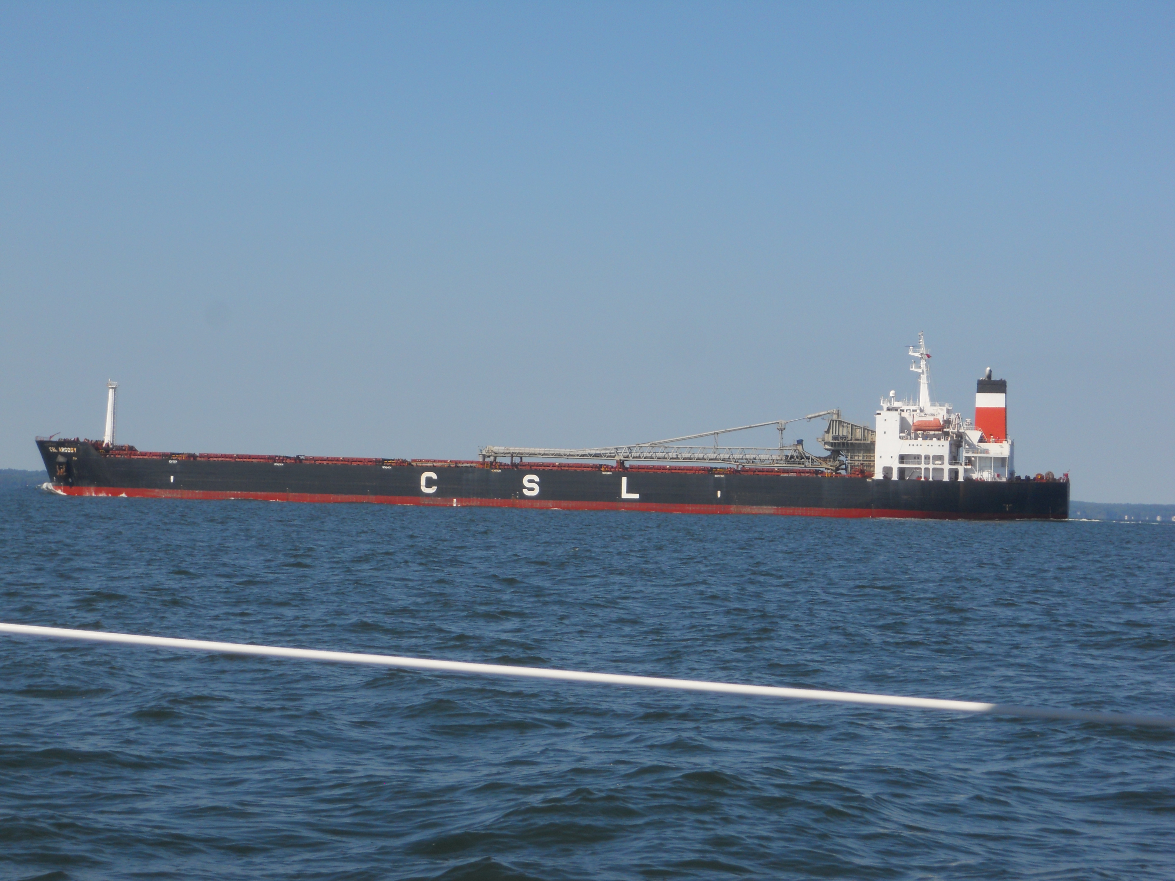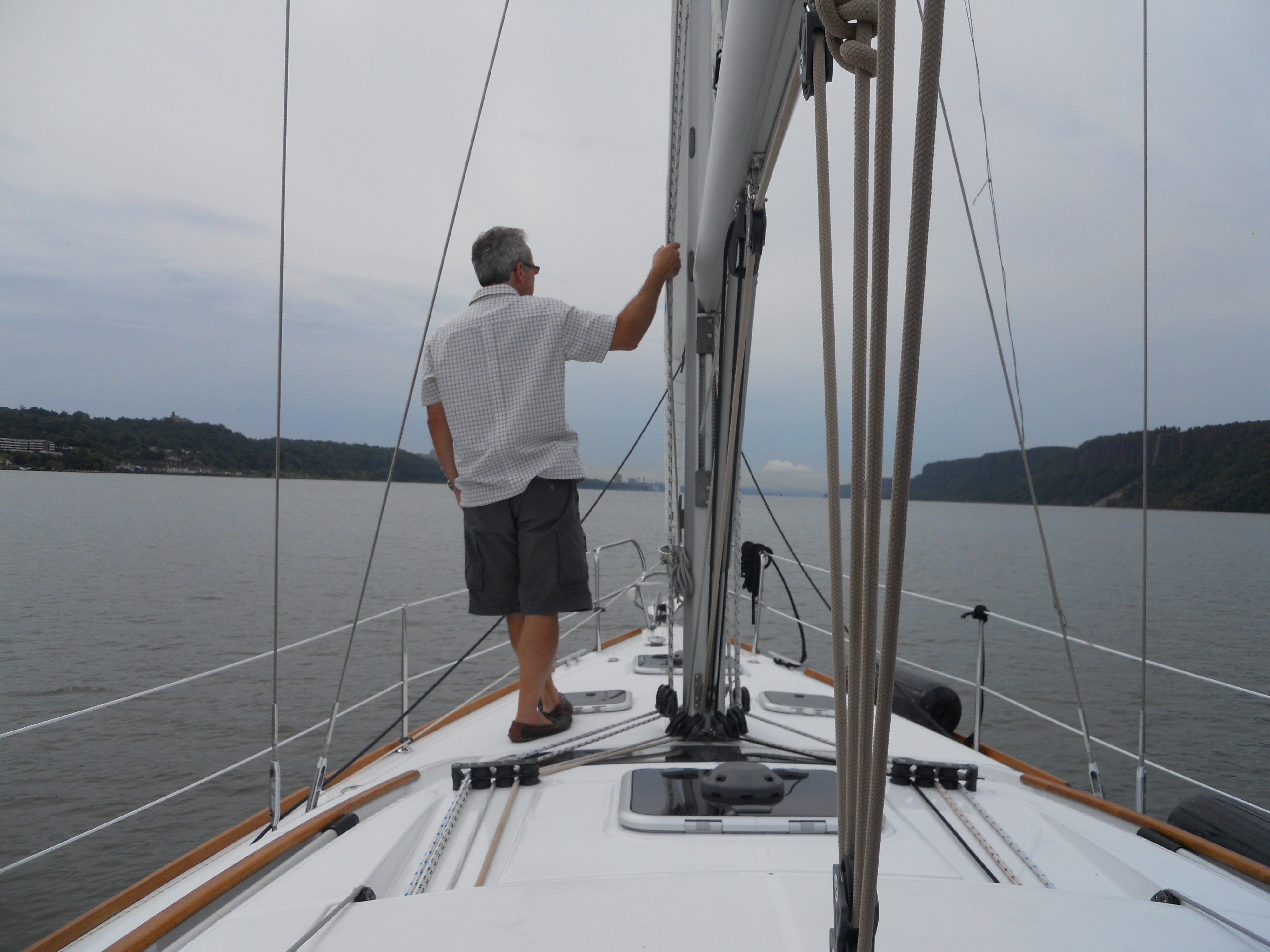 We hit the water just shortly after 7AM. We stay in Solomons Island Saturday not only because it was a really nice port, but also because we wanted to wait for the wind to change from the south (on our nose) to the north (at our back) which was forecast (correctly – thankfully). Also forecast were 2 – 4 ft waves, which seem to be more on the 4ft side. Some of the crew feel a bit sea sick and we struggle to keep the boom from banging round with the waves.