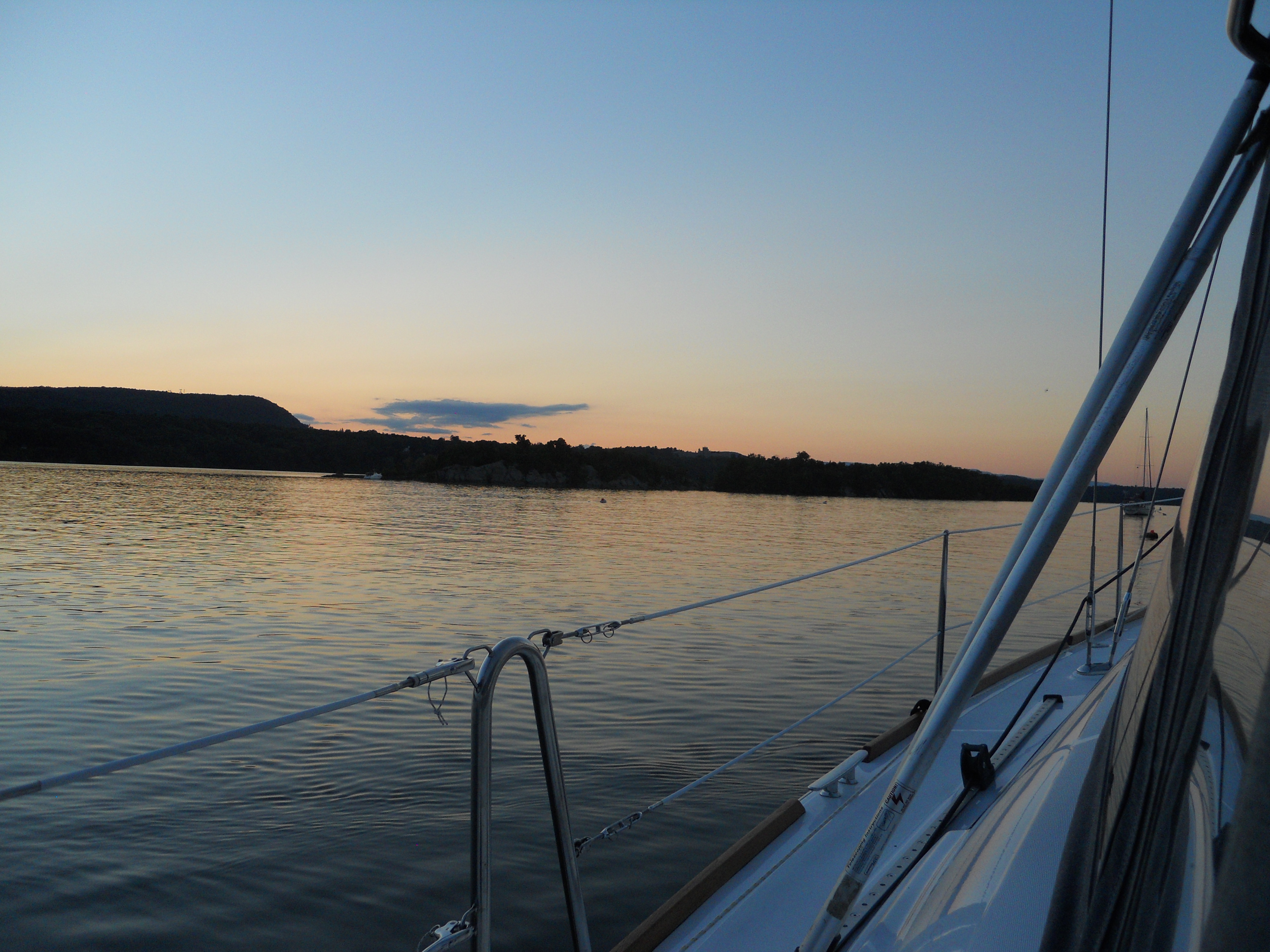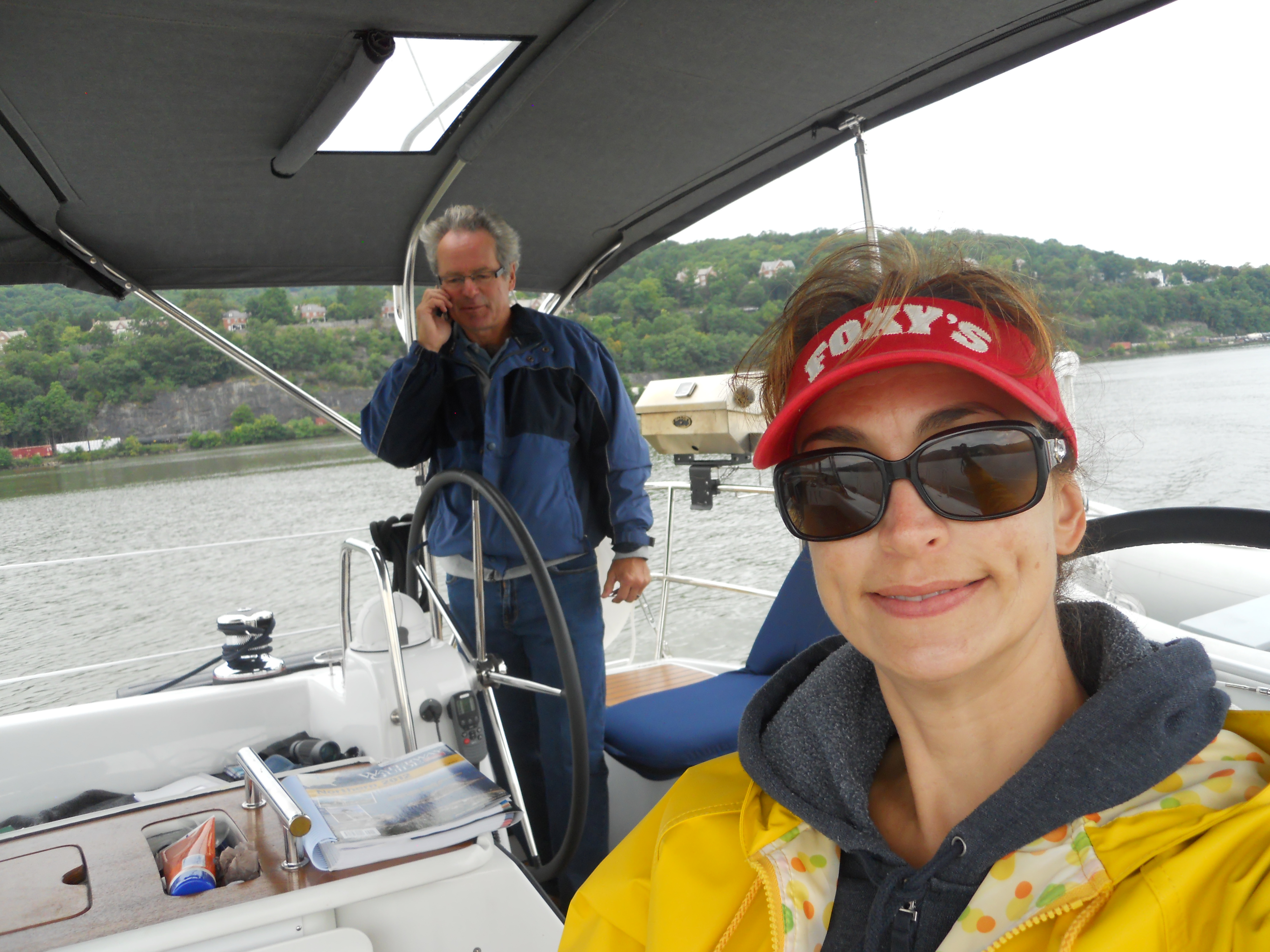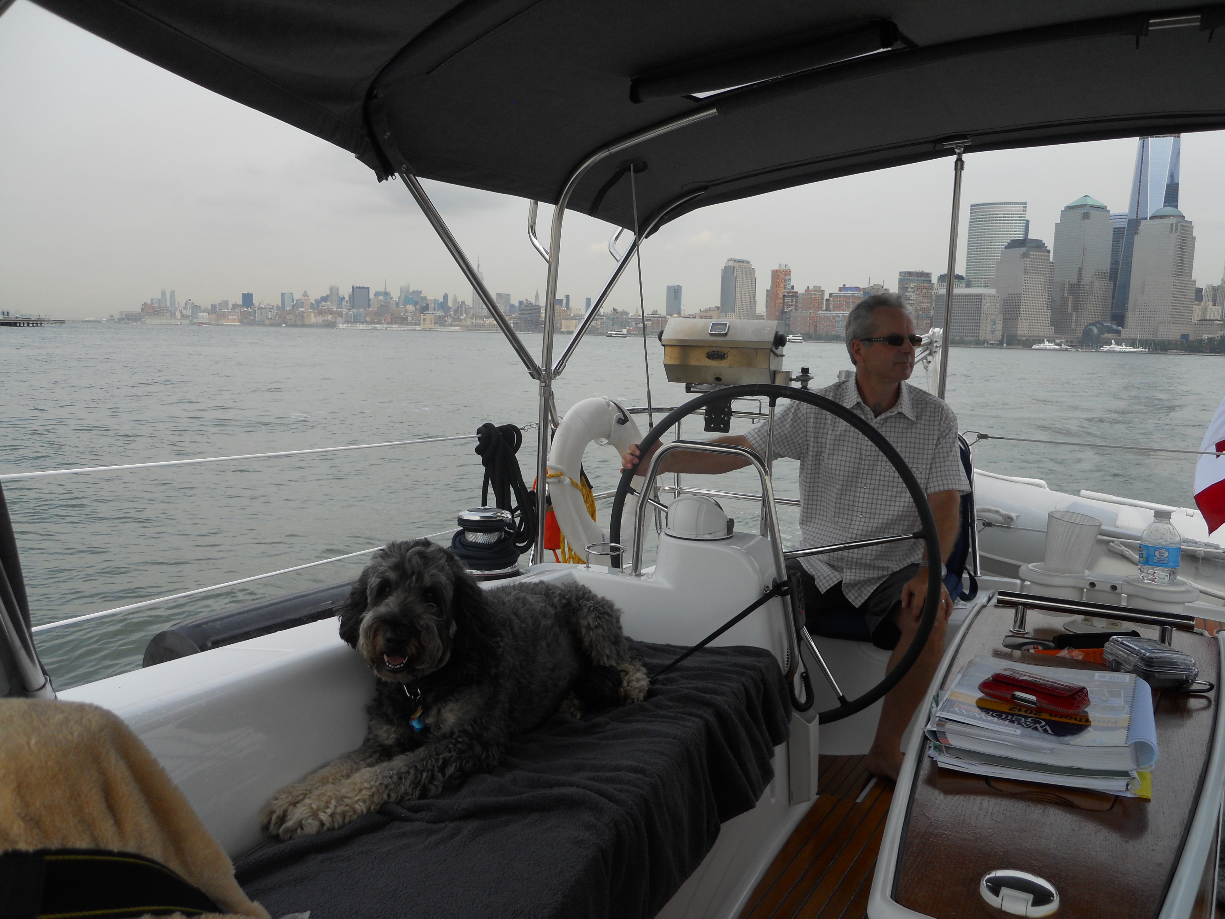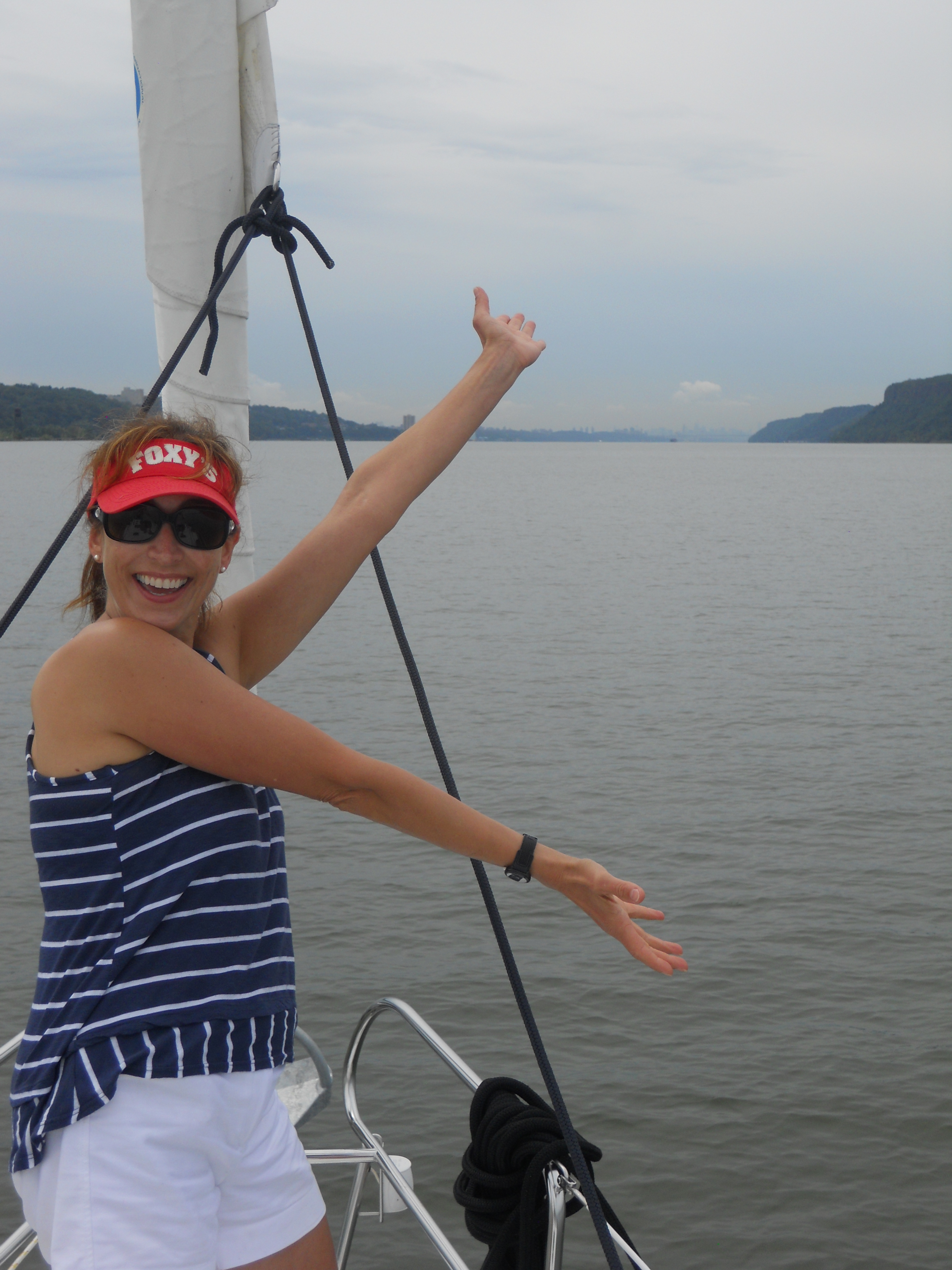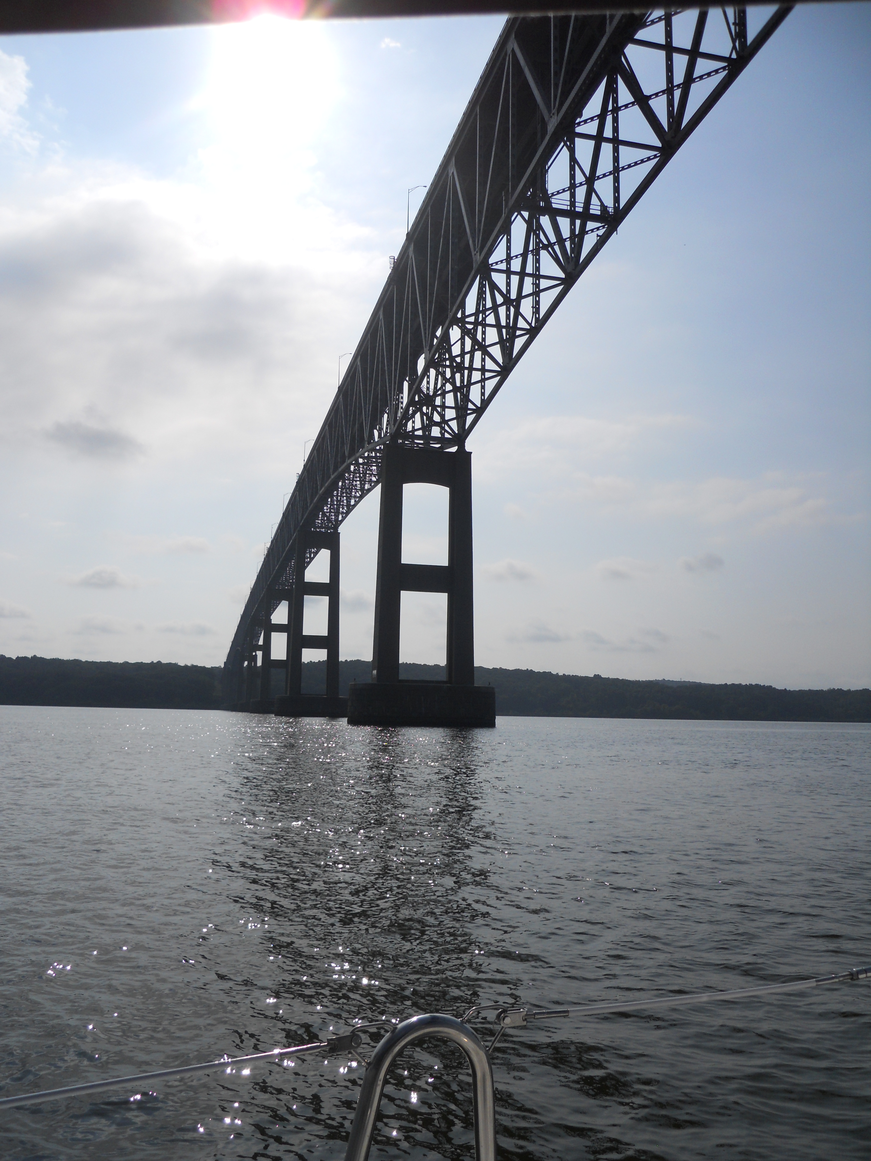 We hit the water just shortly after 7AM. We stay in Solomons Island Saturday not only because it was a really nice port, but also because we wanted to wait for the wind to change from the south (on our nose) to the north (at our back) which was forecast (correctly – thankfully). Also forecast were 2 – 4 ft waves, which seem to be more on the 4ft side. Some of the crew feel a bit sea sick and we struggle to keep the boom from banging round with the waves.