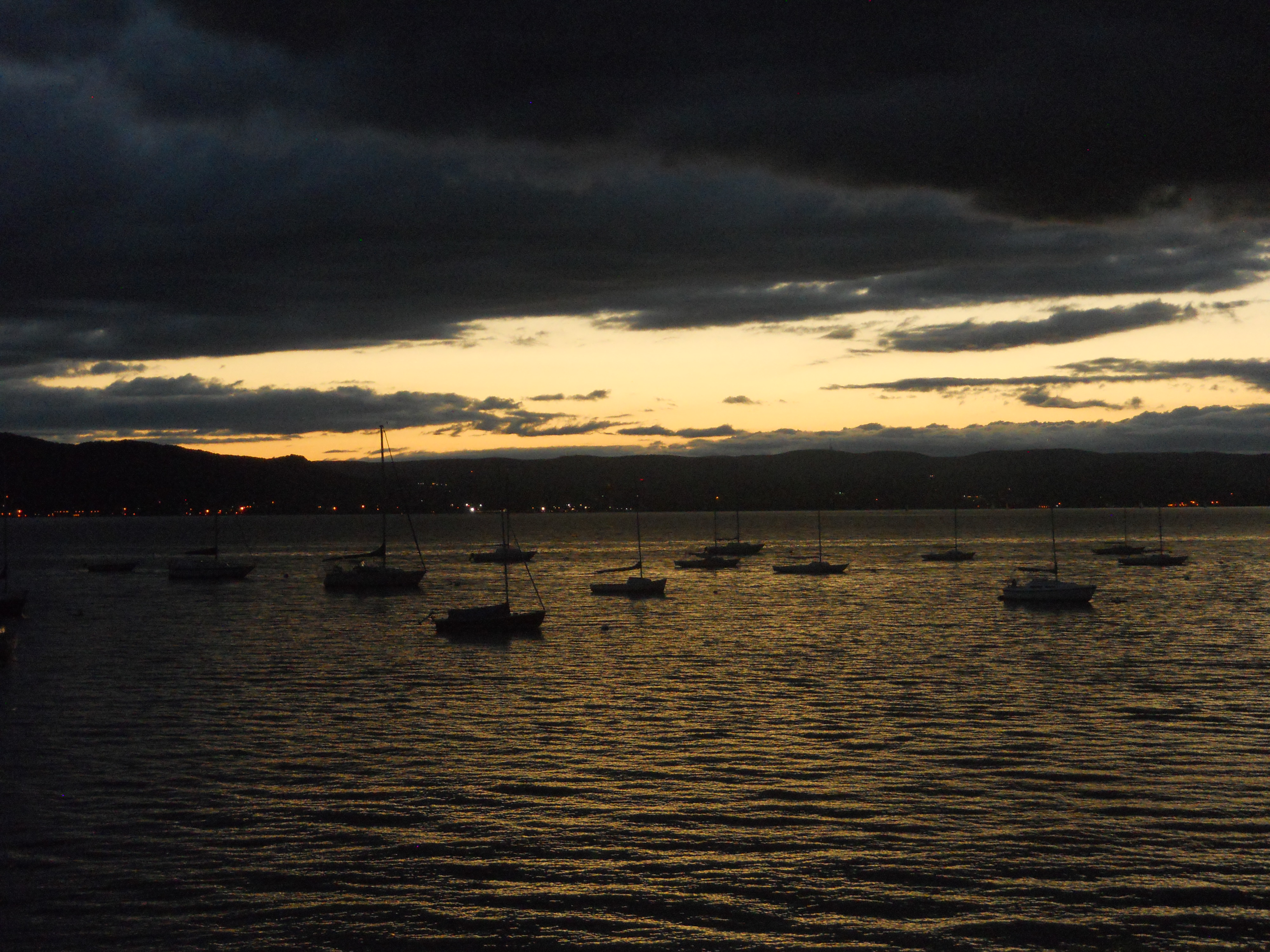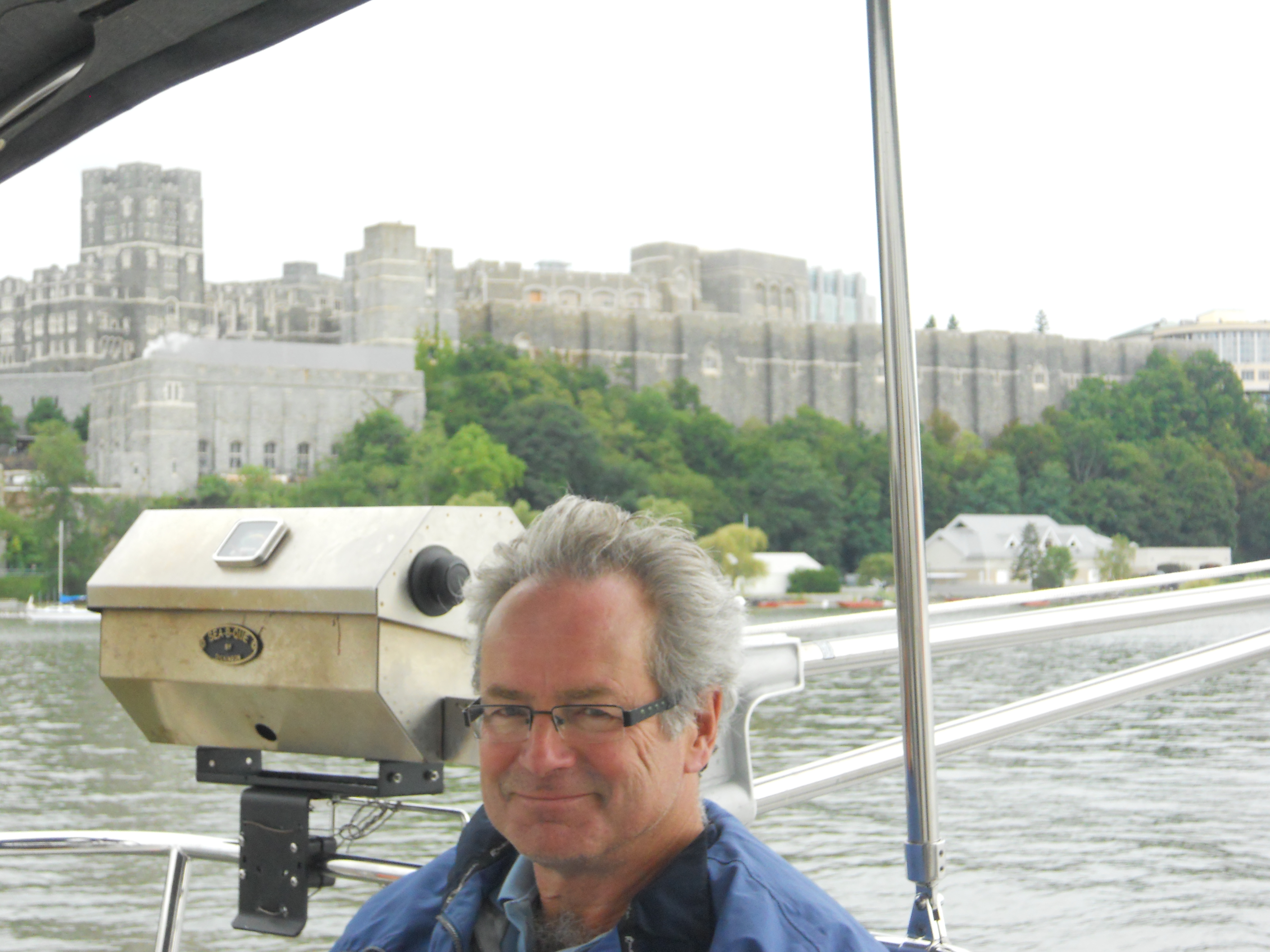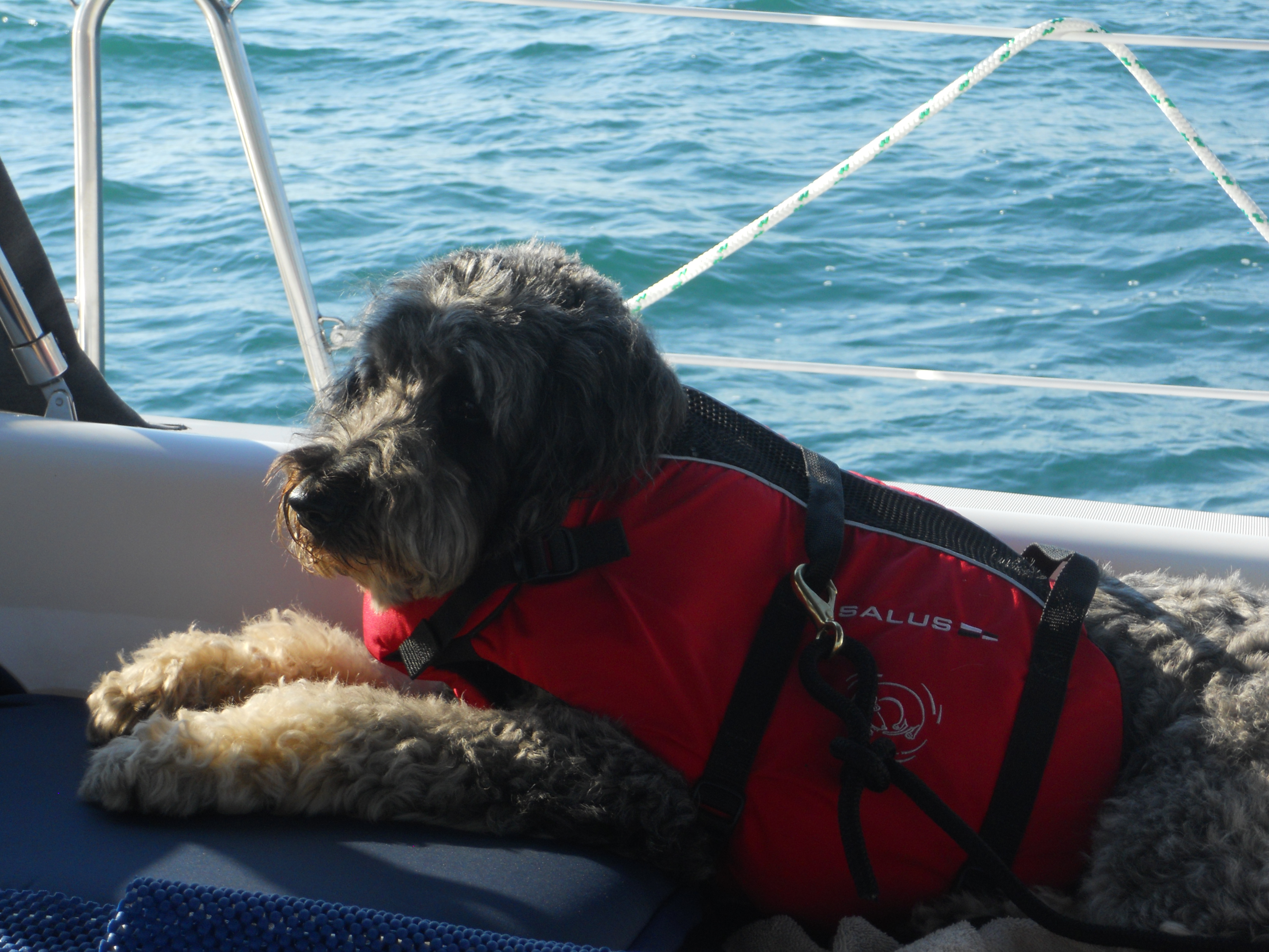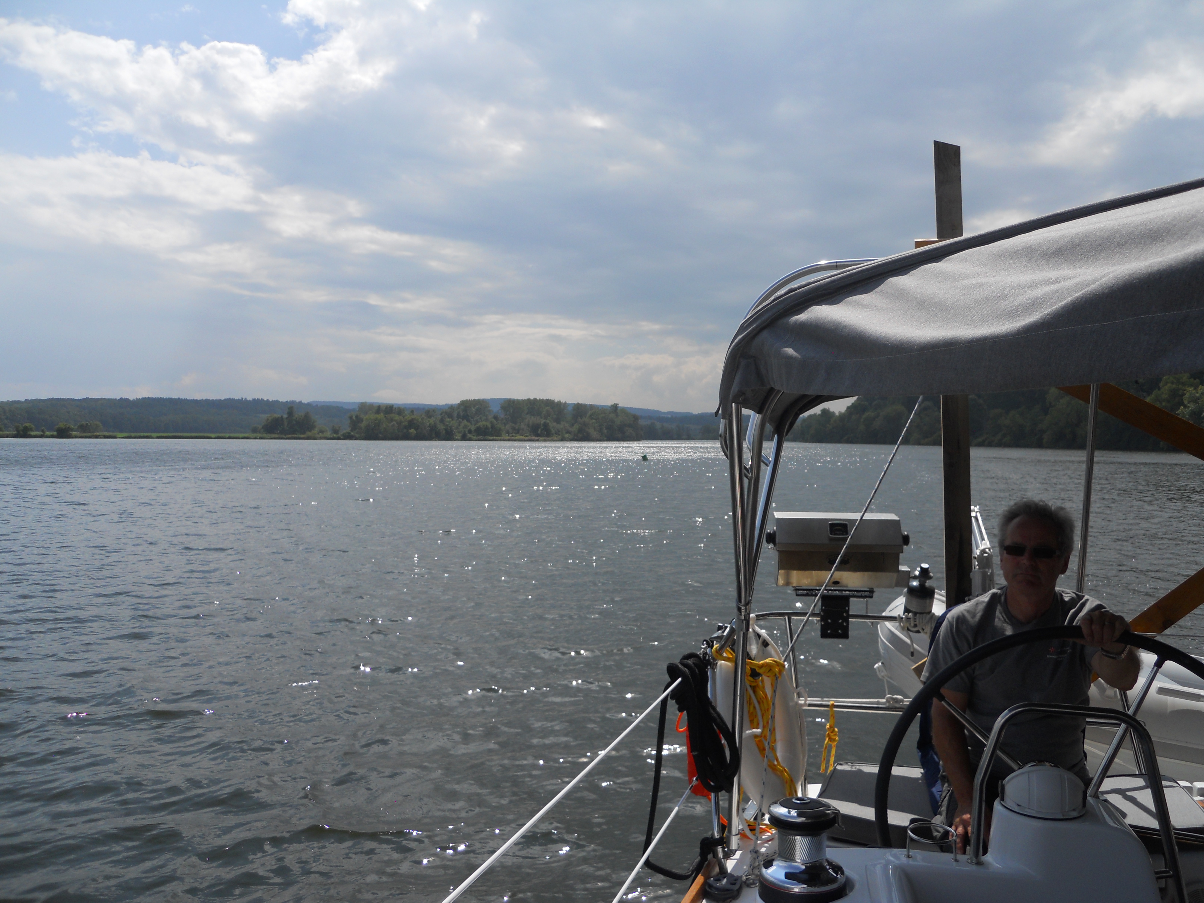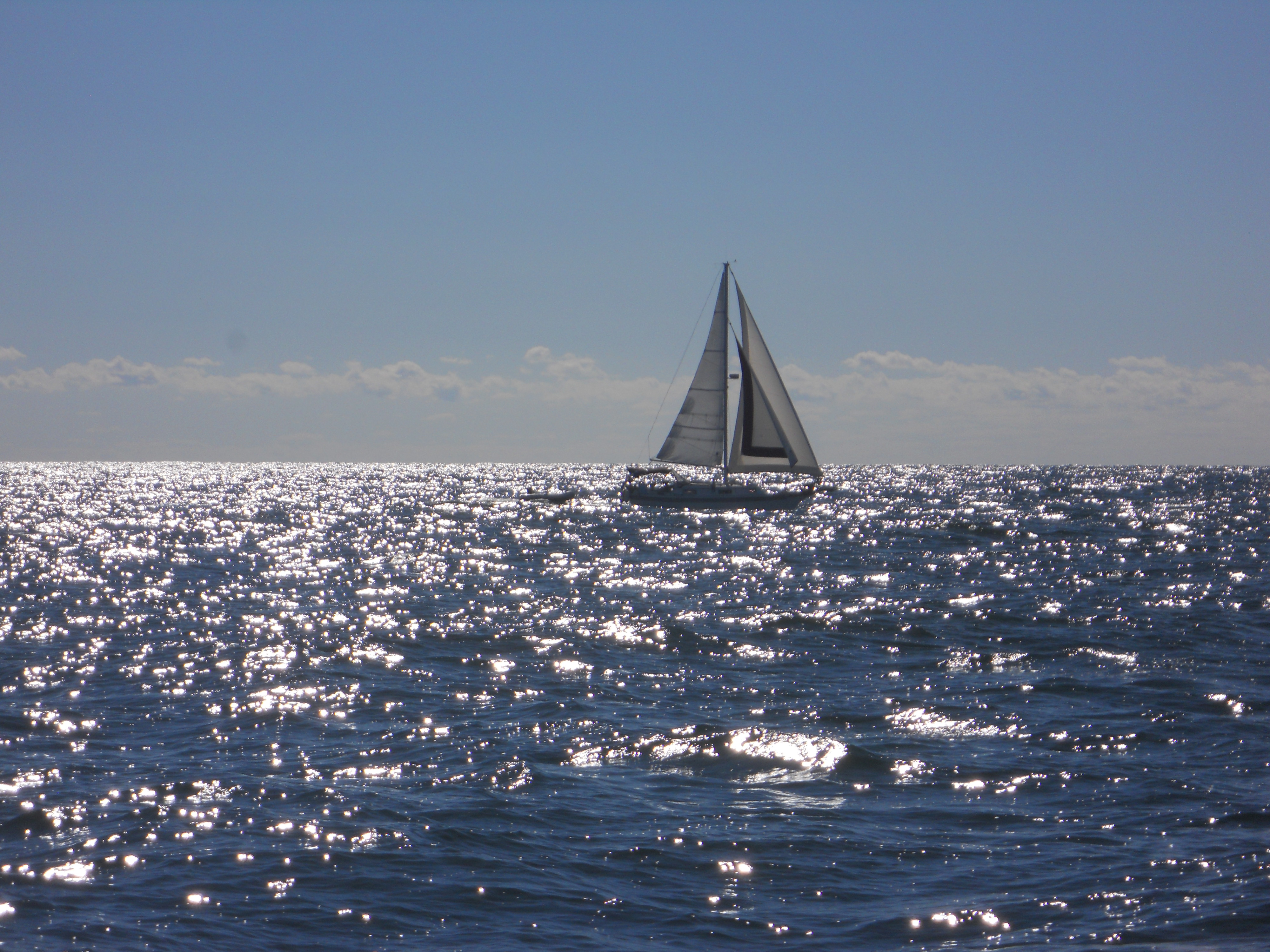 We hit the water just shortly after 7AM. We stay in Solomons Island Saturday not only because it was a really nice port, but also because we wanted to wait for the wind to change from the south (on our nose) to the north (at our back) which was forecast (correctly – thankfully). Also forecast were 2 – 4 ft waves, which seem to be more on the 4ft side. Some of the crew feel a bit sea sick and we struggle to keep the boom from banging round with the waves.