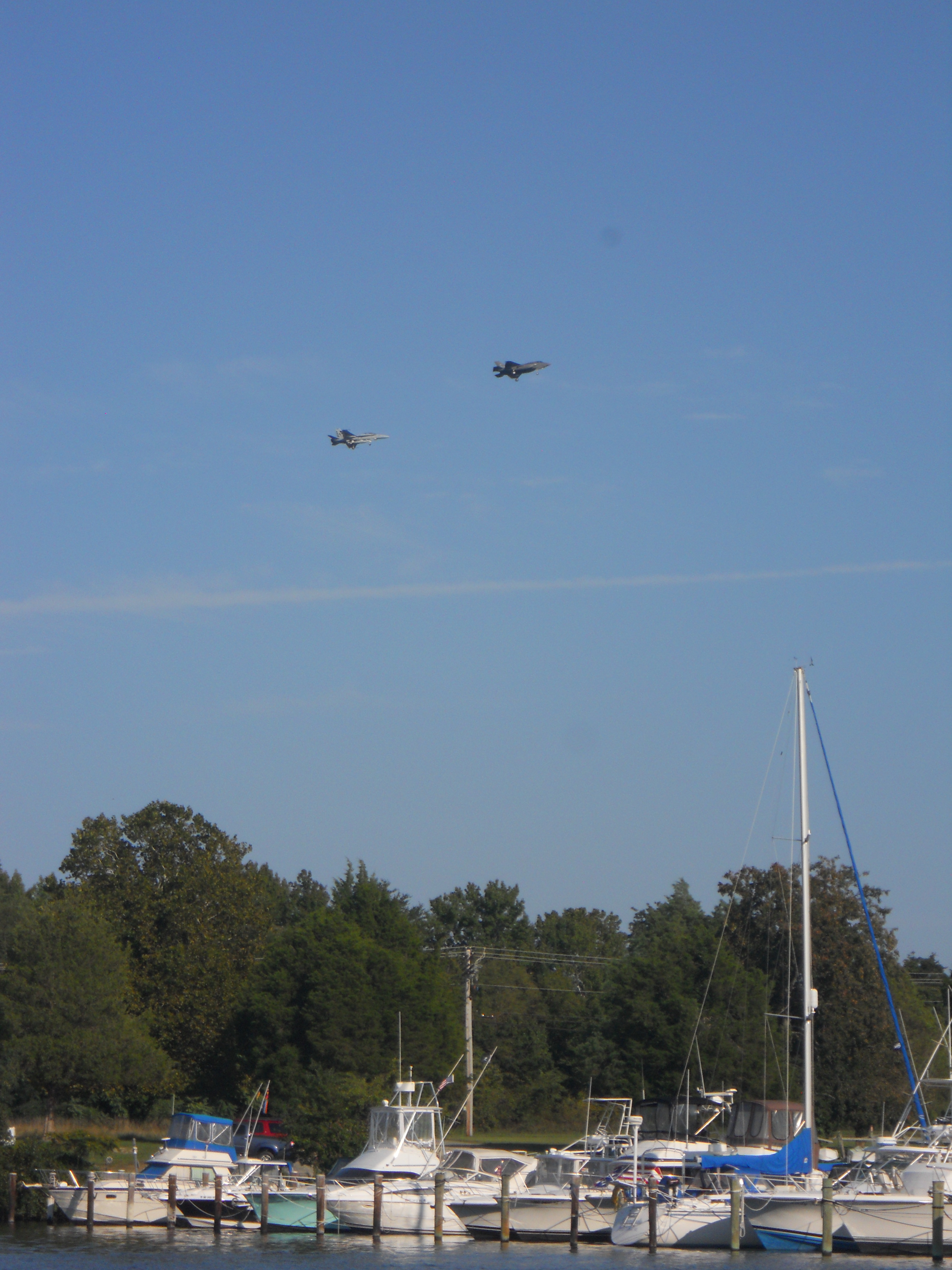The trip from St. Michaels to Solomons Island is a long one so we are up and on the water by 7:30AM. Unbelievable — another beautiful morning. Its cool, but sunny. We have had incredible luck with the weather! We do a bit of sailing, but end up powering a lot of the day. As we pull into th Patuxent River inlet, we can hear the jets over head from the nearby naval base. They are noisy but it is very cool seeing them fly overhead. Like having your own airshow.