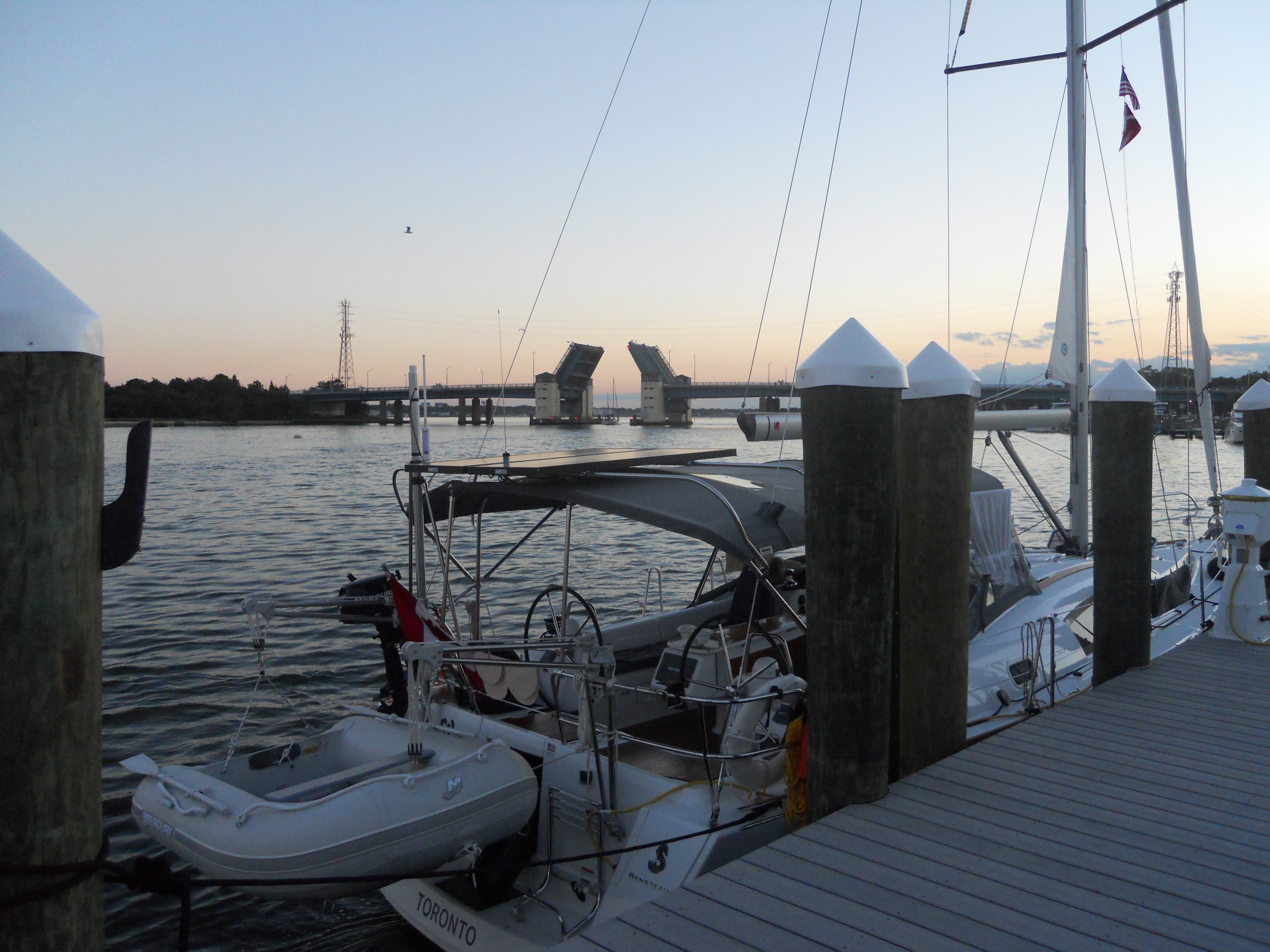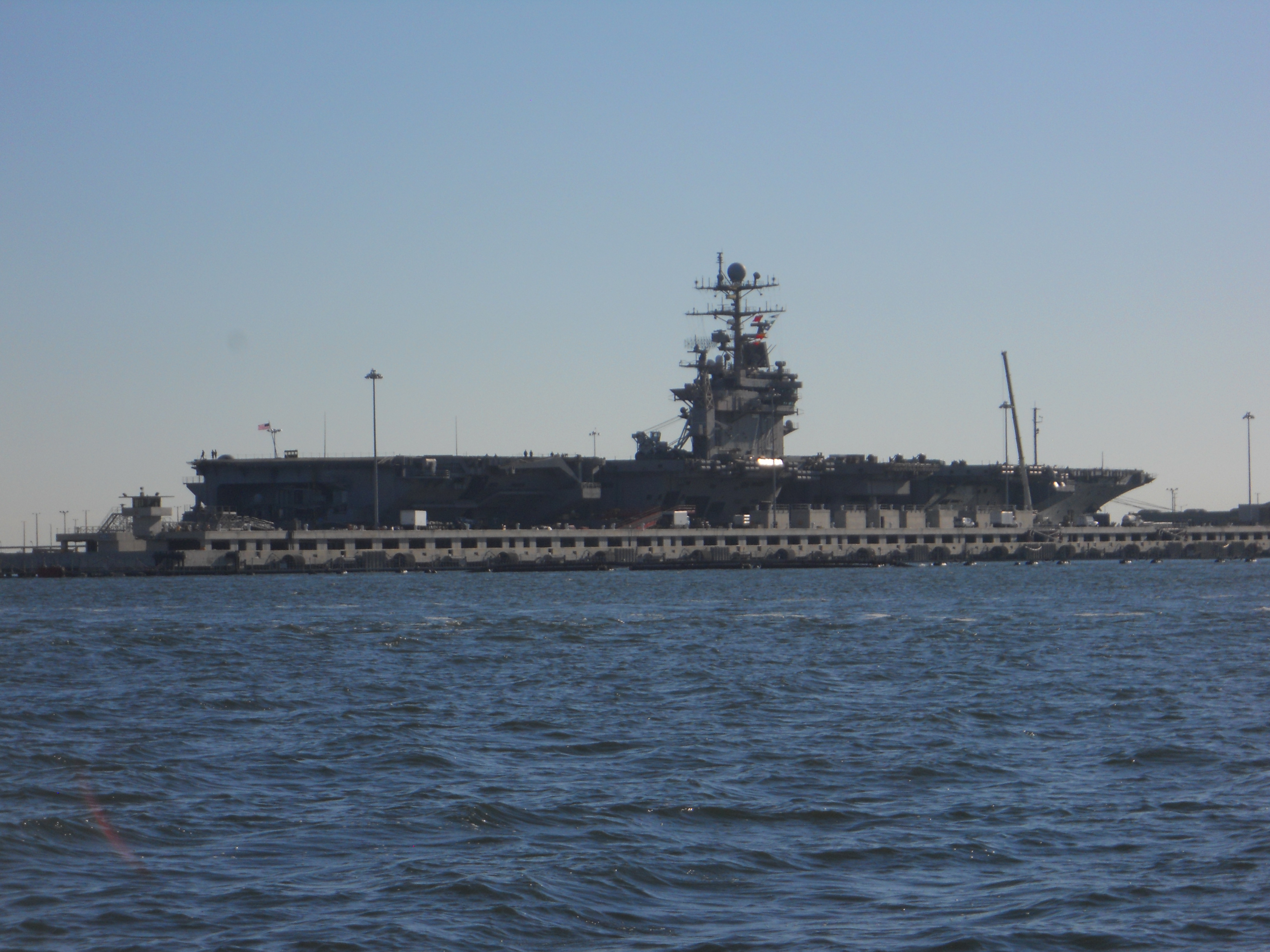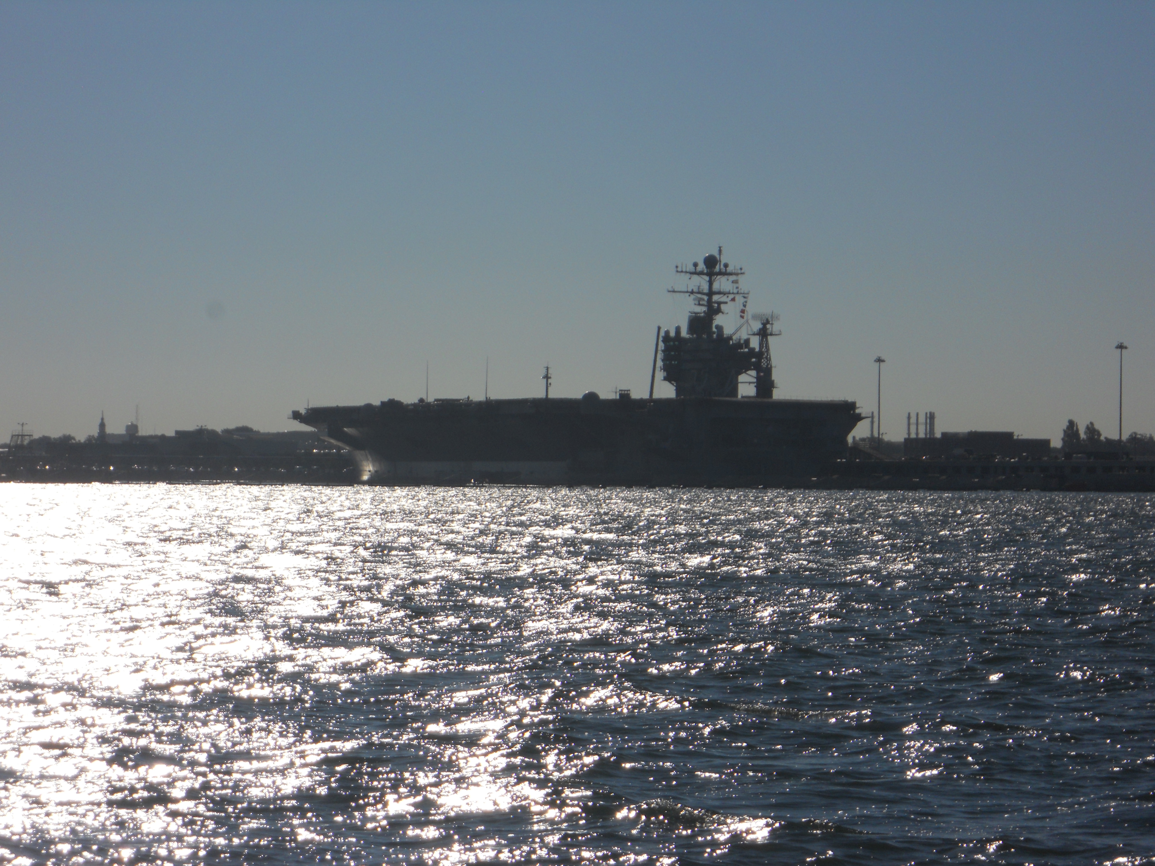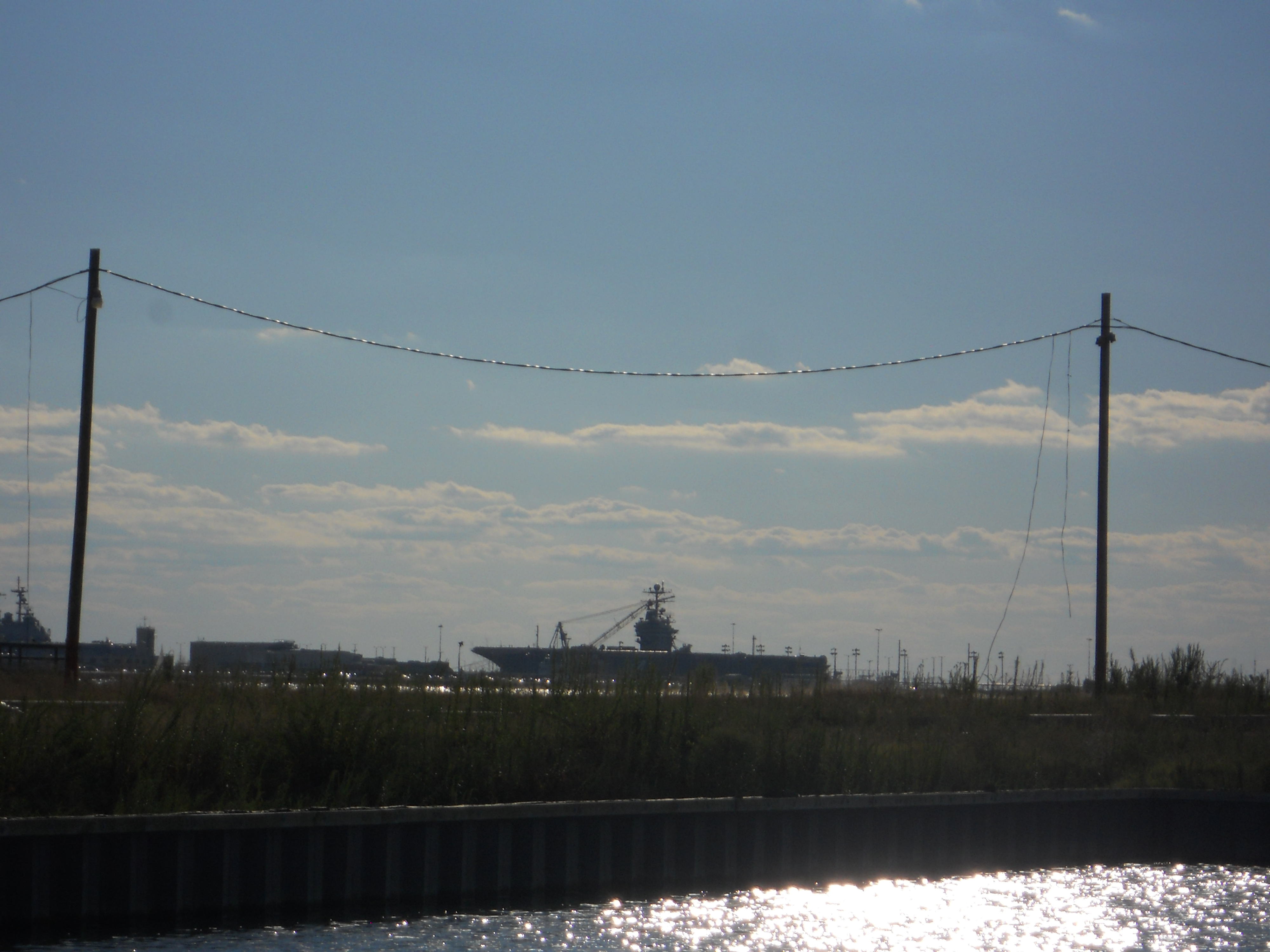 Shortly after seeing the porpoises, the winds die so we motor in to Rebel Marina in Norfolk, VA. The marina is owned by David who had his boat, Condor, parked next to us in Oswego, NY. It is great to see him again. Docked at his marina, we can see the aircraft carriers at the naval base in the distance.
