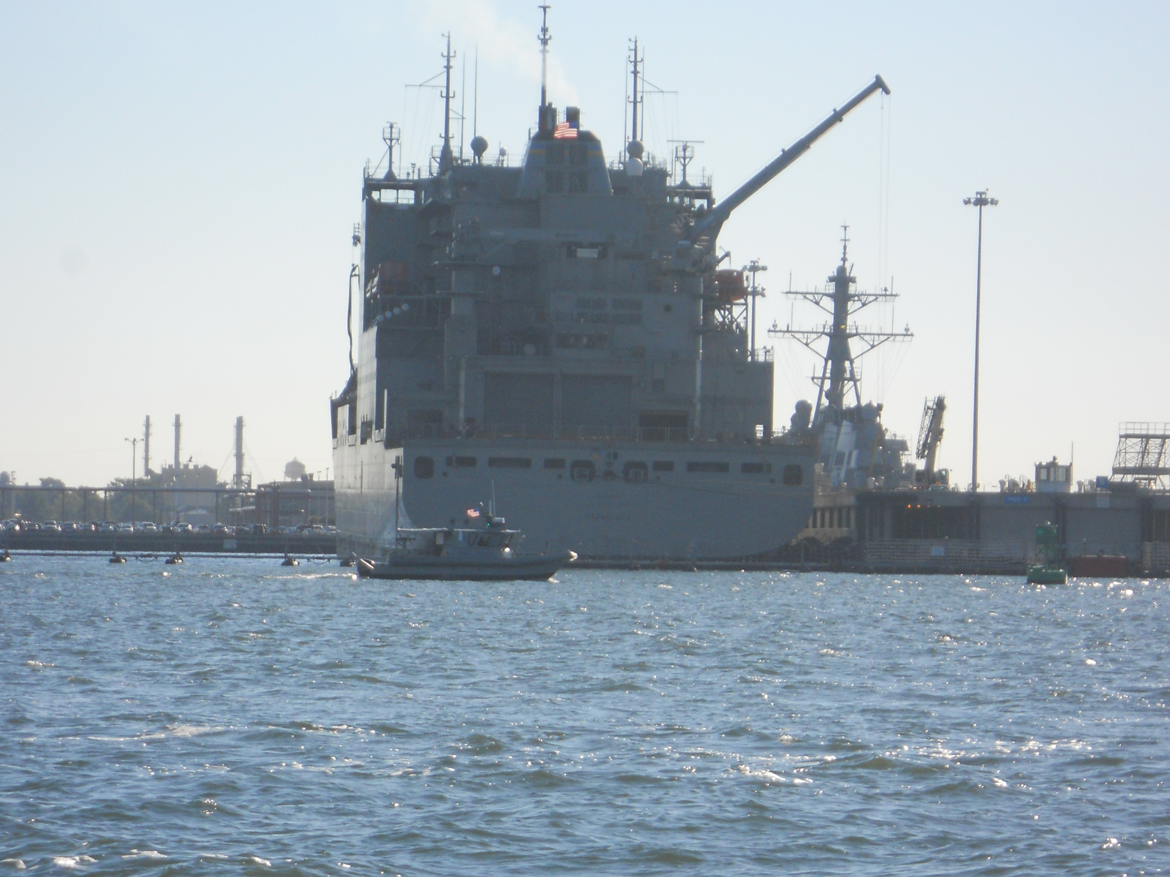 Pulling out of Rebel Marina in Norfolk, we can see the US Naval fleet parked there. In the morning sun, even an aircraft carrier can look nice. They are huge and just amazing to see. As we pass, we notice we have security escort following along side of us just off shore. The boat escorts us until we pass the fleet. Near the naval docks, there is also a huge amount of ship building and support facilities. An incredible amount of activity.
