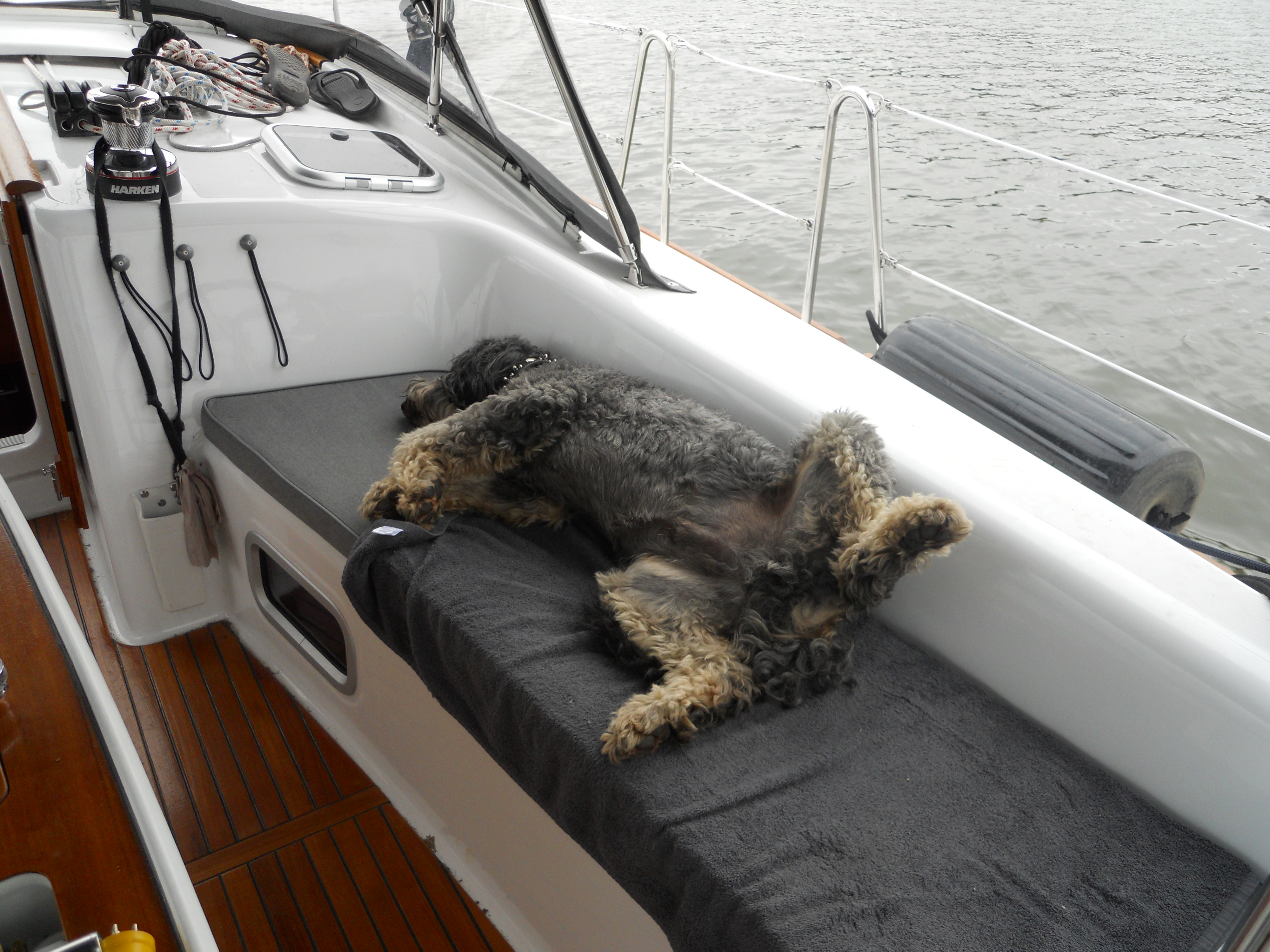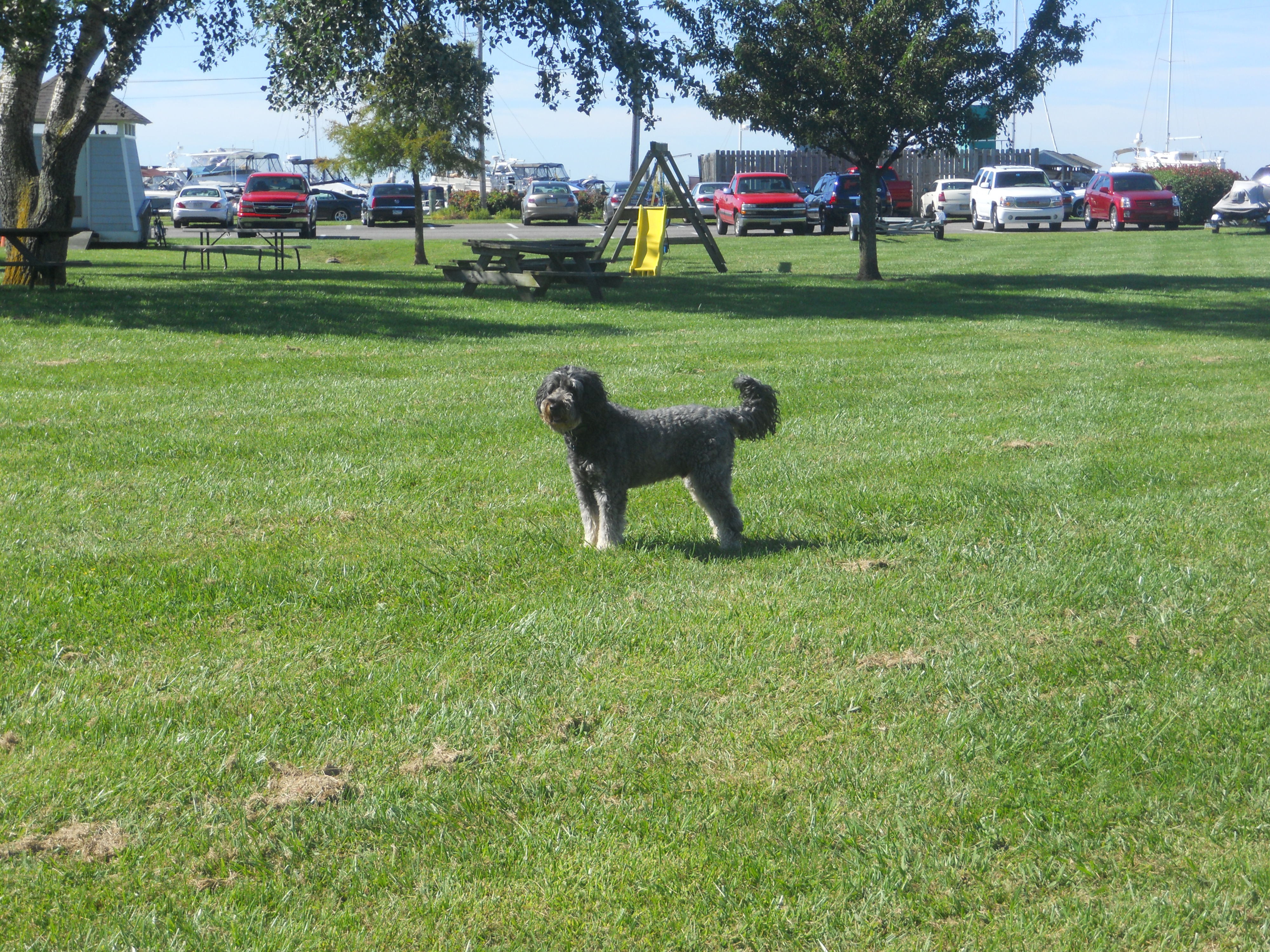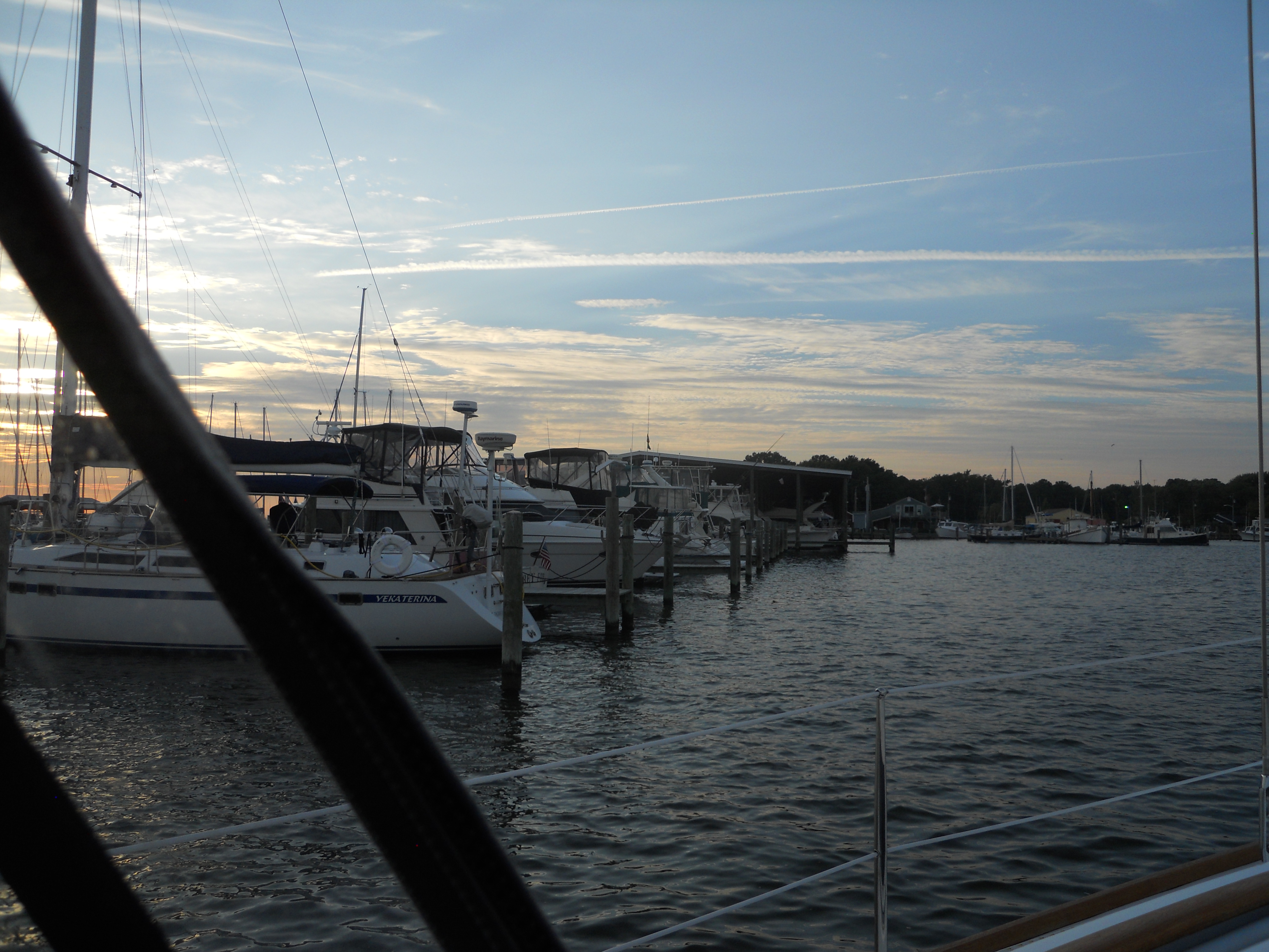 The marina in Deltaville called Dossier’s is in a very nice rural spot and has a great field for Leo to run. We BBQ and eat outside on the boat with a beautiful sunset.