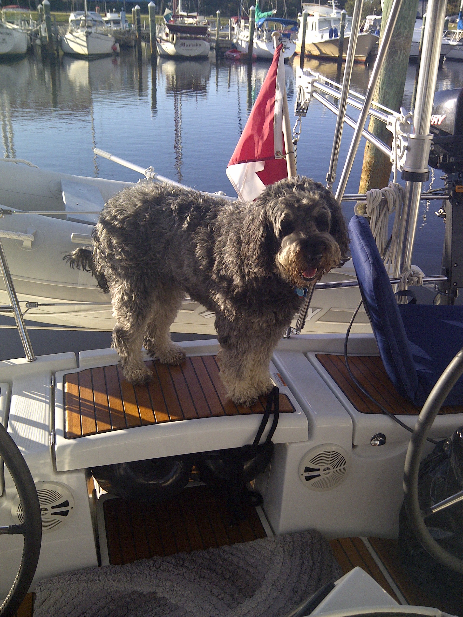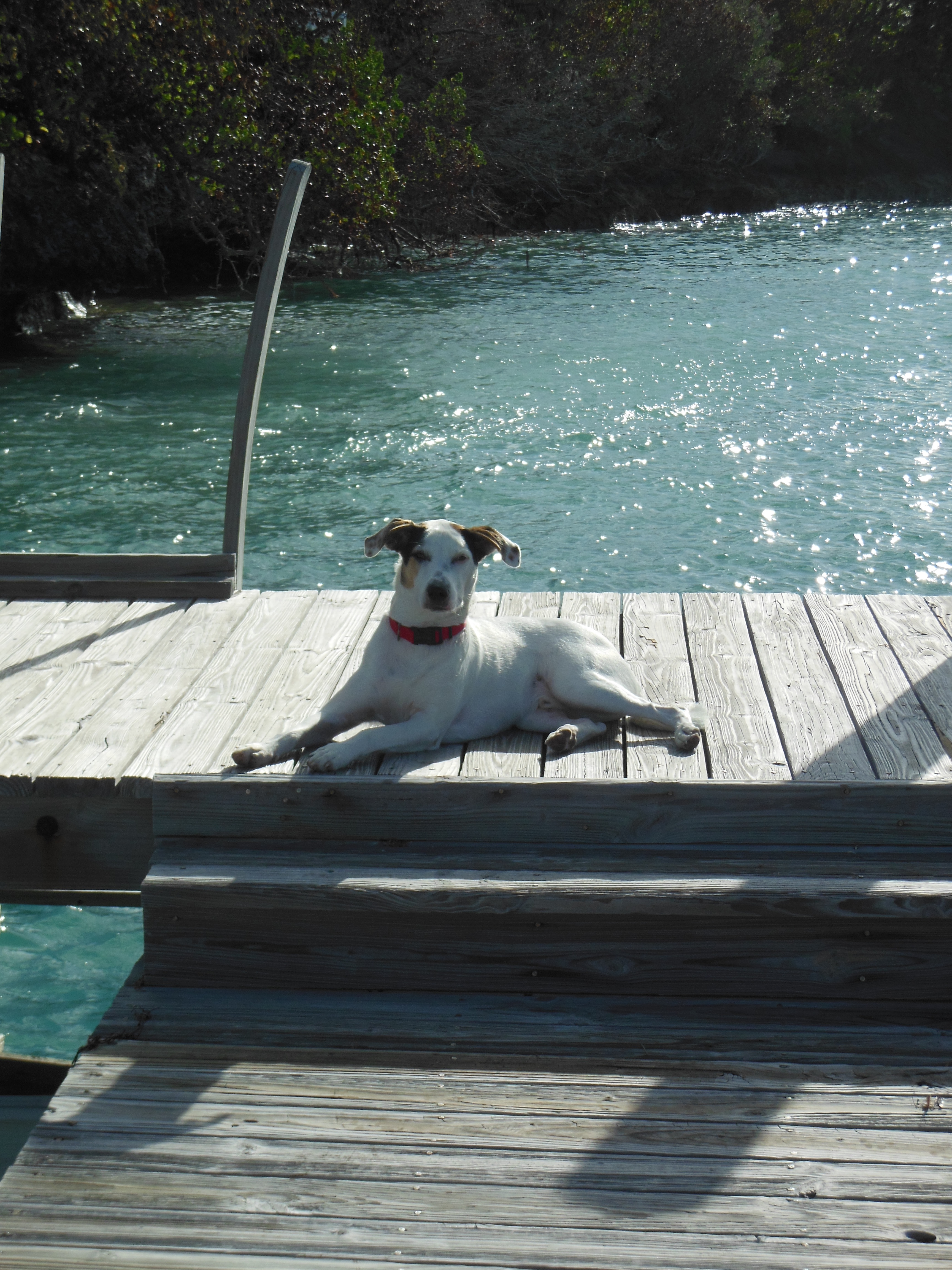 Leo playing with his new friend, Hurricane (named because he was rescued as a puppy out of the water of hurricane Irene last year), at the marina in Spanish Cay