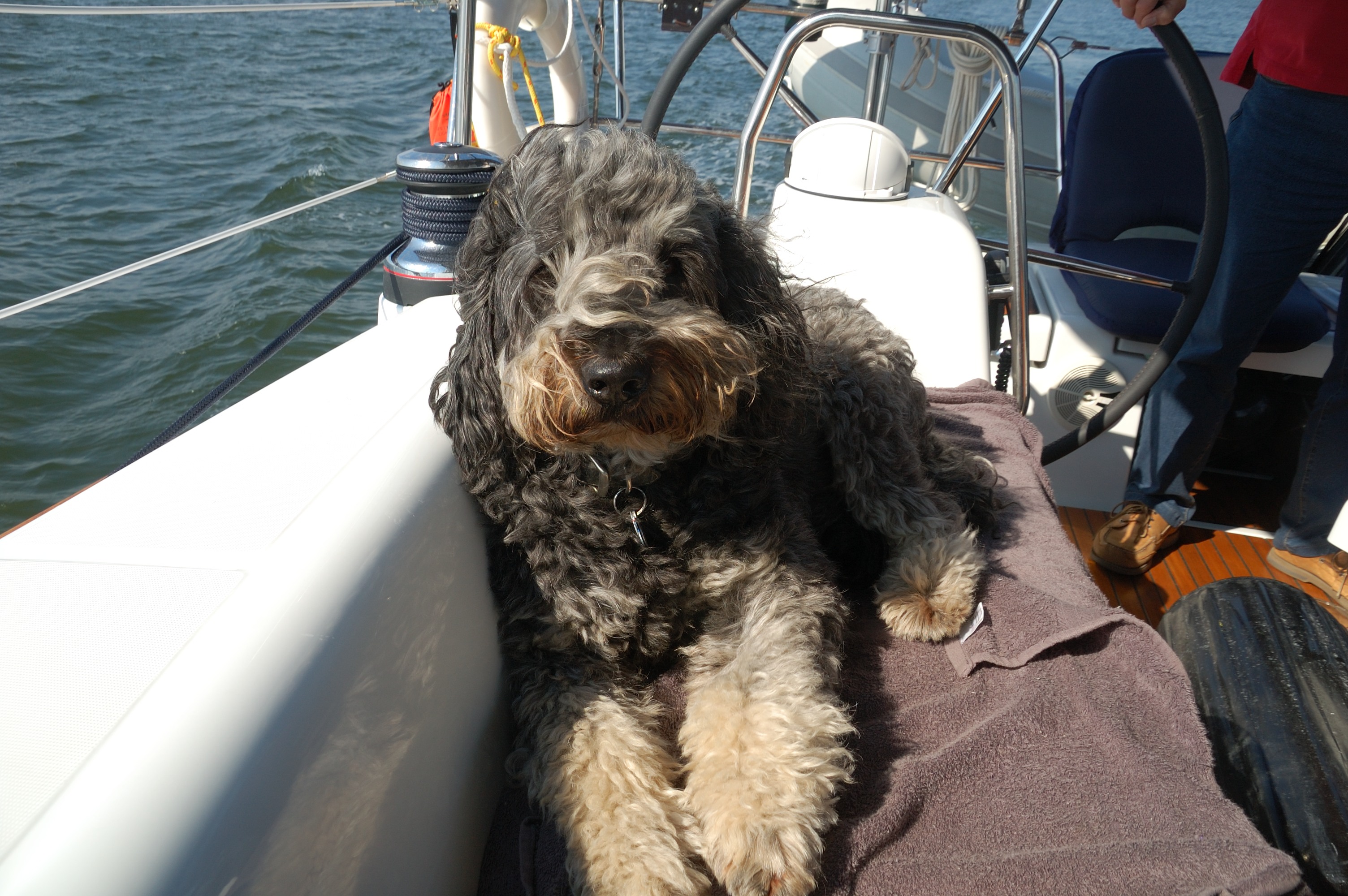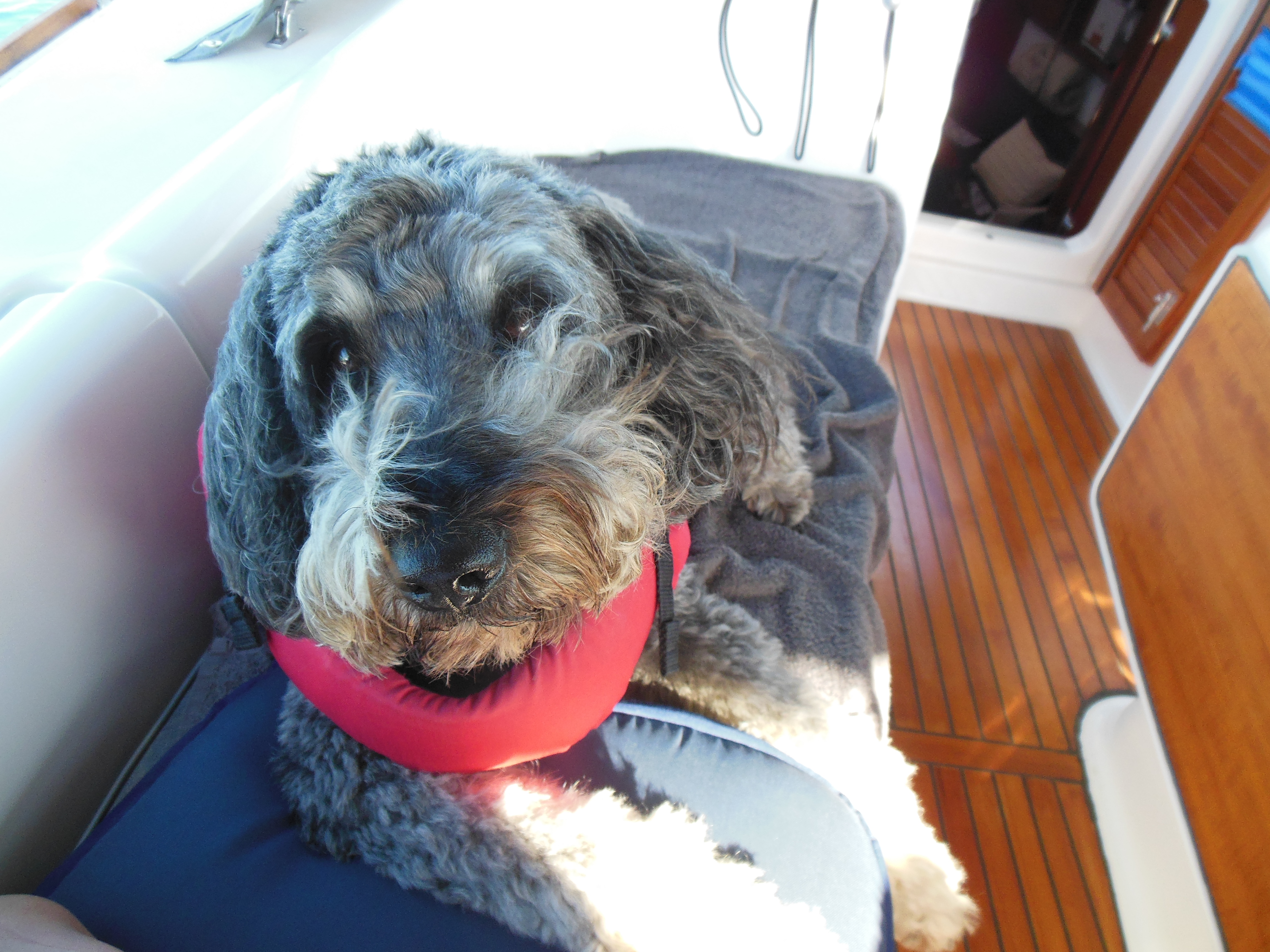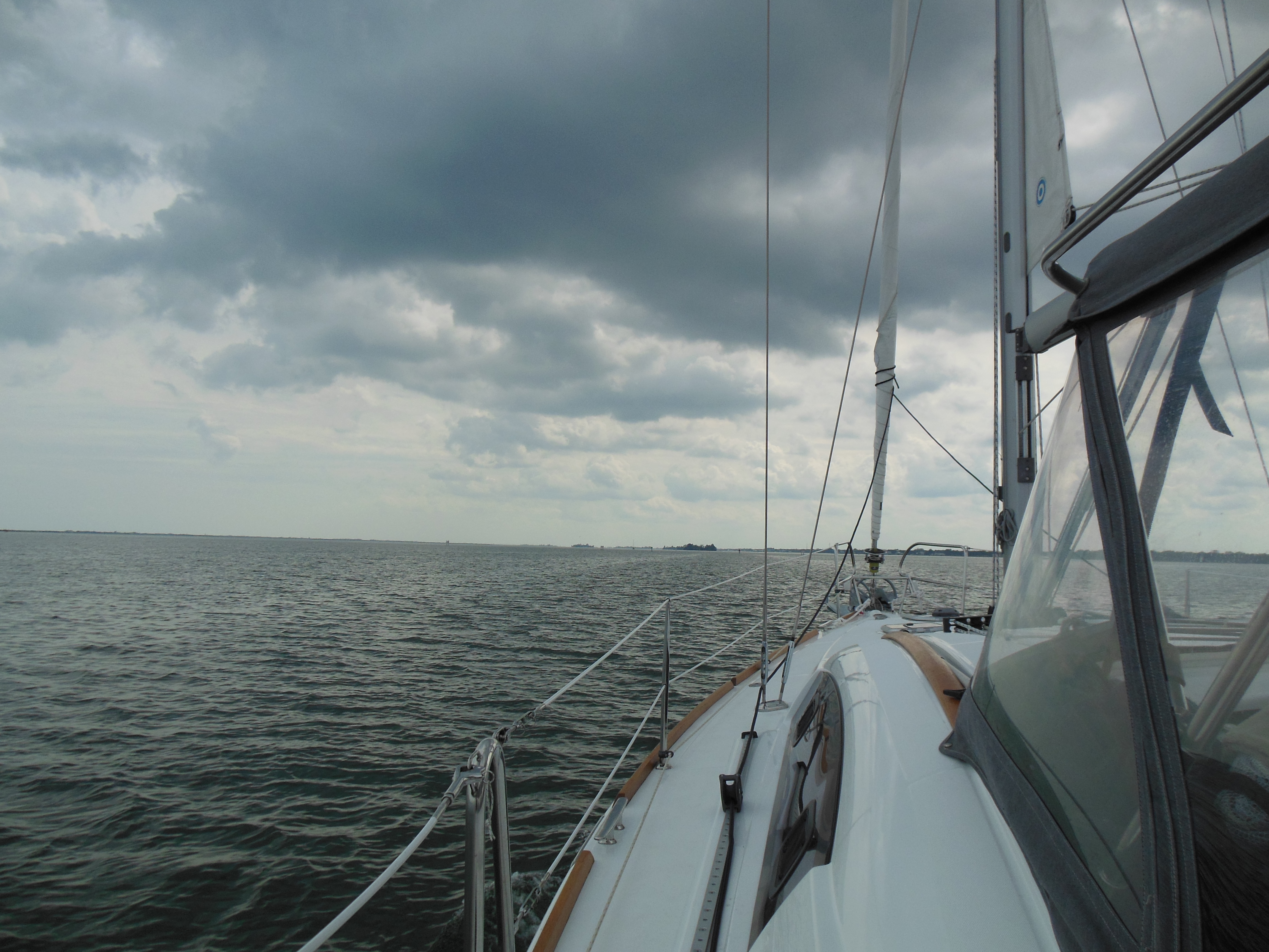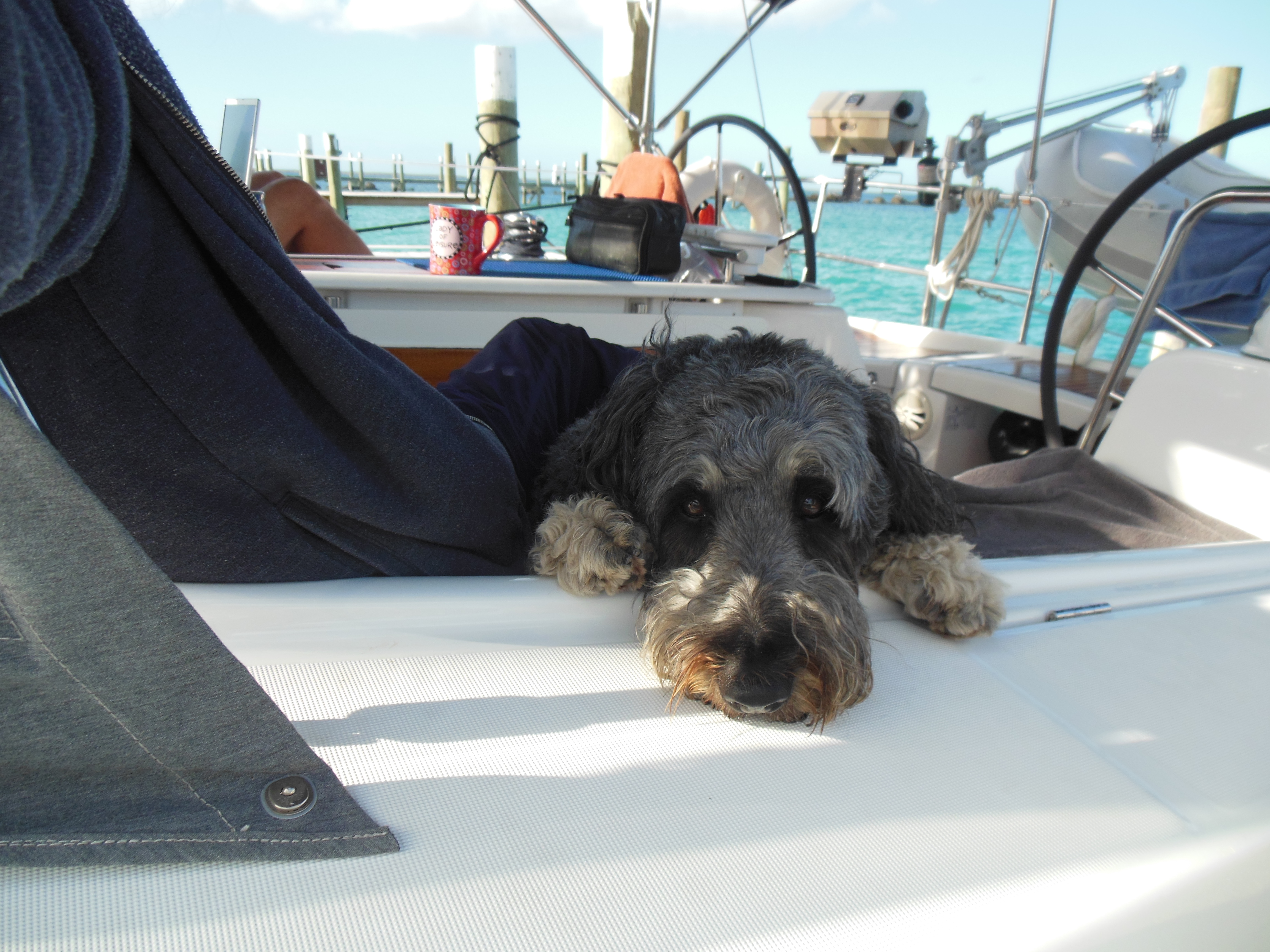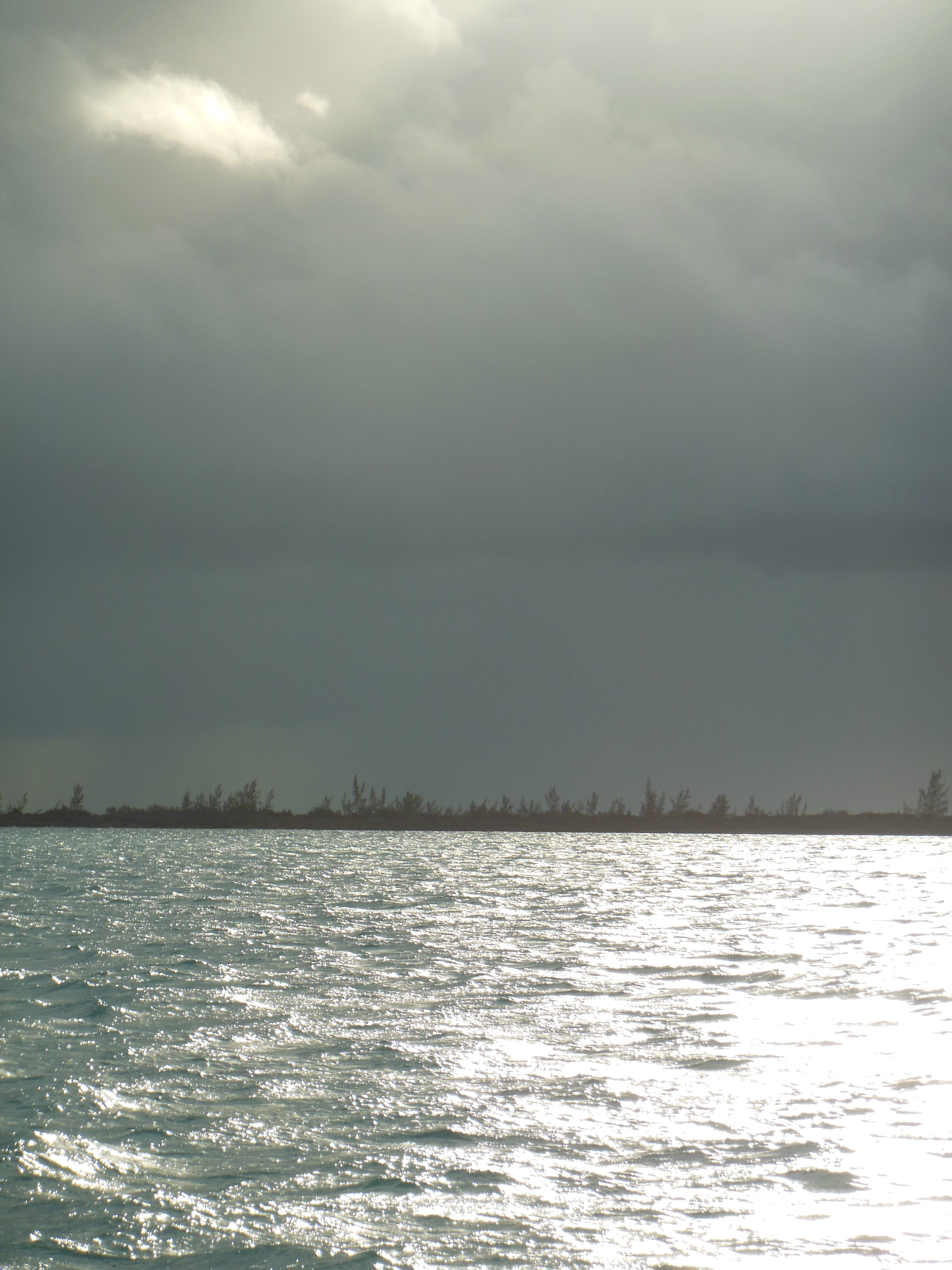 When we leave Great Sale Cay for Spanish Cay, it has stopped raining, but we can see the storms all around us. ‘Promises Kept’ have decided to stay for a few more days, so we head out on our own. At one point along the way, while Lee is below in the washroom, the wind and rain hit us full strength and it is pouring sideways into the cockpit. When she comes back up, it is a monsoon. We are soaked. Leo is disgusted. By the time we hit Spanish Cay, it has stopped raining but everything on the boat seems to be wet from rain and the waves.