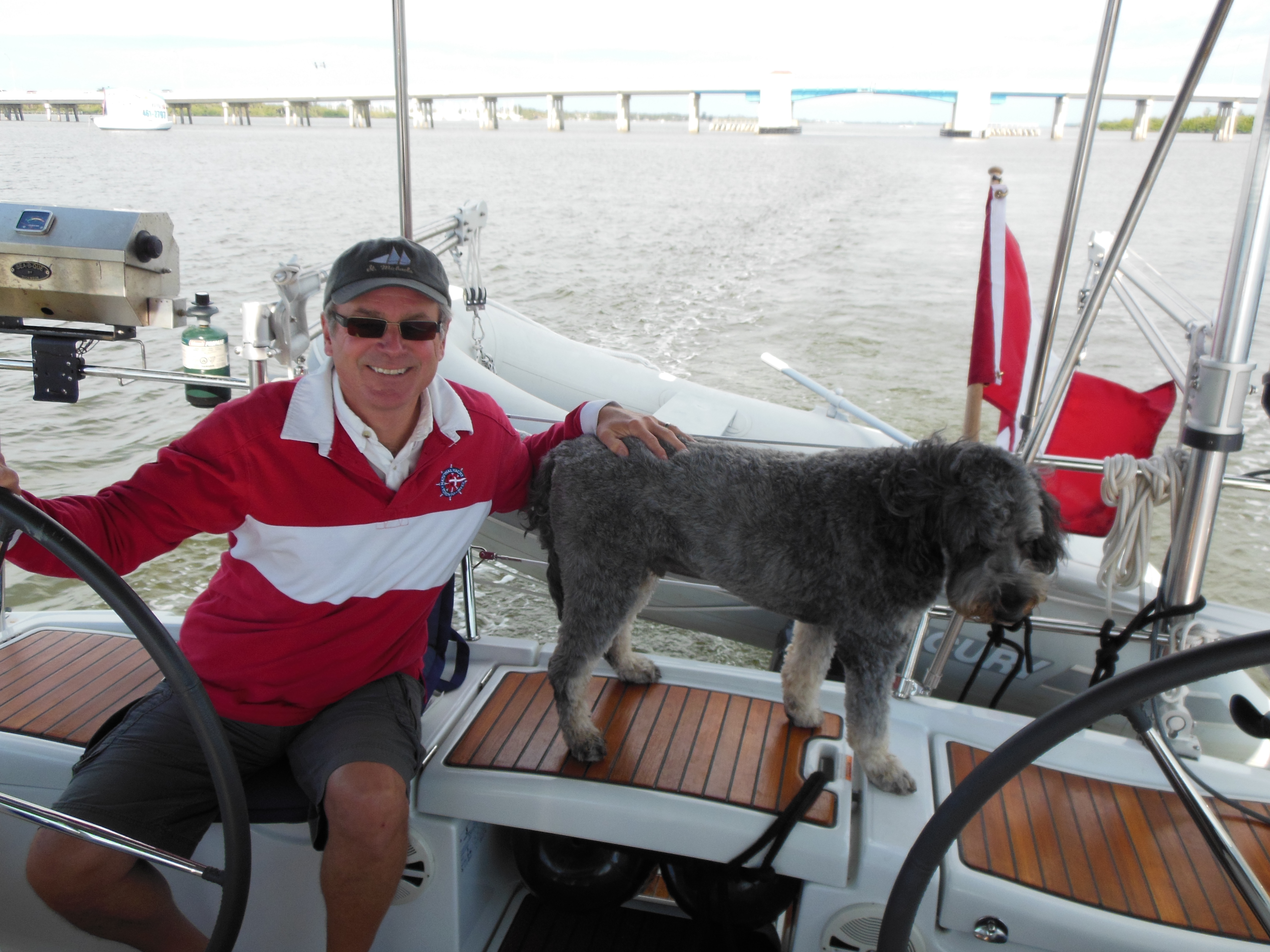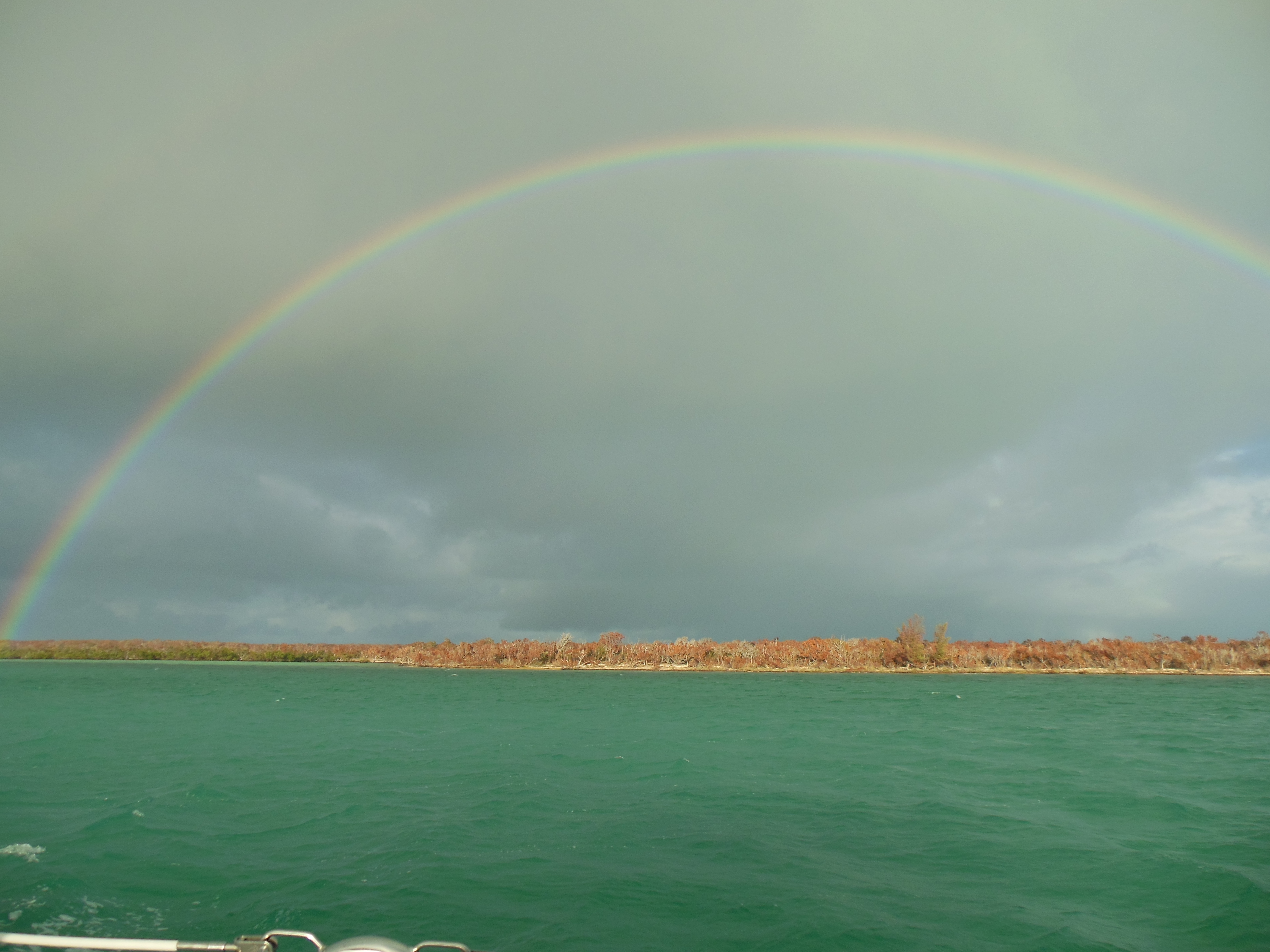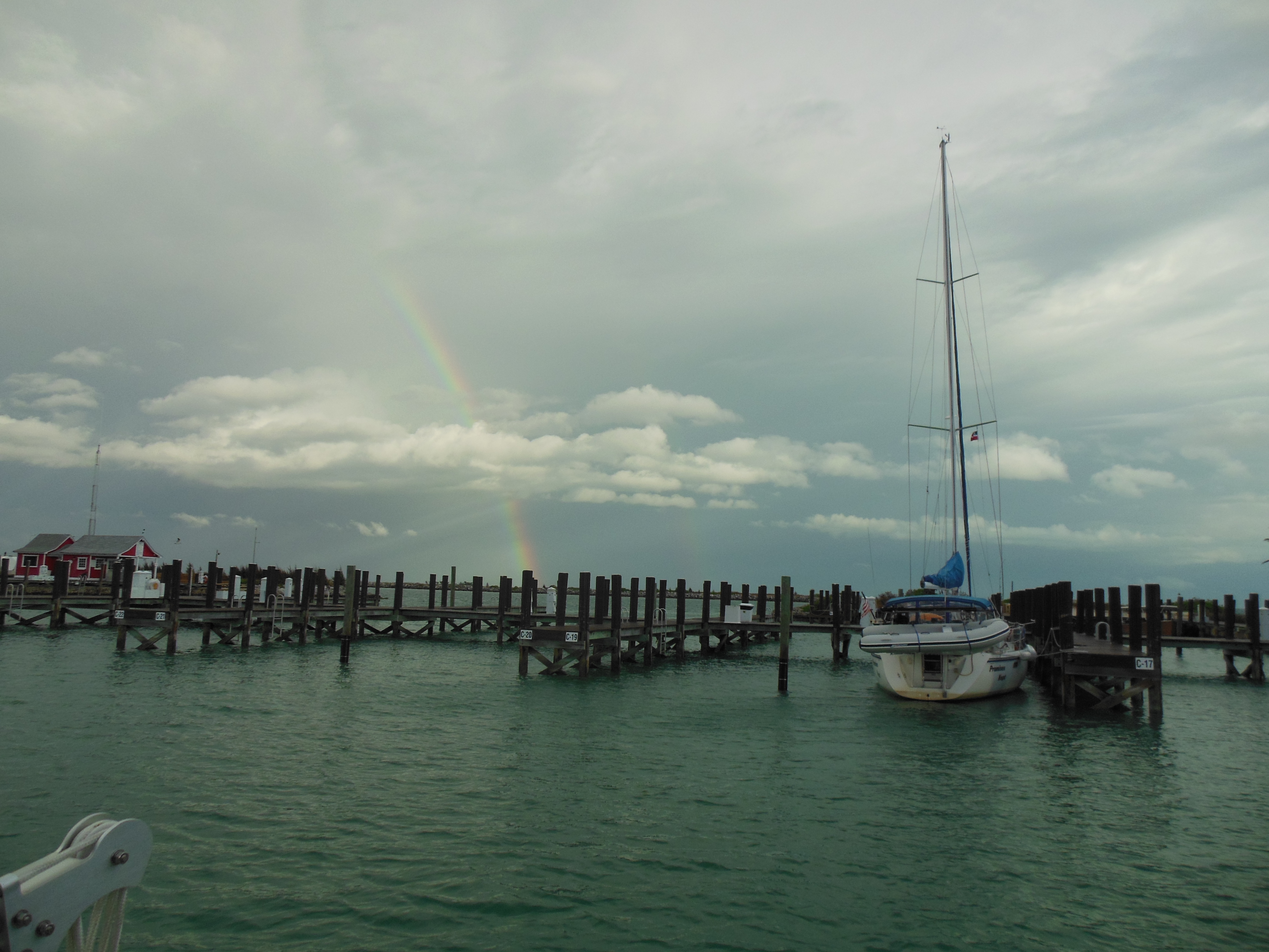 Saturday starts off with pouring rain, but clears by late morning with a spectacular rainbow. Since being in the Bahamas, we have seen many rainbows. An indication of the unsettled weather we have been having, unfortunately. But it turns out later to be a lovely day, so we enjoy Mimosa on the deck. Later we have cocktails with our friends Debbie and Dennis (with daughters, Tara and Tesse, and dog, Eli) on their boat ‘Promises Kept.’ We agree to depart together the next day and sail to Great Sale Cay.