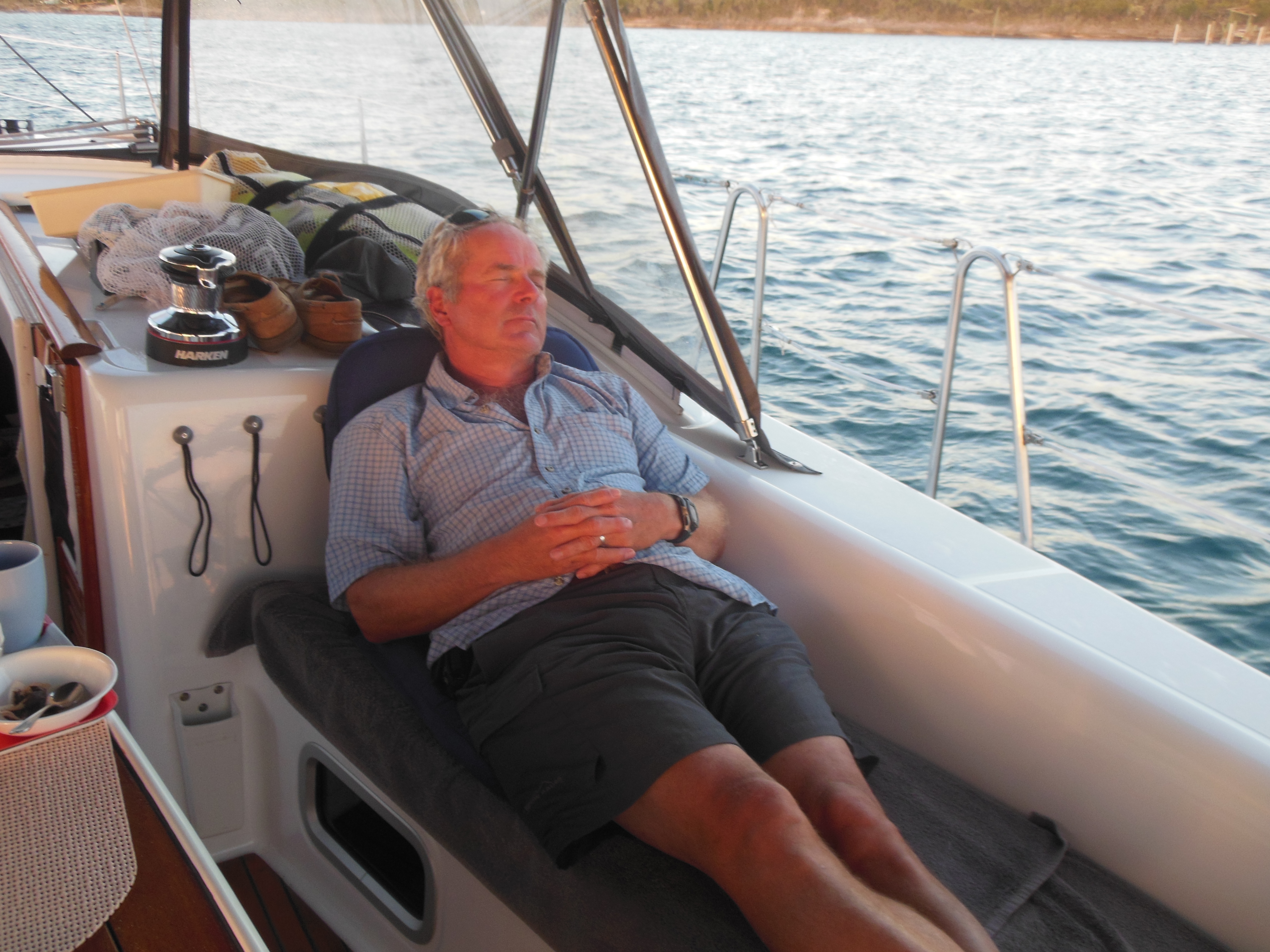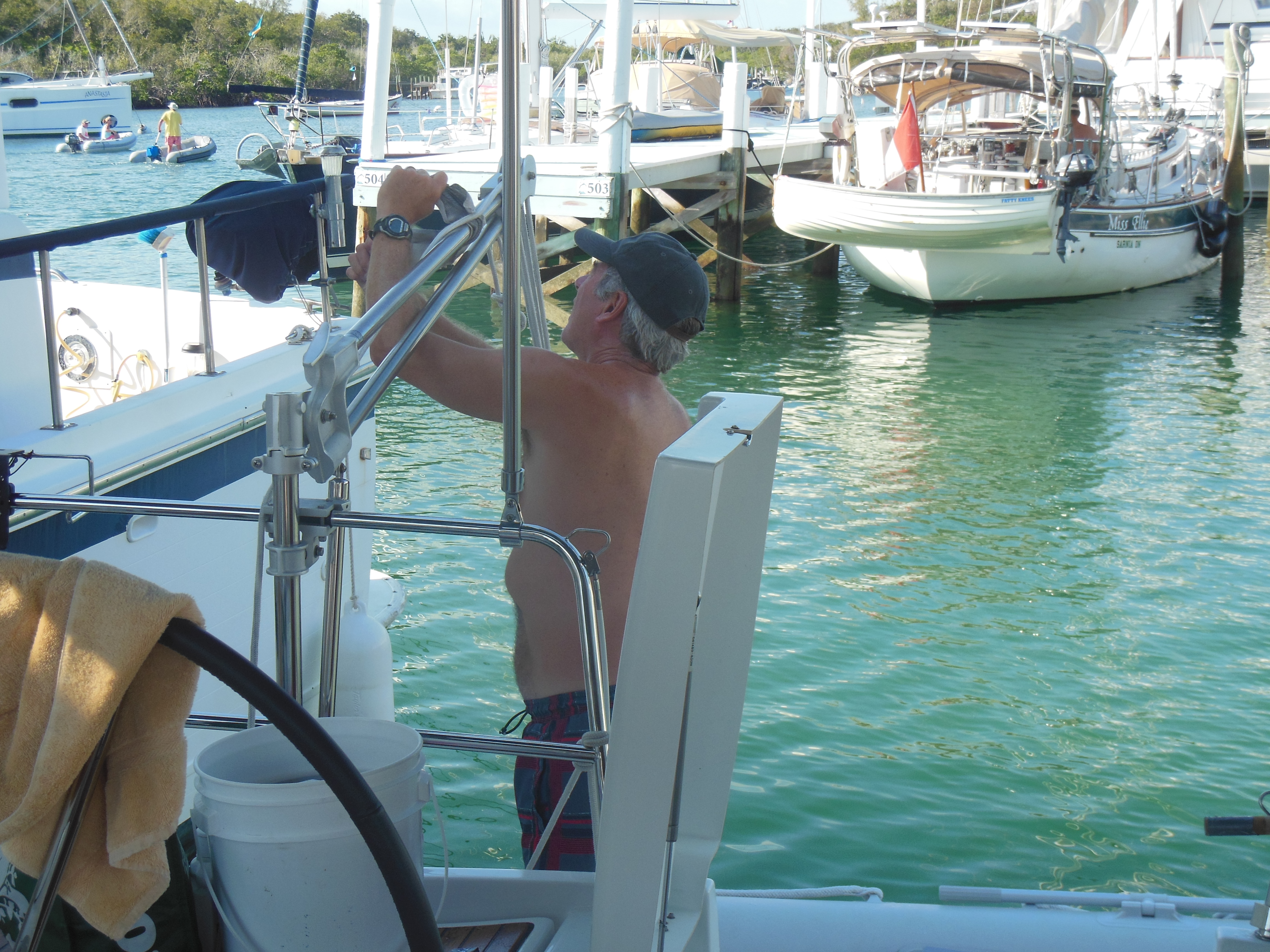 Randy keeping busy doing chores and polishing the metal on the boat while we wait for the weather to settle