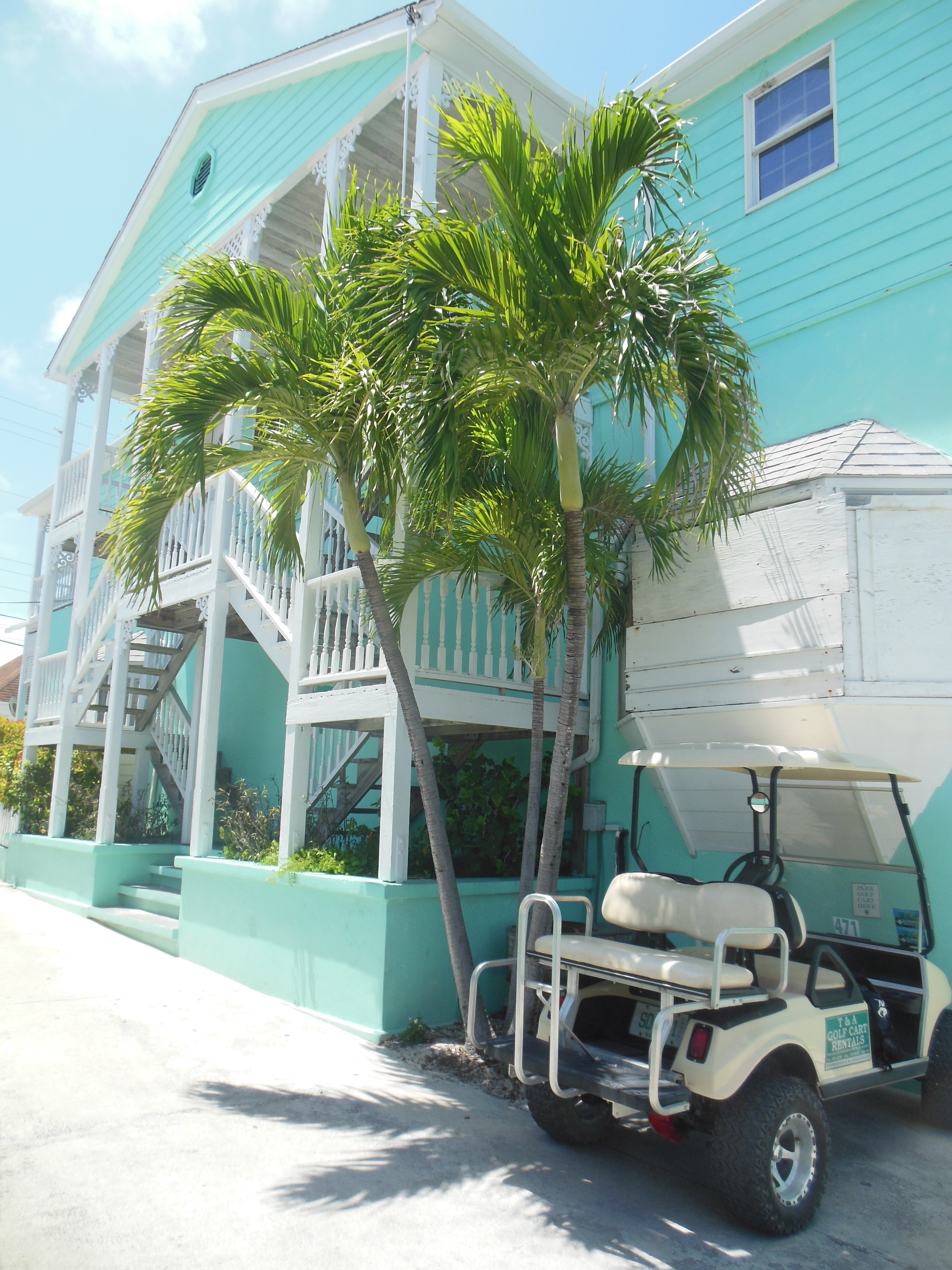 The apartment in New Plymouth (with rental golf cart) where we stay while preparing the boat for storage