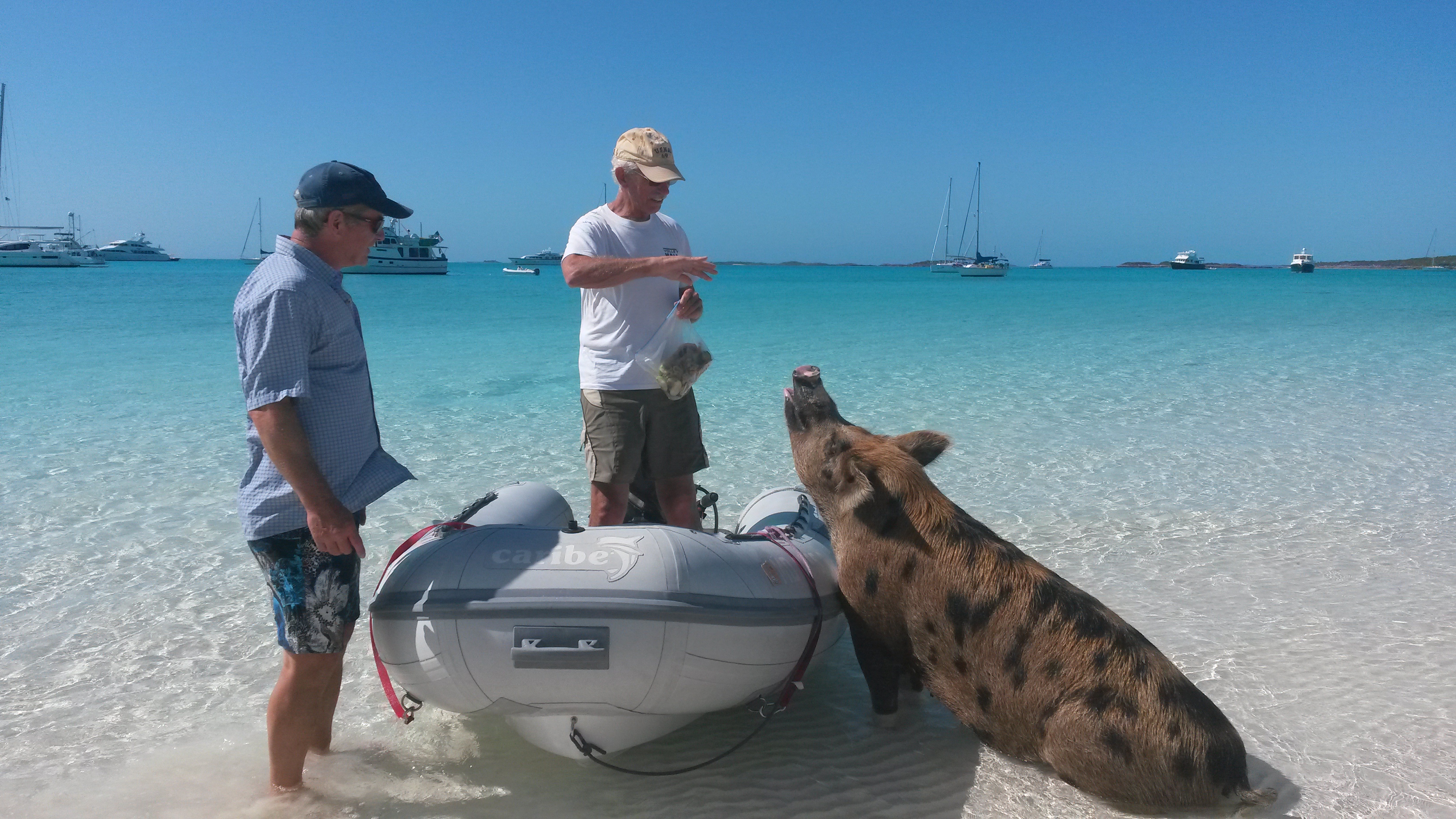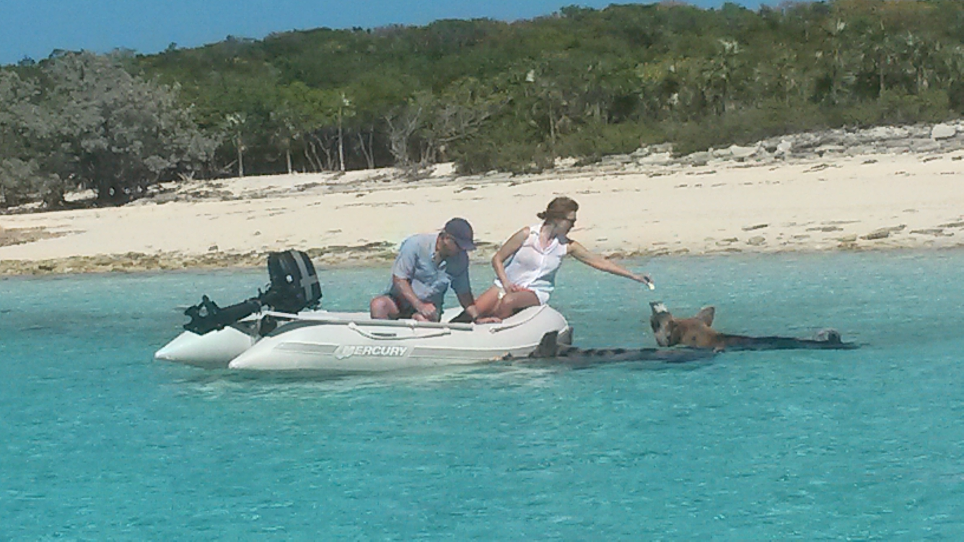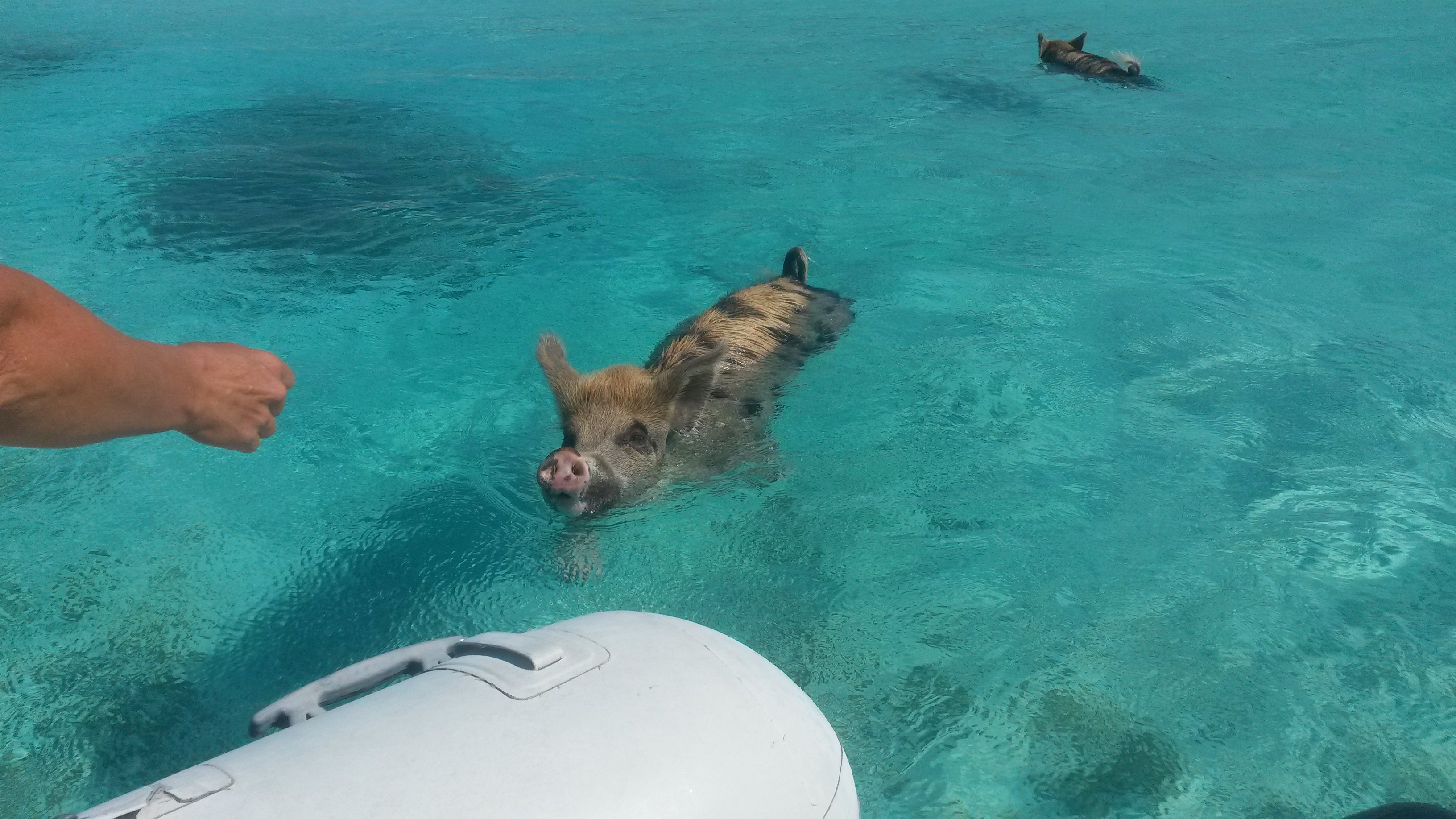 Pigs swimming to greet us and get fed at Big Majors Spot