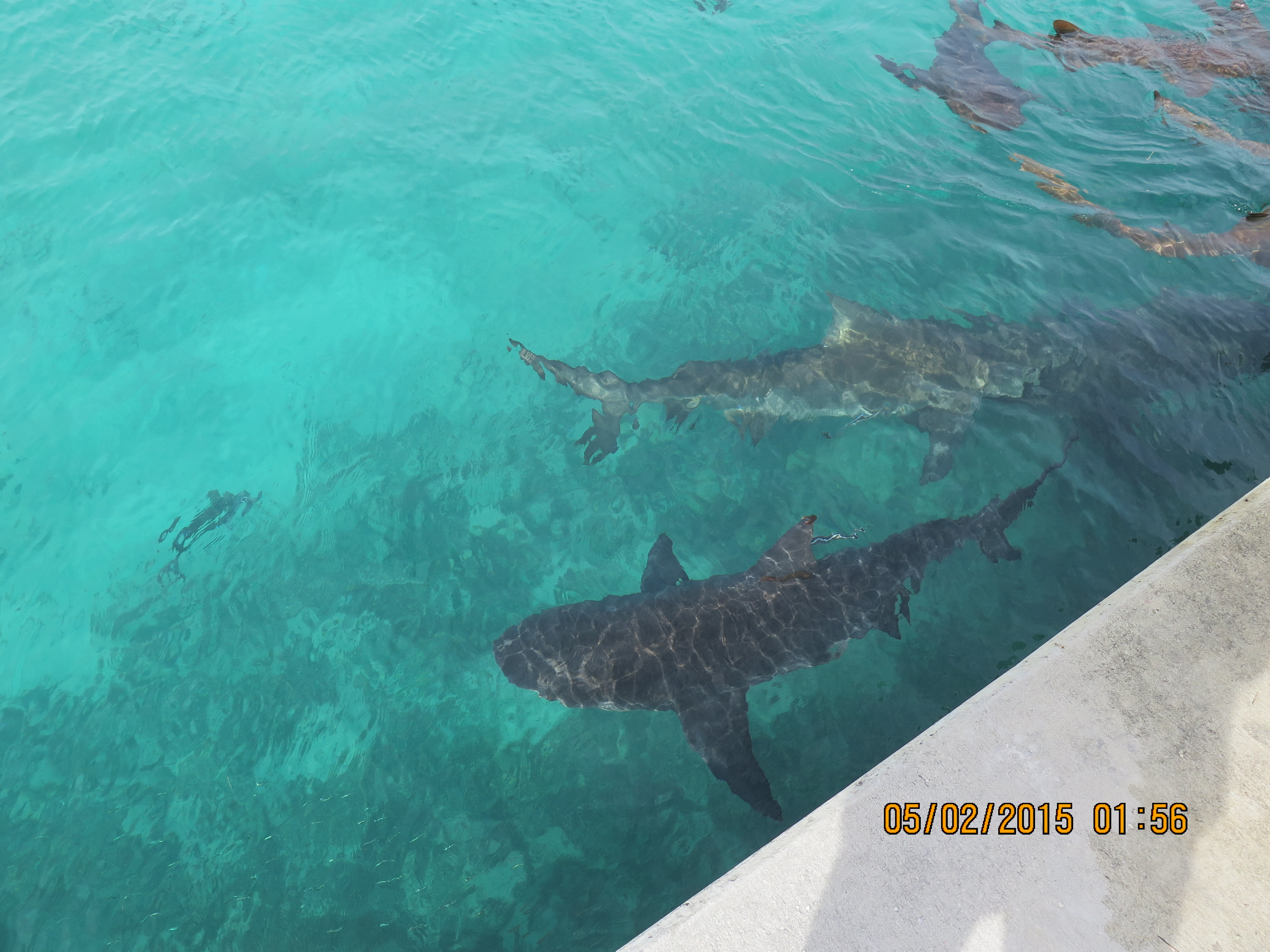 Sharks gather in front of where he is cleaning fish to catch what he throws in. These are bull sharks and not the ‘friendly’ sharks we’ve seen at other places