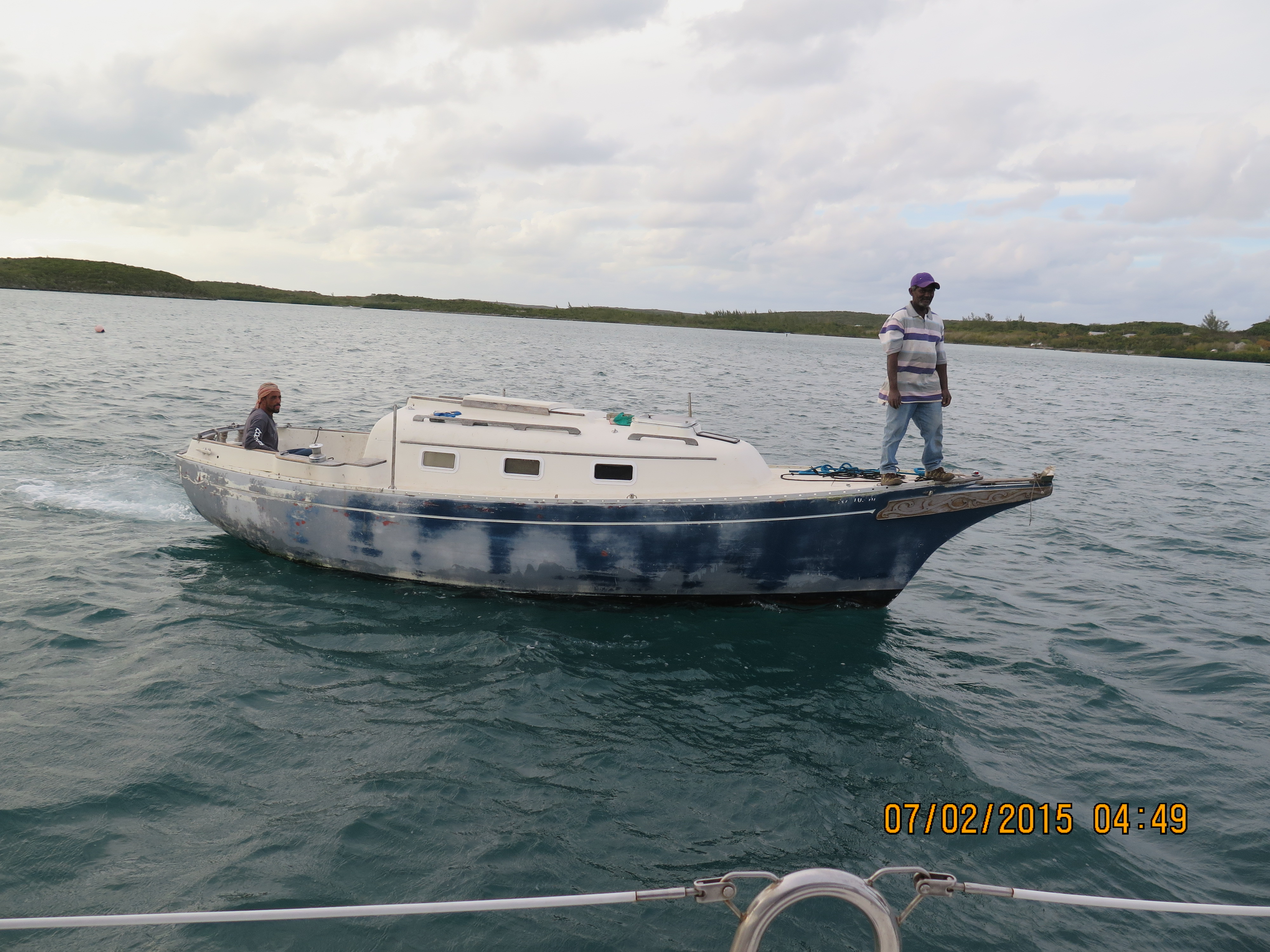 Francis (who we met last time at Hatchet Bay) with his friend, come out to greet us and collect the mooring fee
