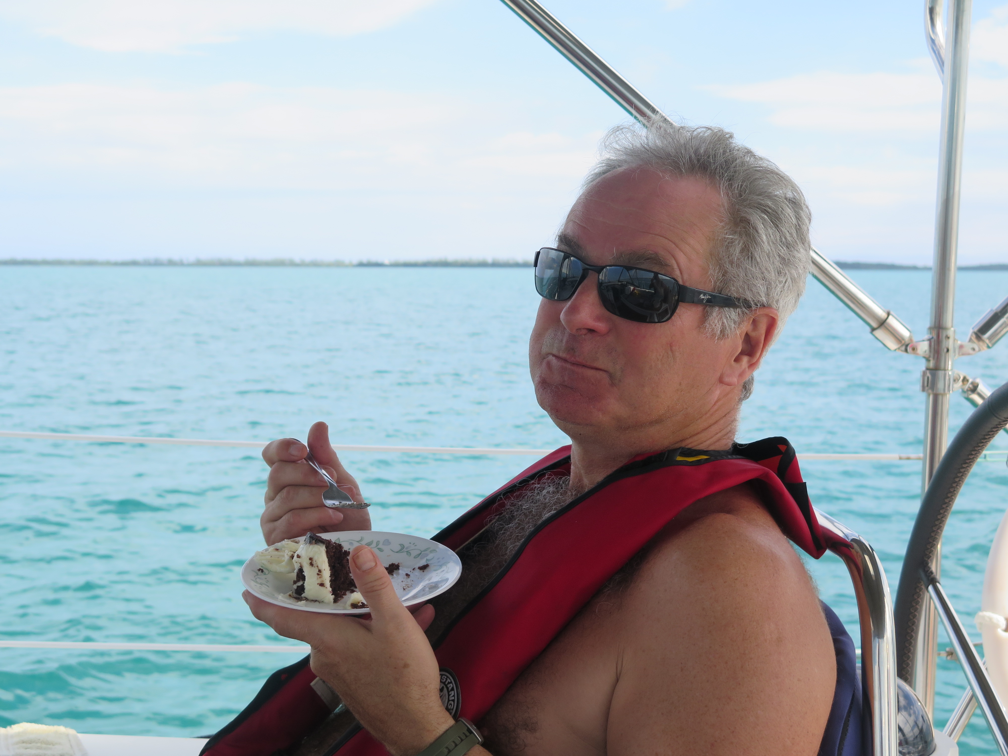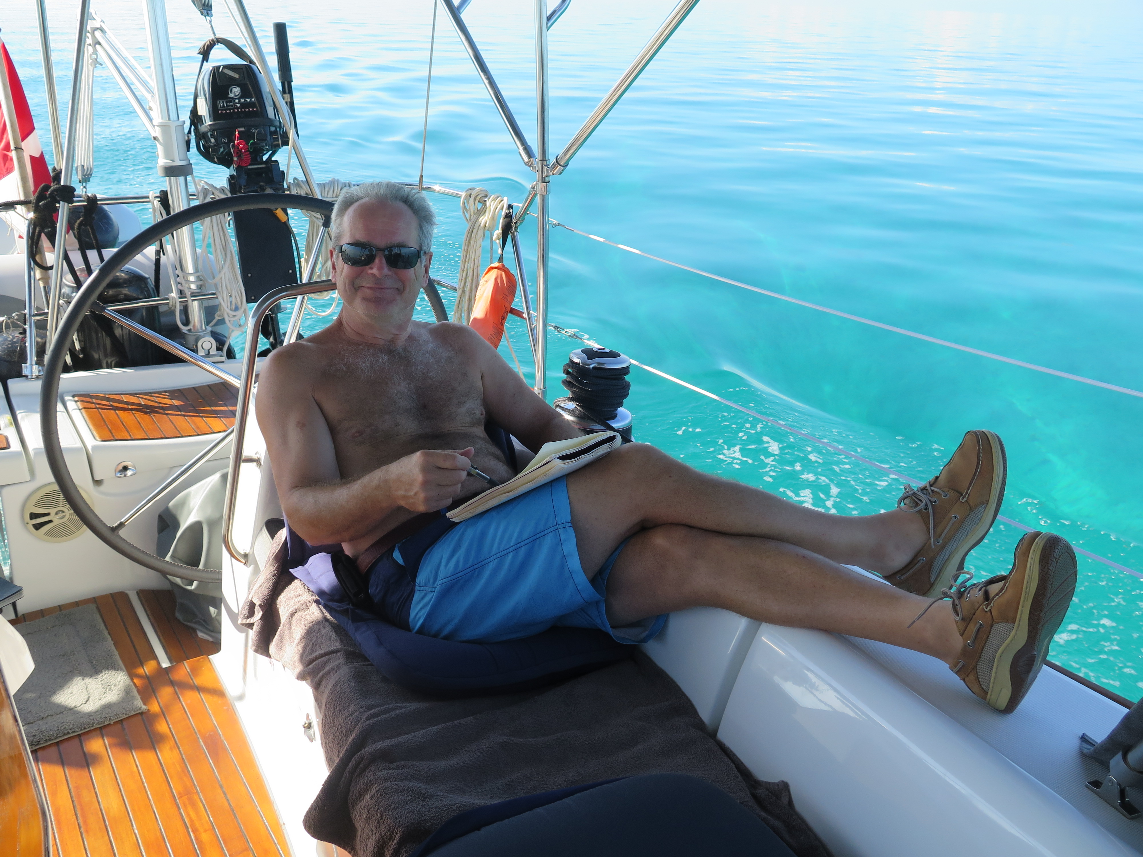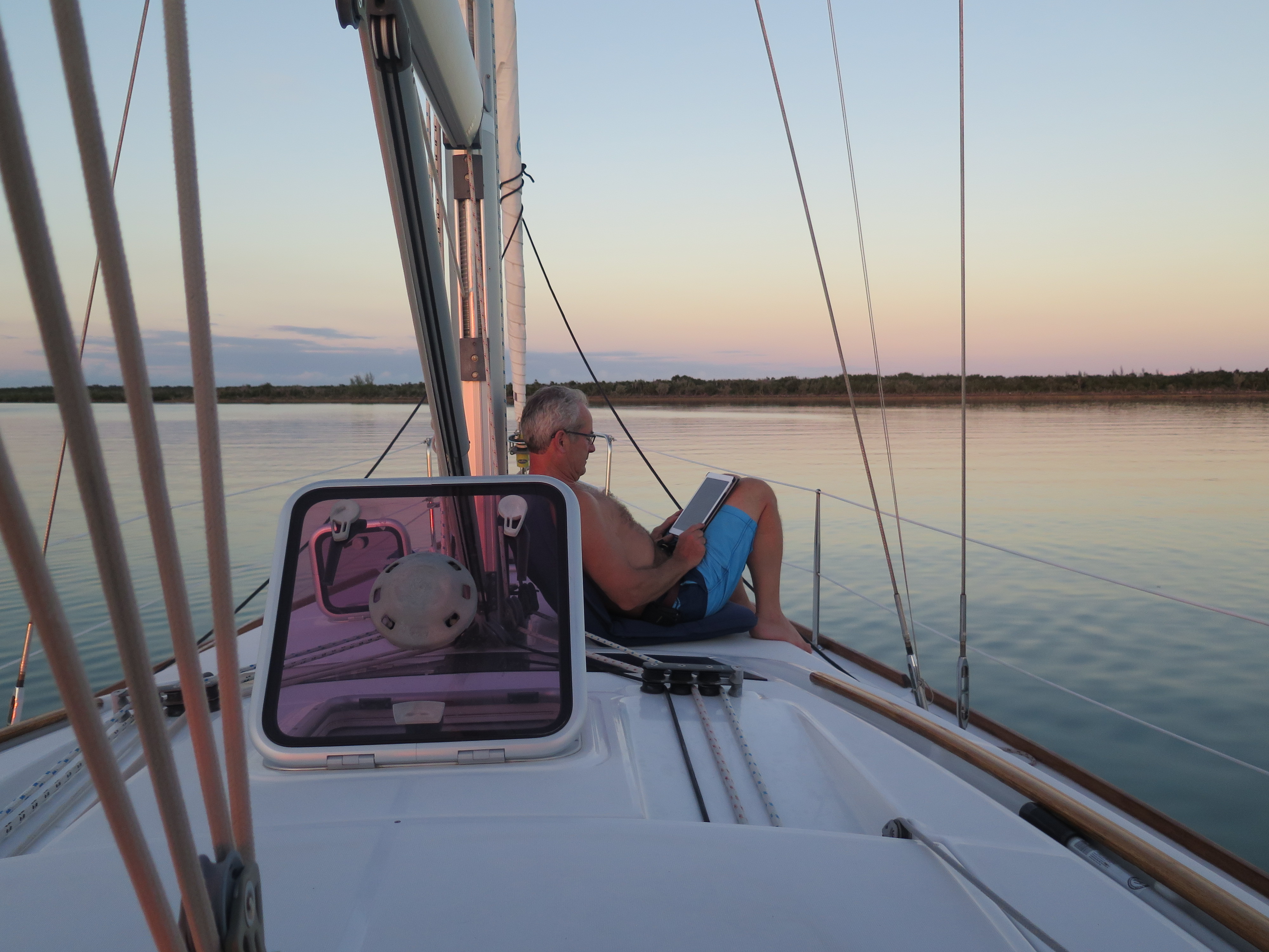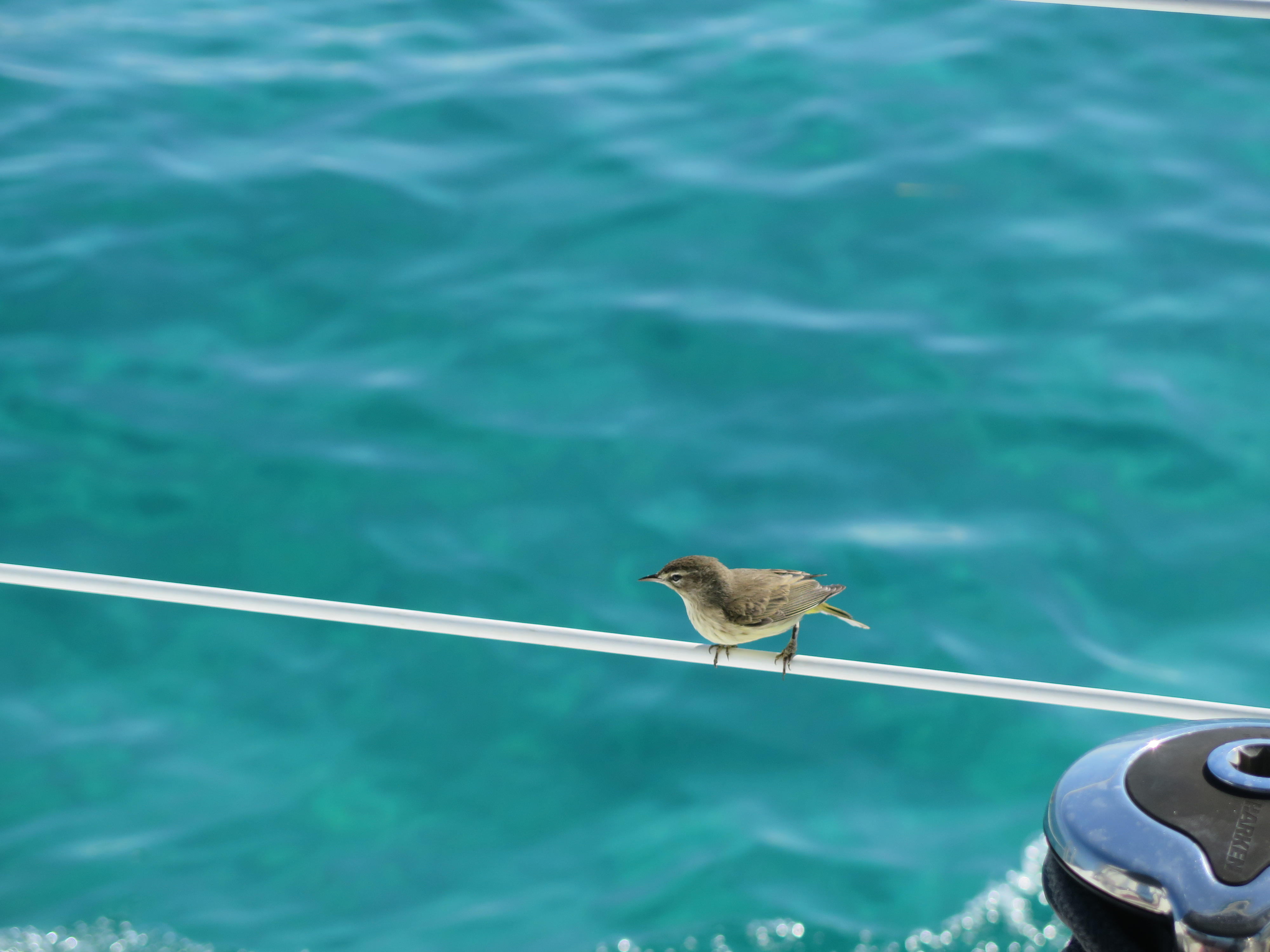The next morning, we head for Great Sale Cay. Greta and Jay help us cast off. They are heading south towards Freeport and Nassau. It’s another hot day, but not as bad as it has been. We pick up a bird hitch-hiker who rides with us for a while. After 9 hours, we settle in and anchor at Great Sale Cay for the night.